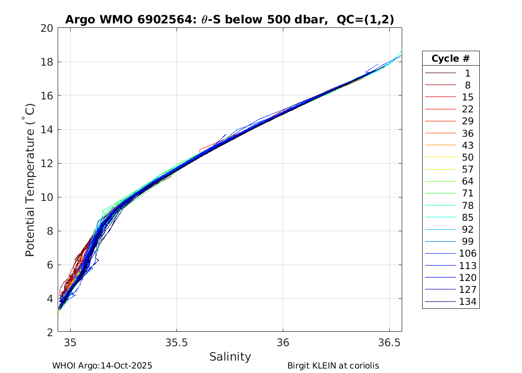 | WMO: #6902564 DAC: coriolis PI: Birgit KLEIN APEX: #7178 DRUCK_2900PSIA: #3797252 SBE41: #6582 Altimeter Comparison (IFREMER) EuroArgo Link | ![]() |