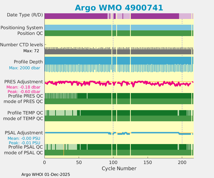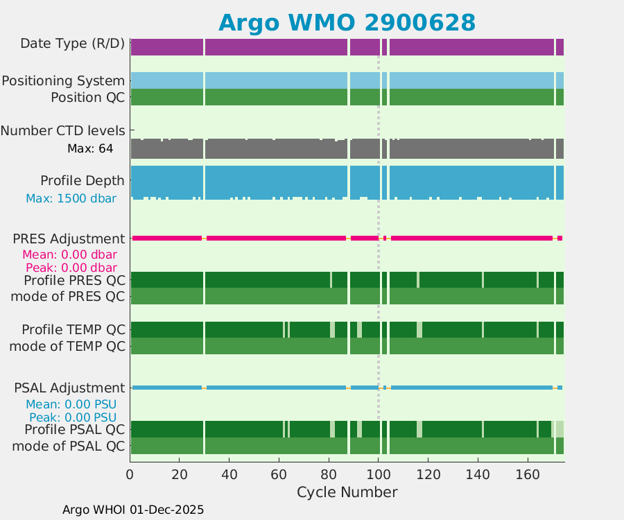 | WMO: #5901339 DAC: aoml PI: STEPHEN RISER APEX: #2625 SBE41: #2649 DRUCK_2900PSIA: #9392 AANDERAA_OPTODE_3830: #0686 Altimeter Comparison (IFREMER) EuroArgo Link | ![]() |