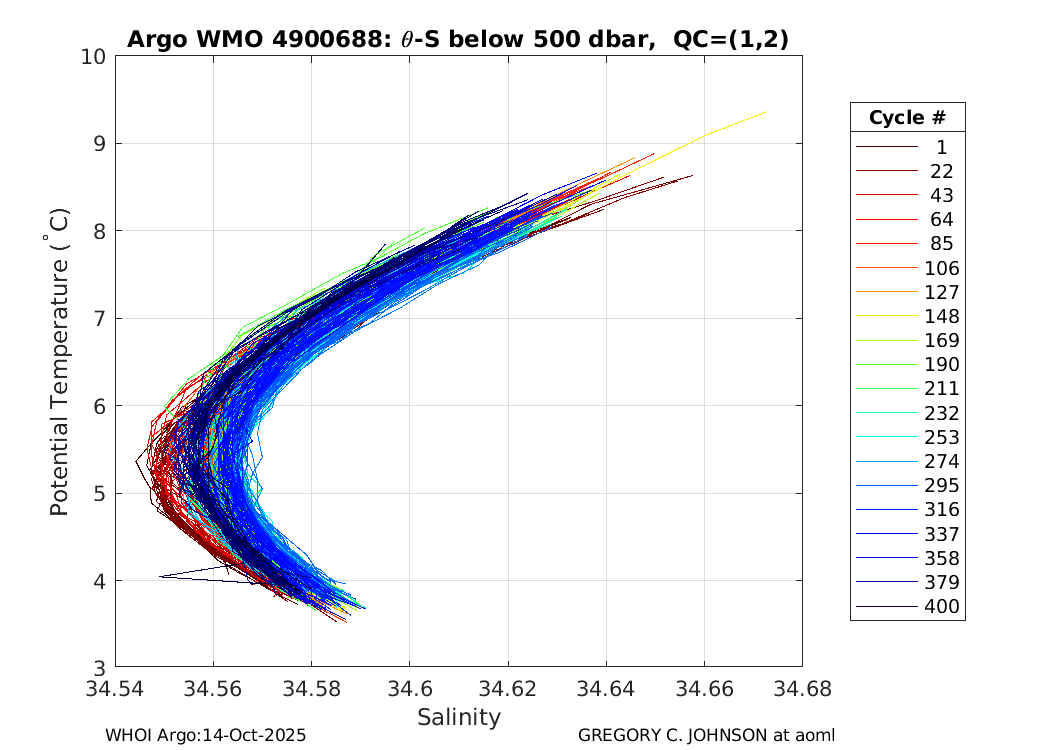 | WMO: #4900688 DAC: aoml PI: GREGORY C. JOHNSON APEX: #2447 SBE41: #1711 DRUCK_2900PSIA: #8561 Altimeter Comparison (IFREMER) EuroArgo Link | ![]() |