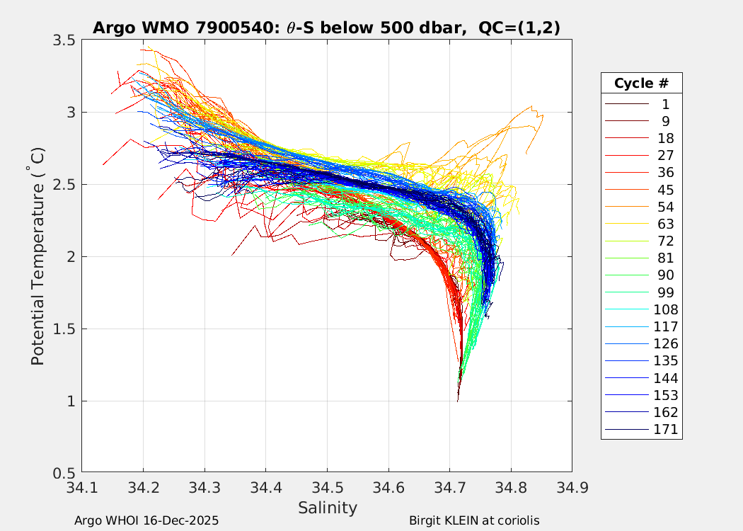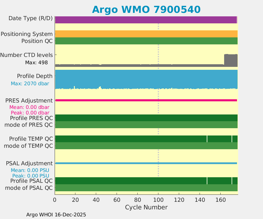 | WMO: #7900540 DAC: coriolis PI: Birgit KLEIN ARVOR: # FLOATCLOCK: # DRUCK: #11446339 SBE41CP: #12780 Altimeter Comparison (IFREMER) EuroArgo Link | ![]() |