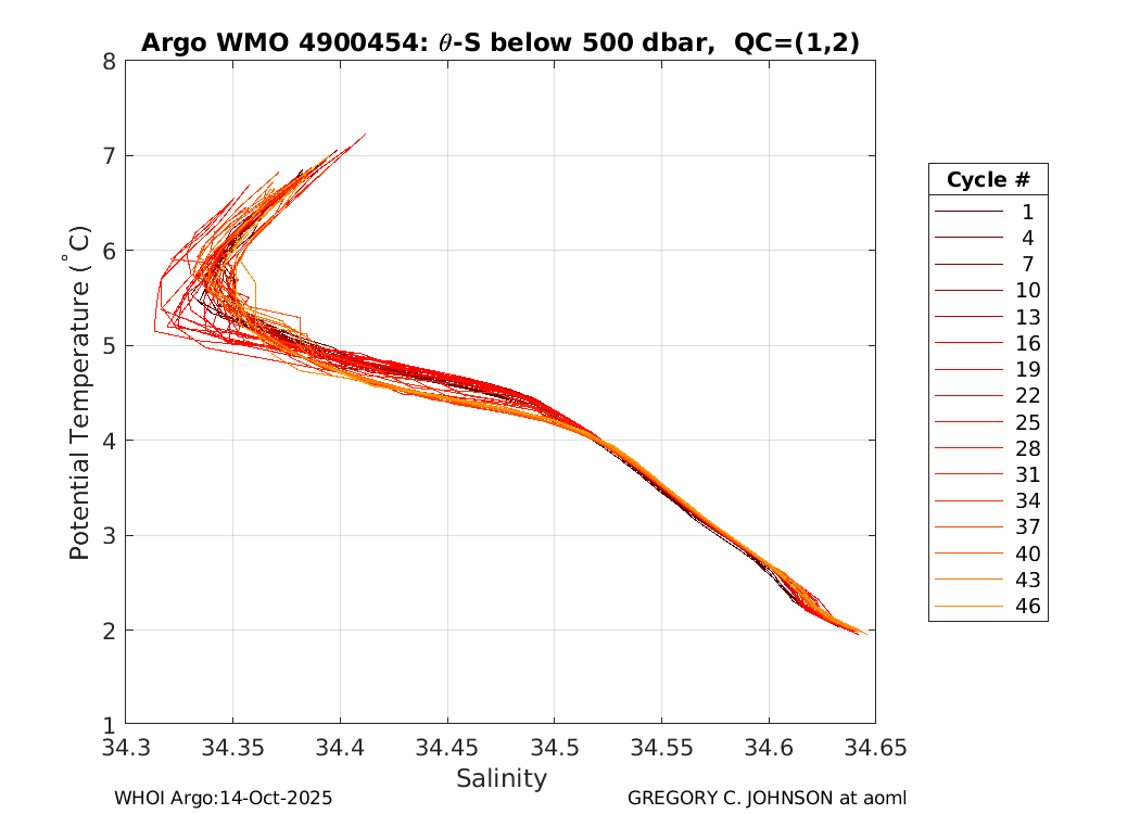 | WMO: #5900455 DAC: aoml PI: GREGORY C. JOHNSON APEX: #1210 SBE41: #1029 DRUCK_2900PSIA: #4703 Altimeter Comparison (IFREMER) EuroArgo Link | ![]() |
