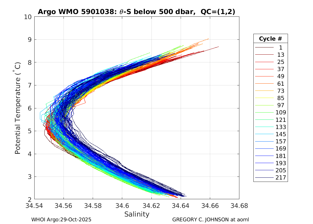 | WMO: #5901038 DAC: aoml PI: GREGORY C. JOHNSON APEX: #3091 SBE41: #3129 DRUCK_2900PSIA: #2346116 Altimeter Comparison (IFREMER) EuroArgo Link | ![]() |