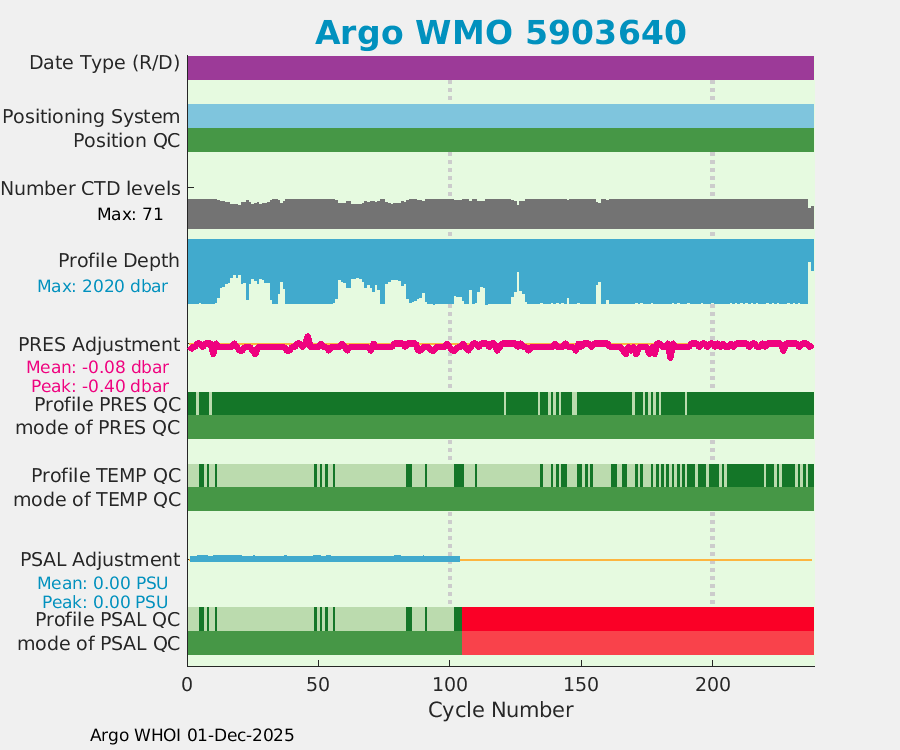 | WMO: #5903352 DAC: aoml PI: STEPHEN RISER APEX: #5136 SBE41: #5026 DRUCK_2900PSIA: #3061646 Altimeter Comparison (IFREMER) EuroArgo Link | ![]() |