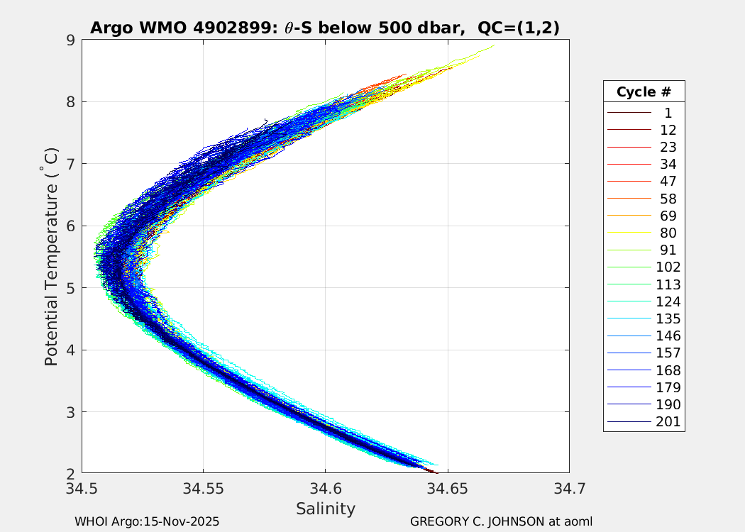 | WMO: #4902899 DAC: aoml PI: GREGORY C. JOHNSON NAVIS_A: #717 SBE41CP: #08559 DRUCK_2900PSIA: #10300713 Altimeter Comparison (IFREMER) EuroArgo Link | ![]() |