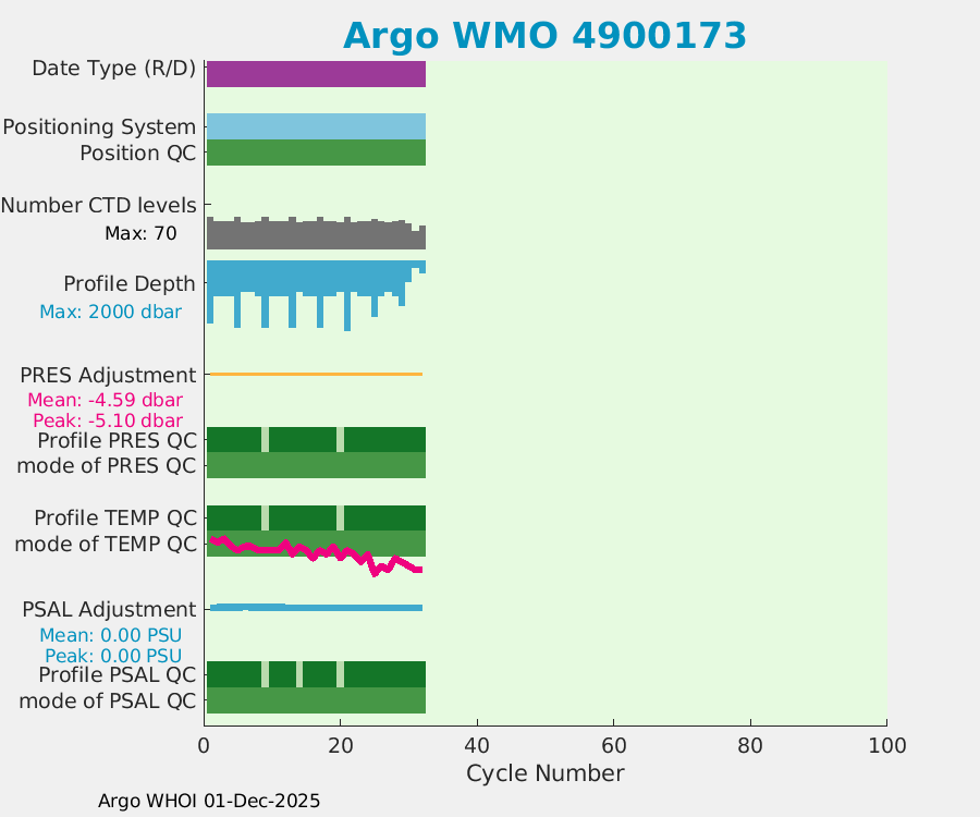 | WMO: #4900173 DAC: aoml PI: GREGORY C. JOHNSON APEX: #803 SBE41: #0560 AMETEK: #2657718070 Altimeter Comparison (IFREMER) EuroArgo Link | ![]() |