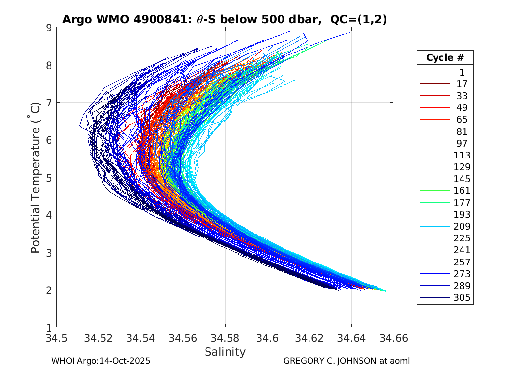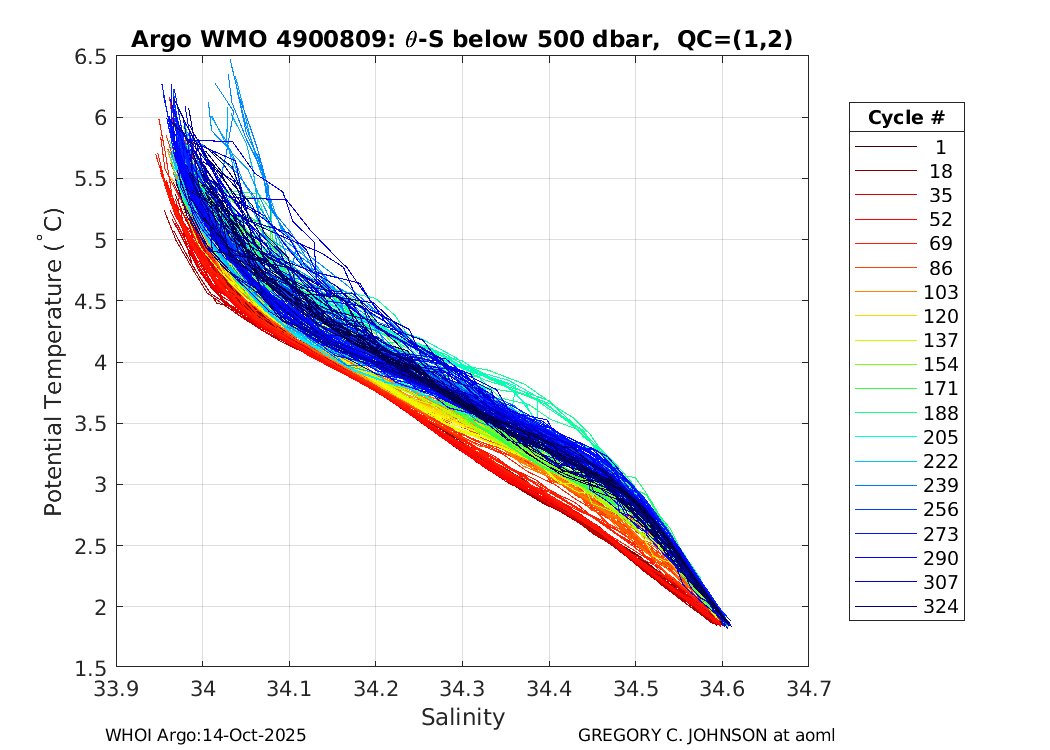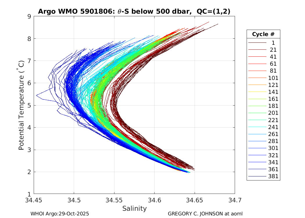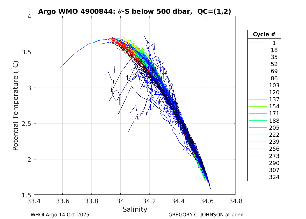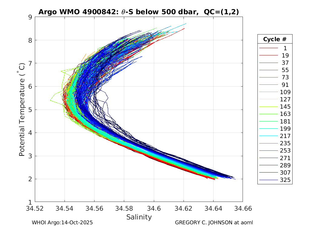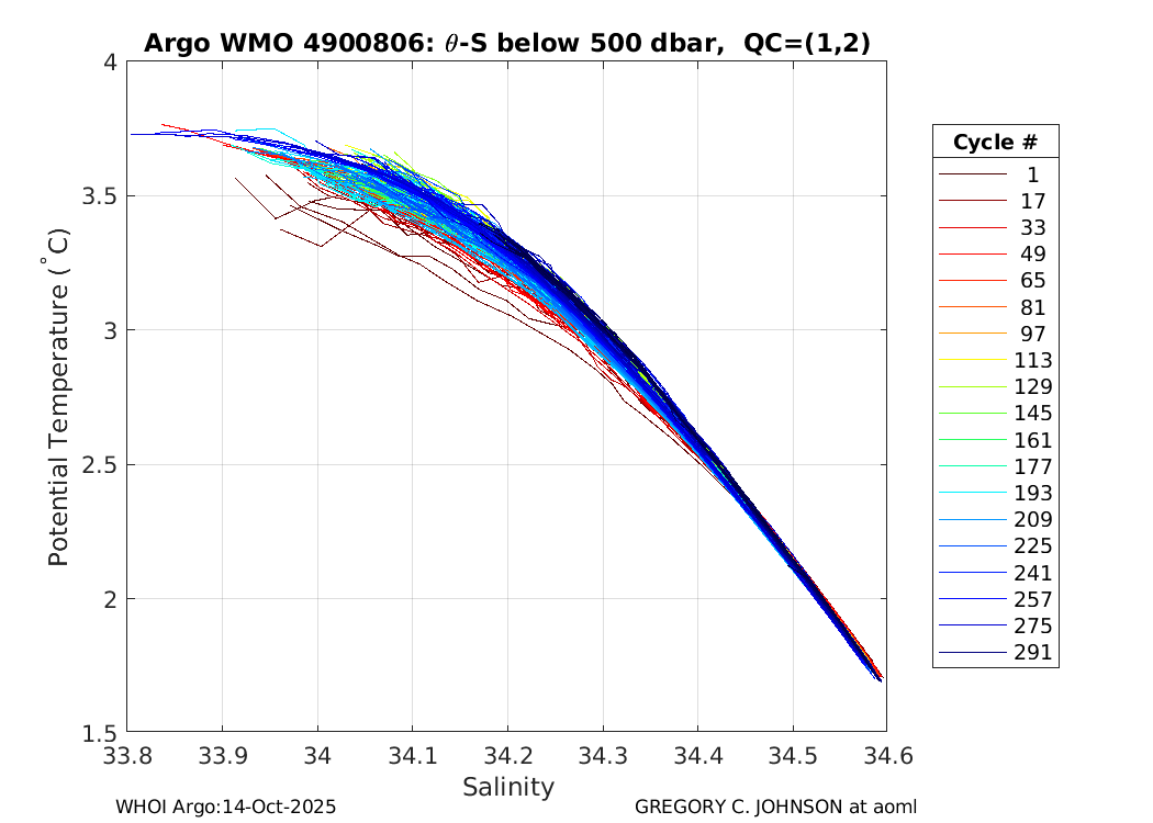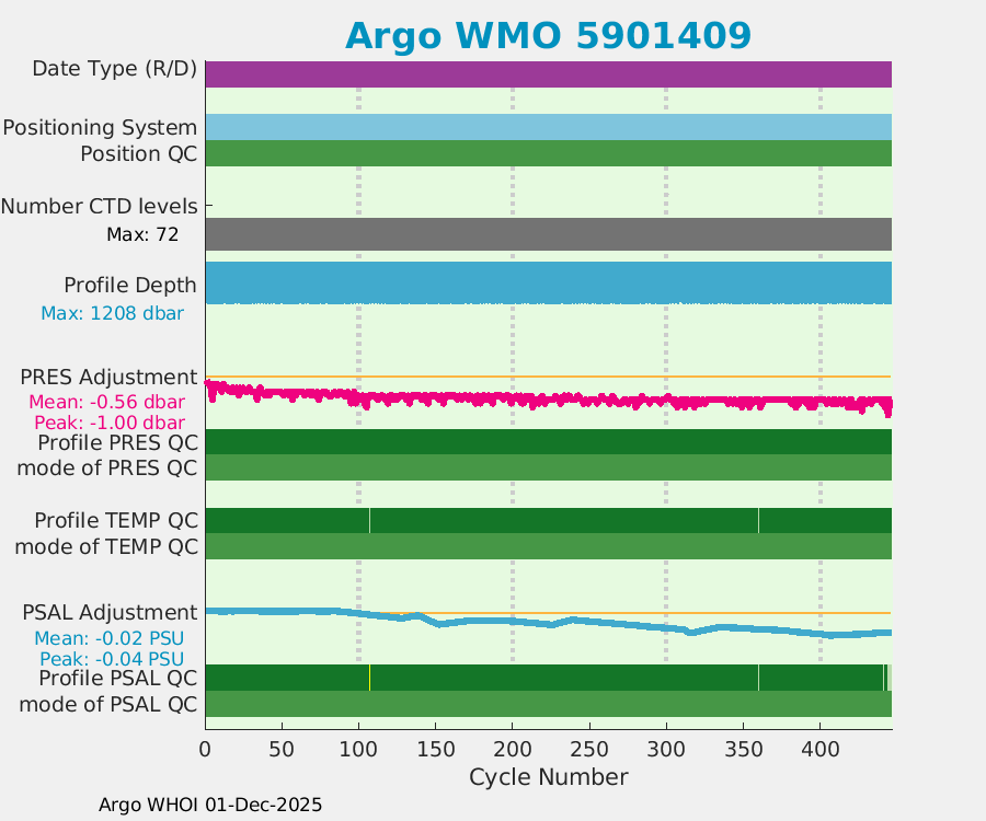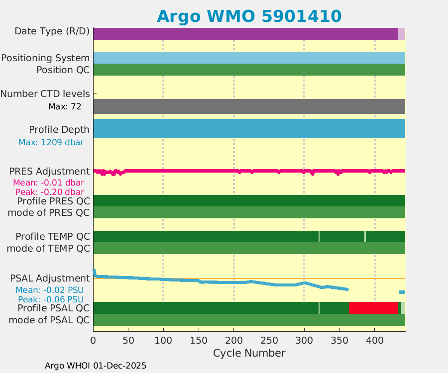 | WMO: #4900841 DAC: aoml PI: GREGORY C. JOHNSON APEX: #3408 SBE41: #3407 DRUCK_2900PSIA: #2424854 Altimeter Comparison (IFREMER) EuroArgo Link | ![]() |