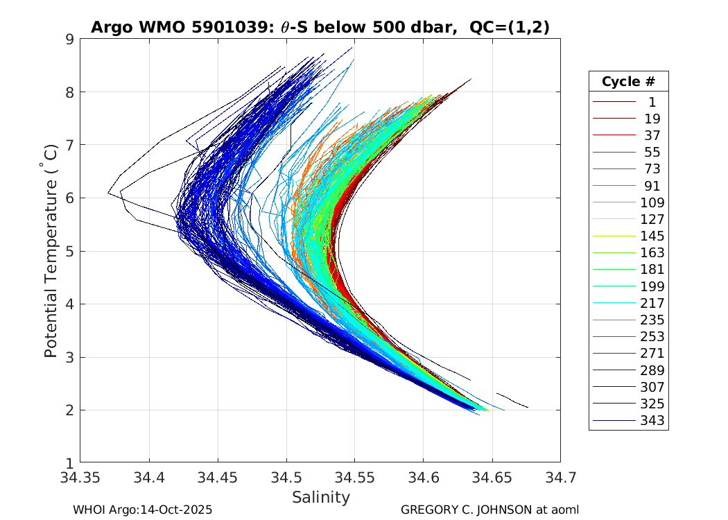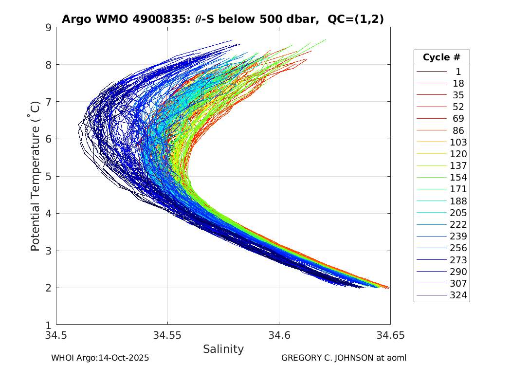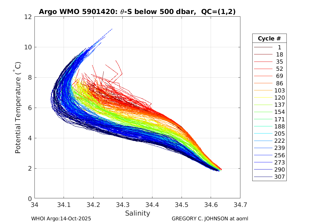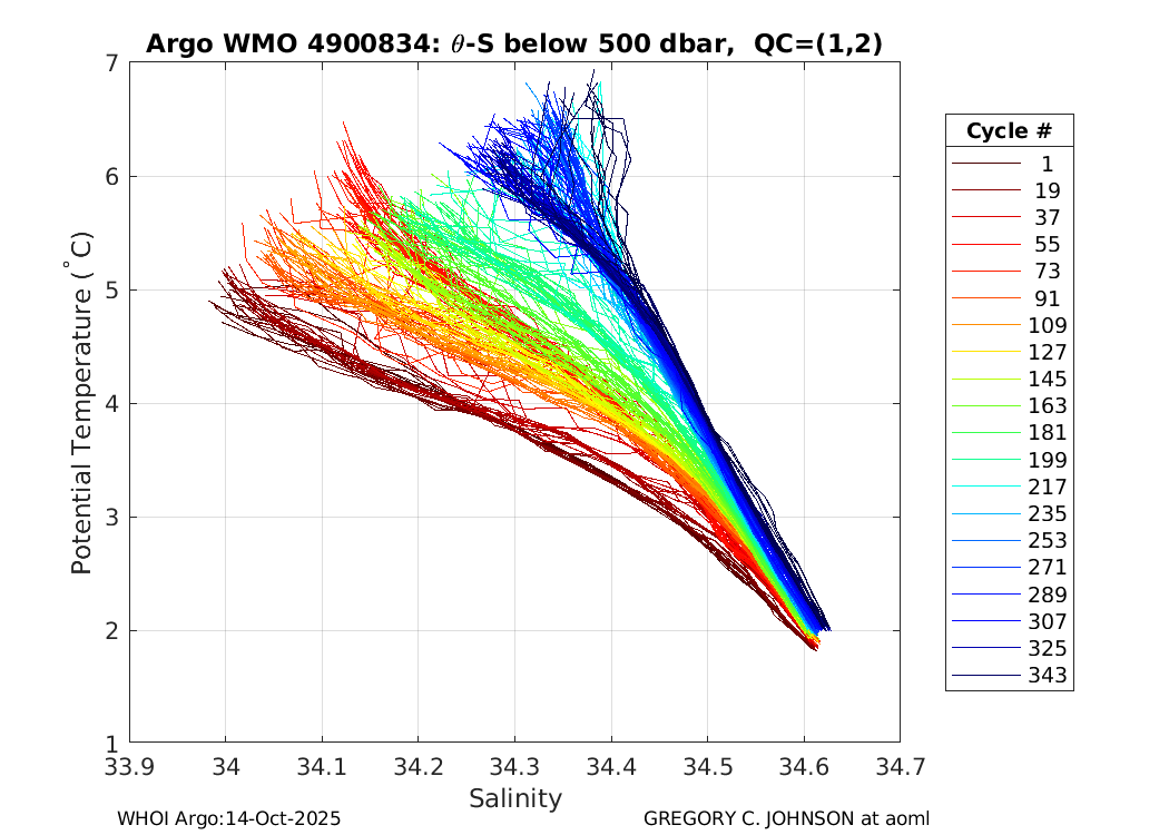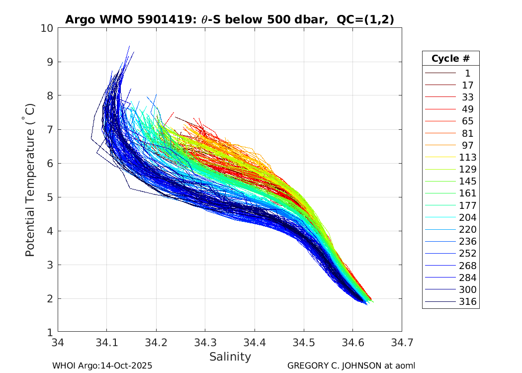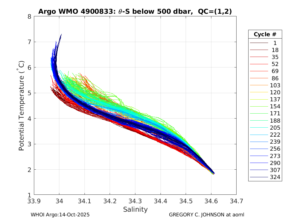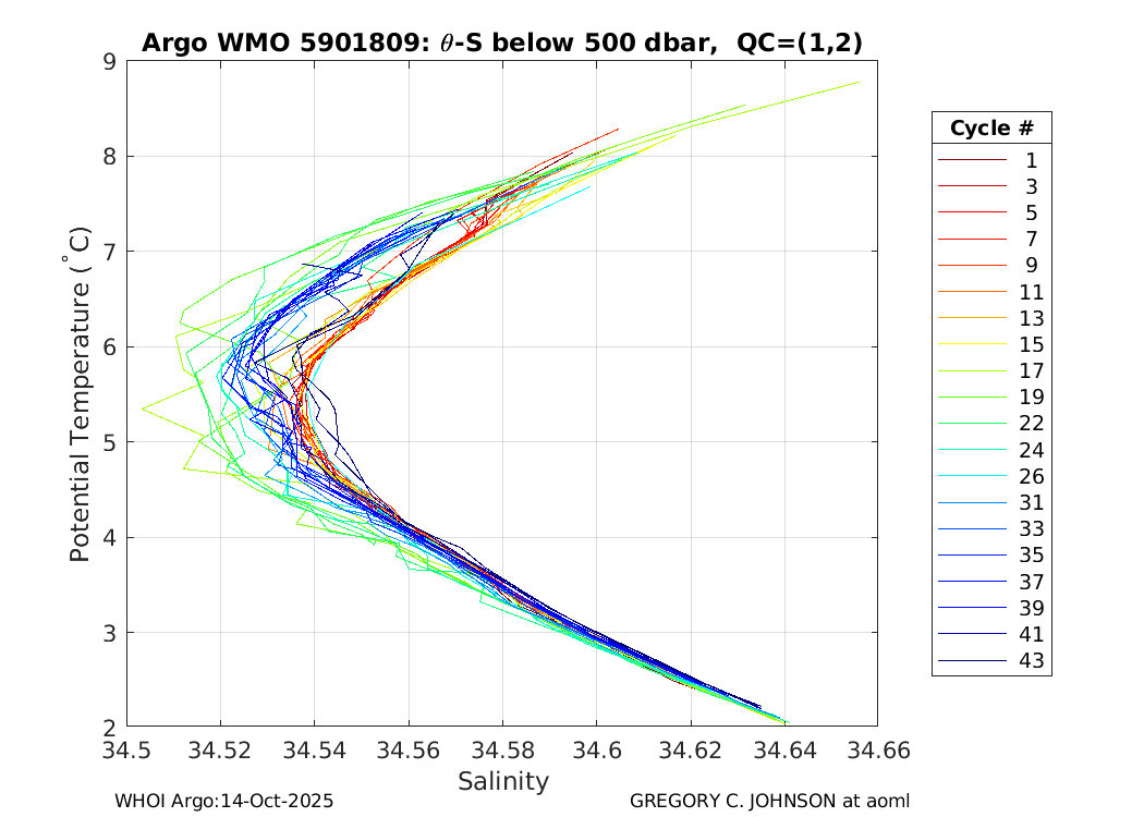 | WMO: #4900841 DAC: aoml PI: GREGORY C. JOHNSON APEX: #3408 SBE41: #3407 DRUCK_2900PSIA: #2424854 Altimeter Comparison (IFREMER) EuroArgo Link | ![]() |