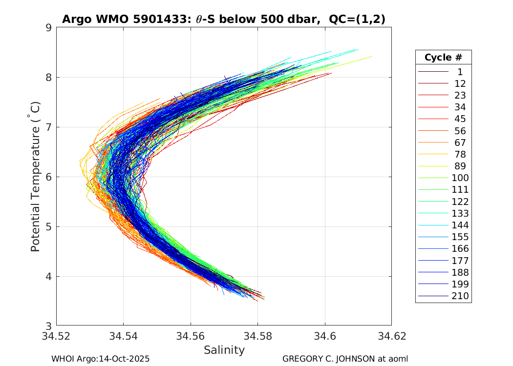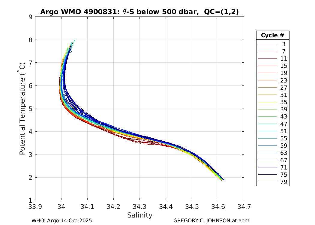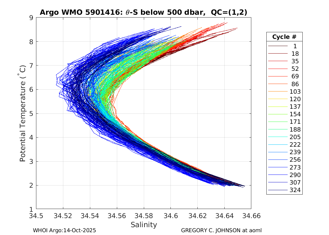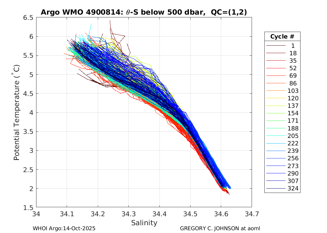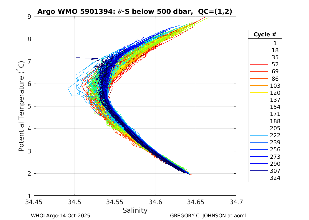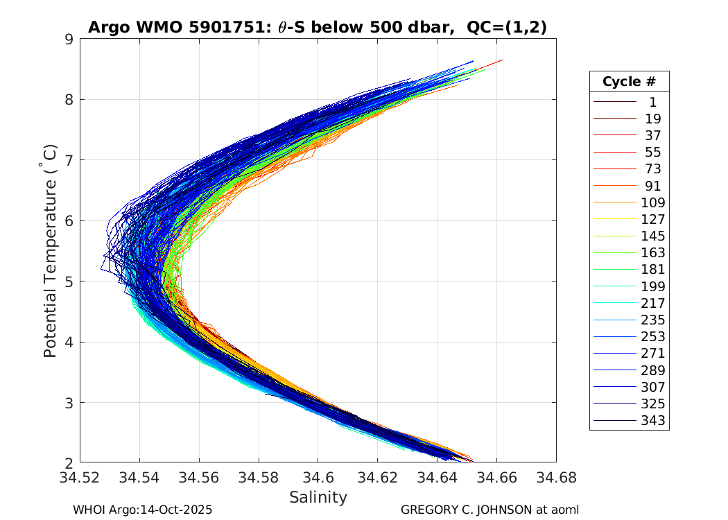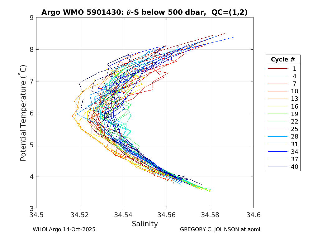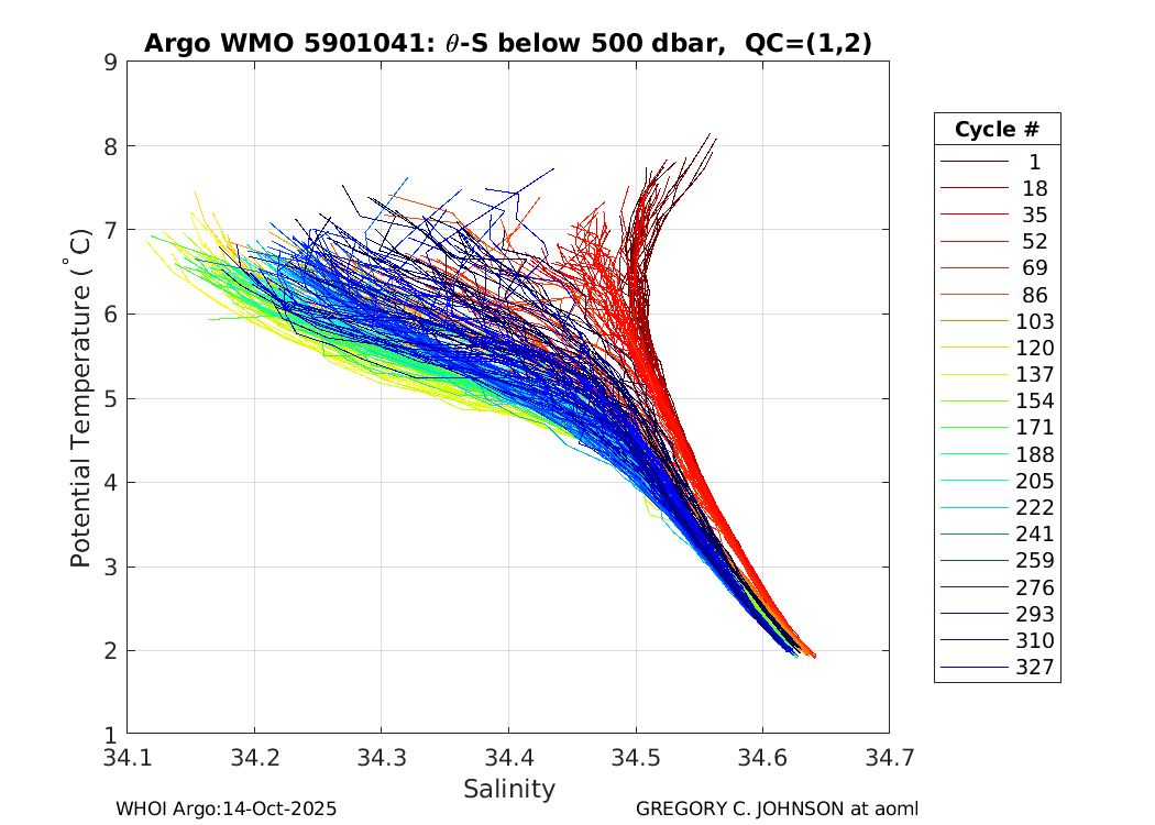 | WMO: #4900841 DAC: aoml PI: GREGORY C. JOHNSON APEX: #3408 SBE41: #3407 DRUCK_2900PSIA: #2424854 Altimeter Comparison (IFREMER) EuroArgo Link | ![]() |