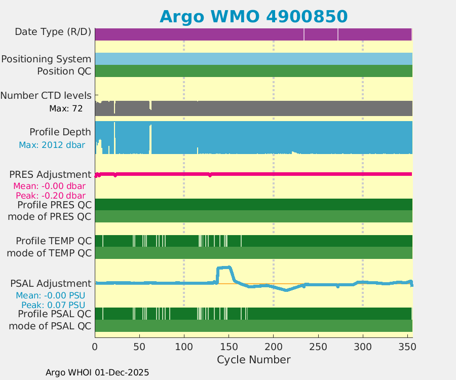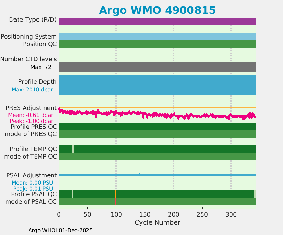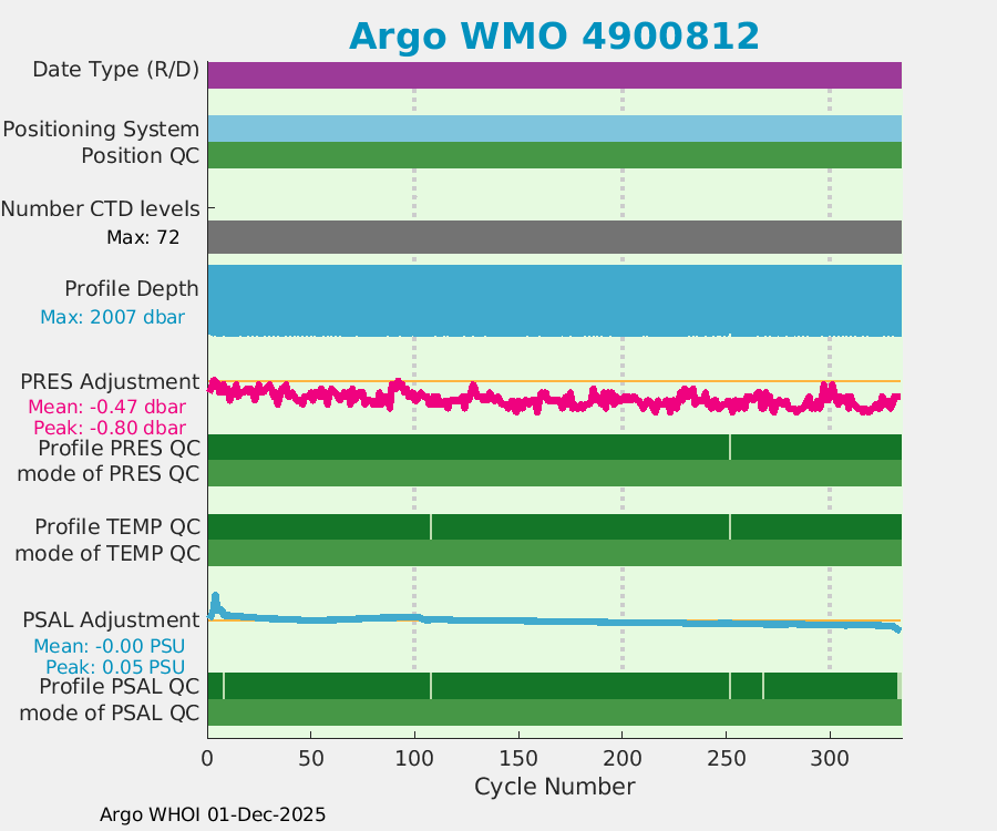 | WMO: #4900813 DAC: aoml PI: GREGORY C. JOHNSON APEX: #3012 SBE41: #2932 DRUCK_2900PSIA: #10494 Altimeter Comparison (IFREMER) EuroArgo Link | n/a | n/a | ![]() |