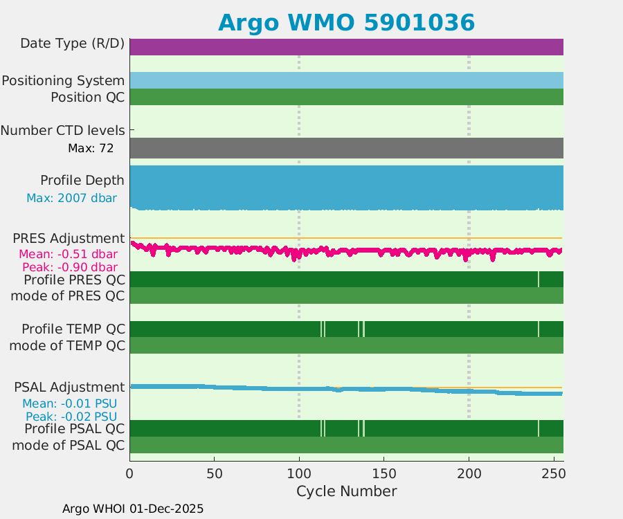 | WMO: #5901296 DAC: aoml PI: GREGORY C. JOHNSON APEX: #2499 SBE41: #2583 DRUCK_2900PSIA: #2328579 Altimeter Comparison (IFREMER) EuroArgo Link | ![]() |