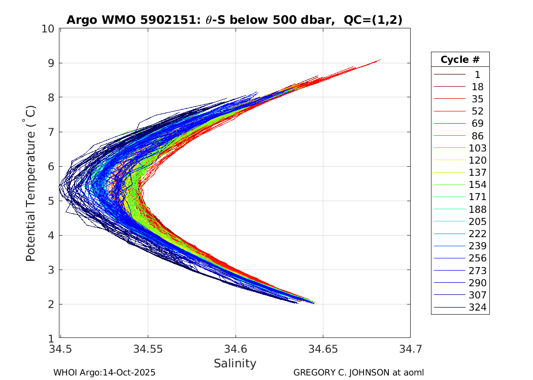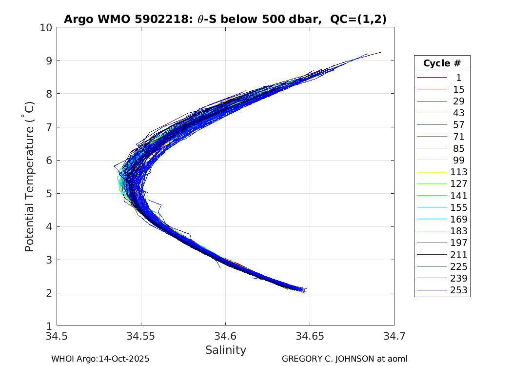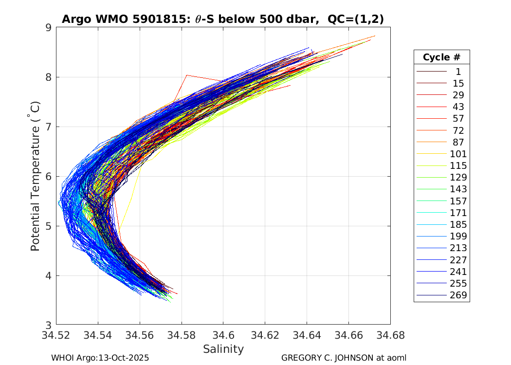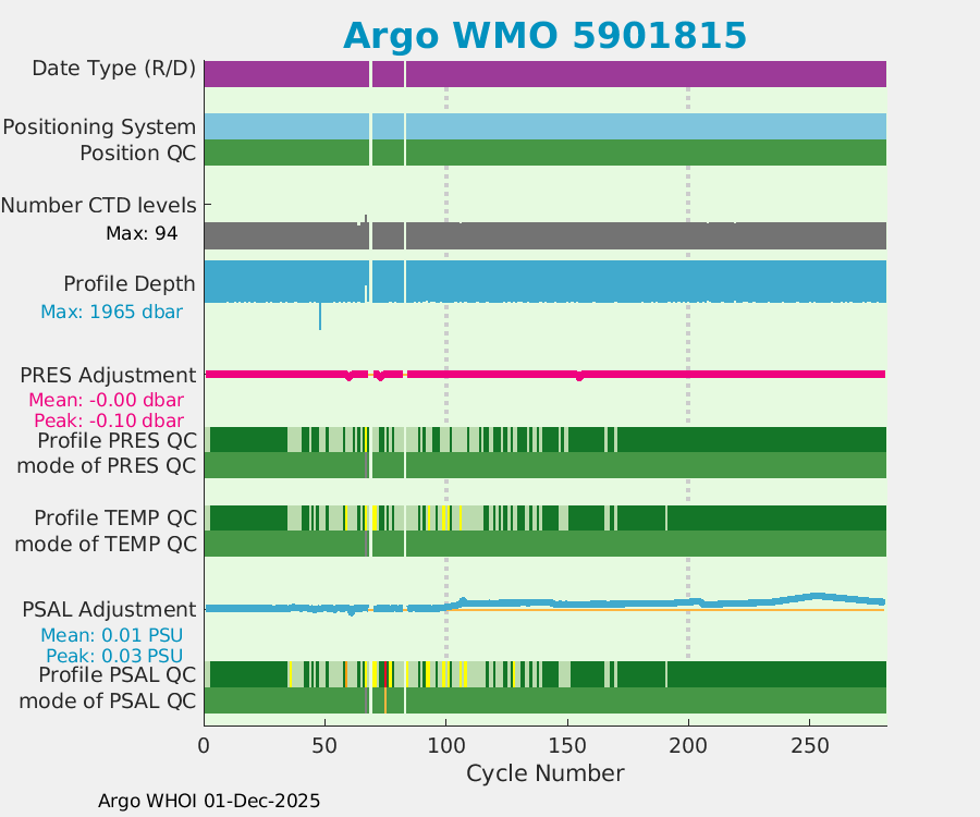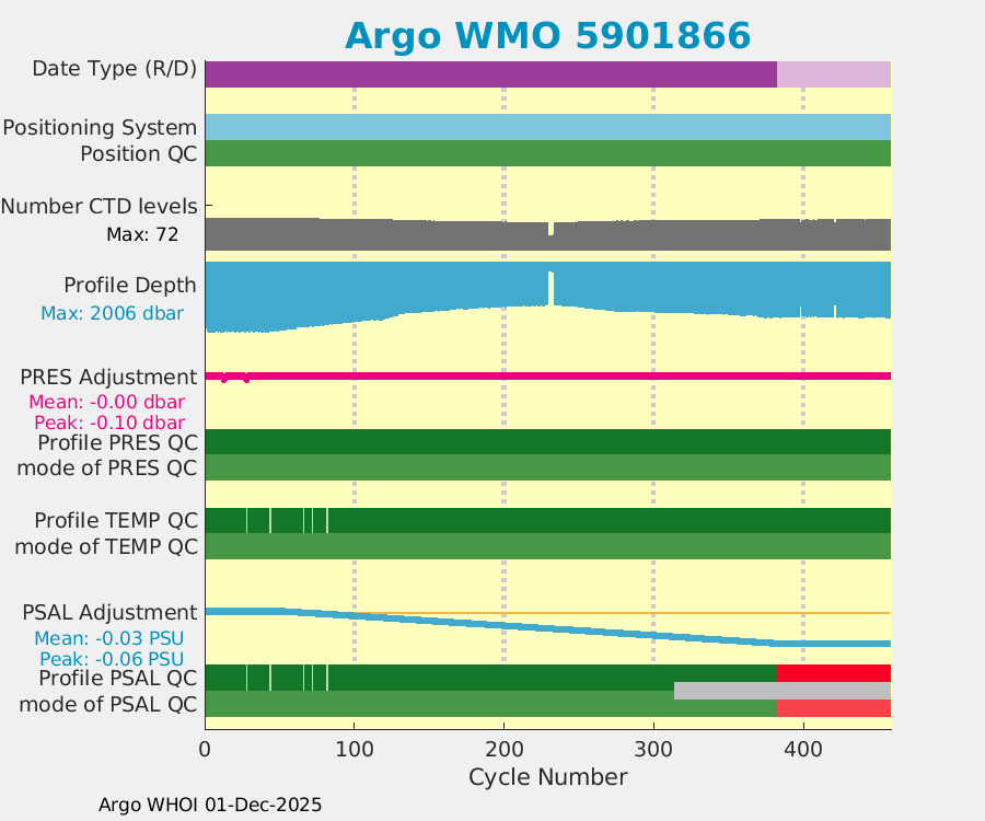 | WMO: #5901866 DAC: aoml PI: GREGORY C. JOHNSON APEX: #3582 SBE41: #3479 DRUCK_2900PSIA: #2438991 Altimeter Comparison (IFREMER) EuroArgo Link | ![]() |