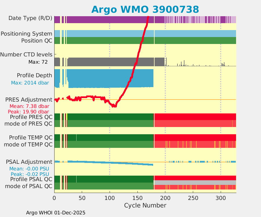 | WMO: #4901238 DAC: aoml PI: GREGORY C. JOHNSON APEX: #4258 SBE41: #4271 DRUCK_2900PSIA: #2724800 Altimeter Comparison (IFREMER) EuroArgo Link | ![]() |