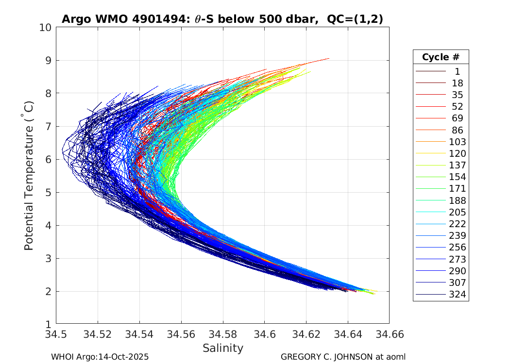 | WMO: #4901494 DAC: aoml PI: GREGORY C. JOHNSON APEX: #5837 SBE41: #5636 DRUCK_2900PSIA: #3260910 Altimeter Comparison (IFREMER) EuroArgo Link | ![]() |
