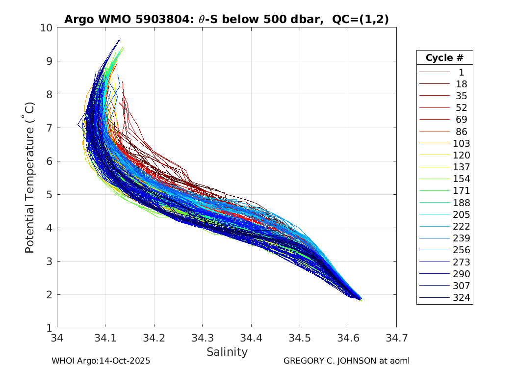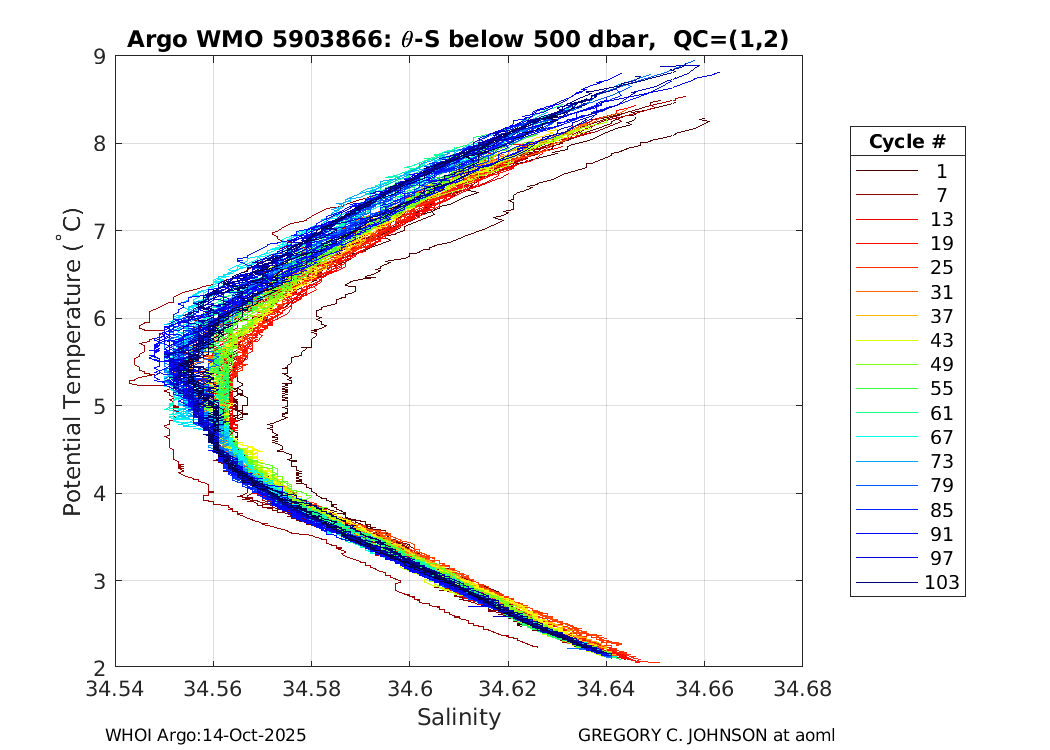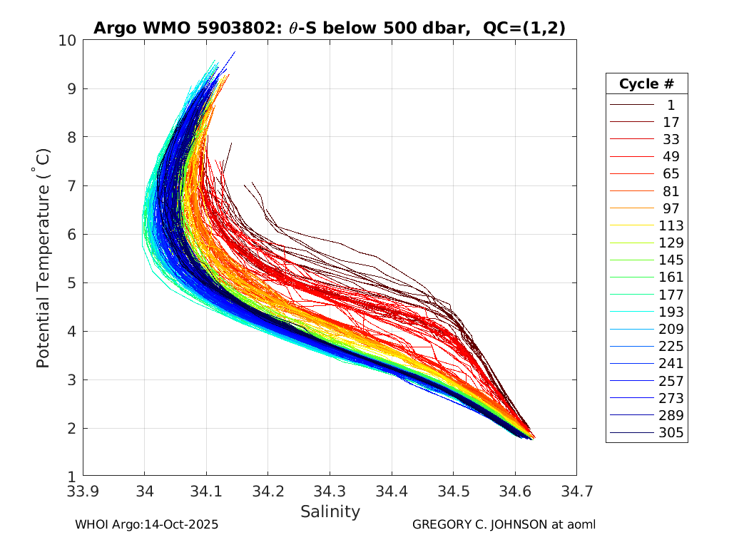 | WMO: #5903866 DAC: aoml PI: GREGORY C. JOHNSON APEX: #5421 SBE41CP: #3500 DRUCK_2900PSIA: #3169572 Altimeter Comparison (IFREMER) EuroArgo Link | ![]() |