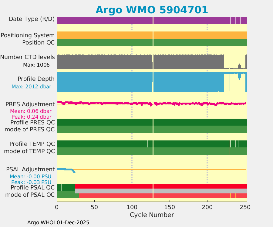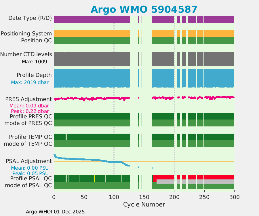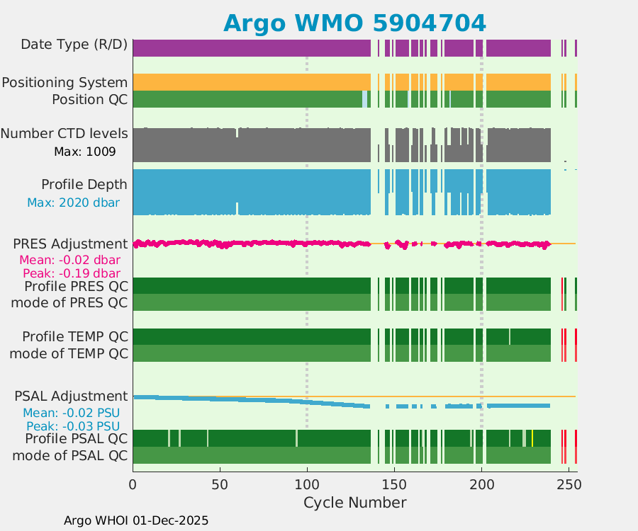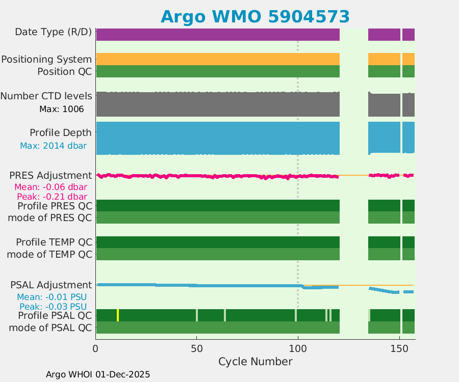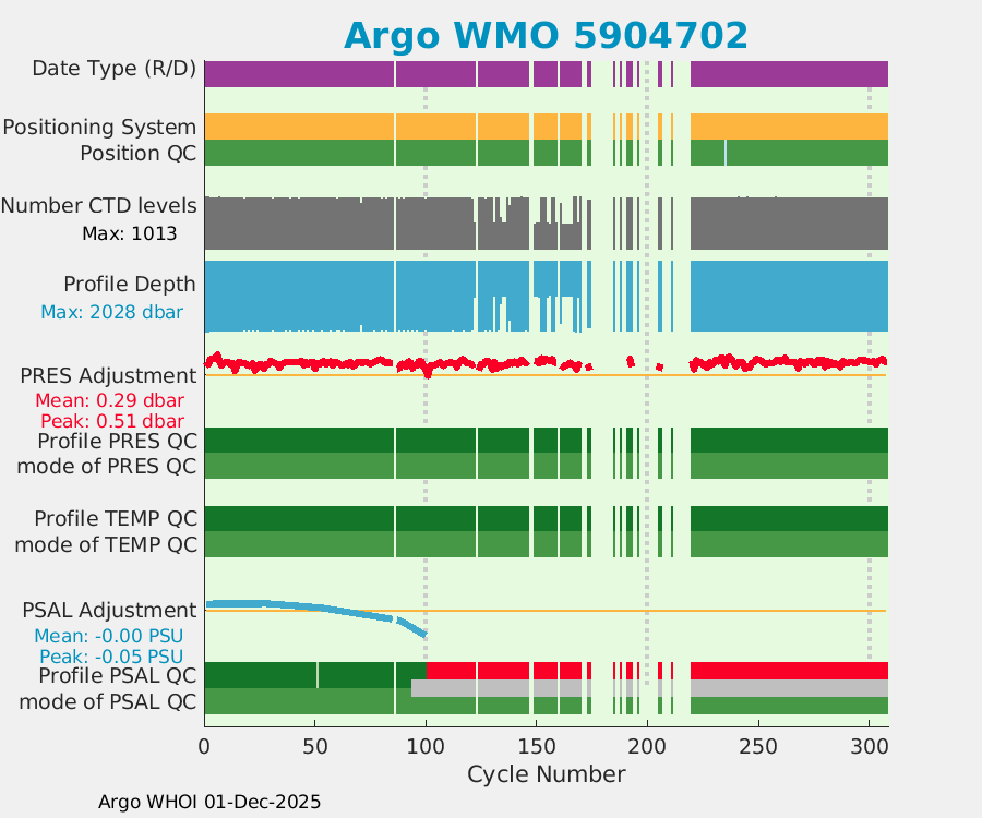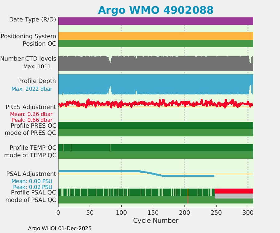 | WMO: #4901666 DAC: aoml PI: GREGORY C. JOHNSON NAVIS_A: #443 SBE41CP: #6235 DRUCK_2900PSIA: #4128693 Altimeter Comparison (IFREMER) EuroArgo Link | ![]() |