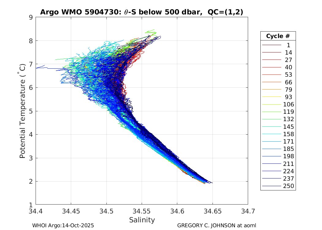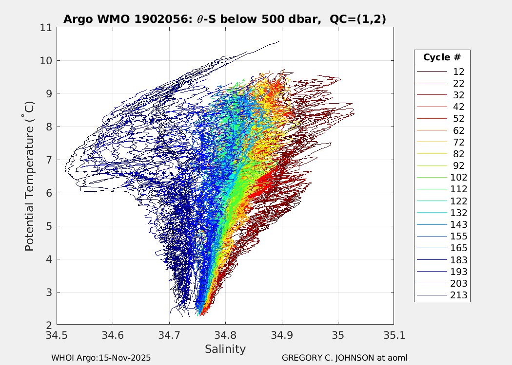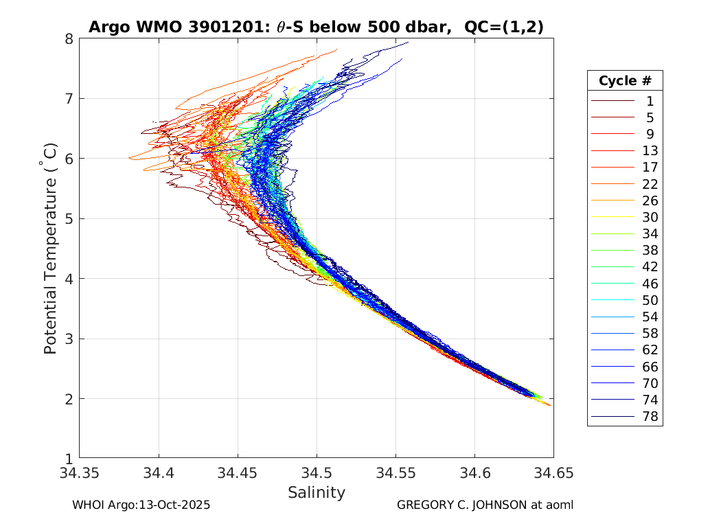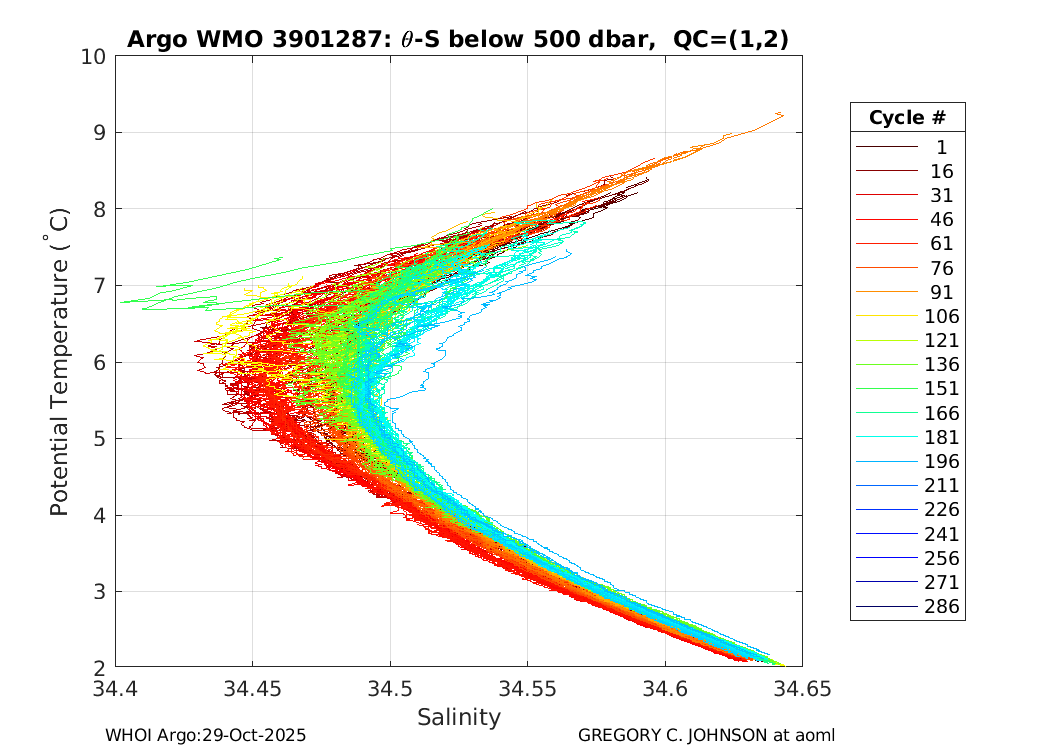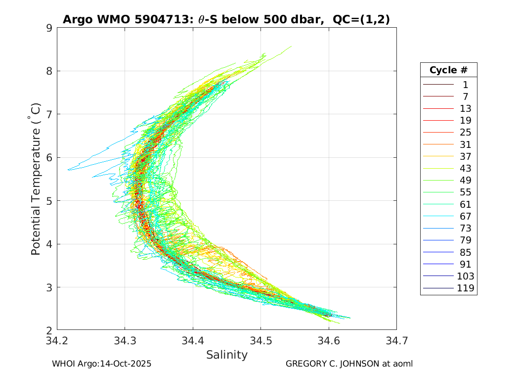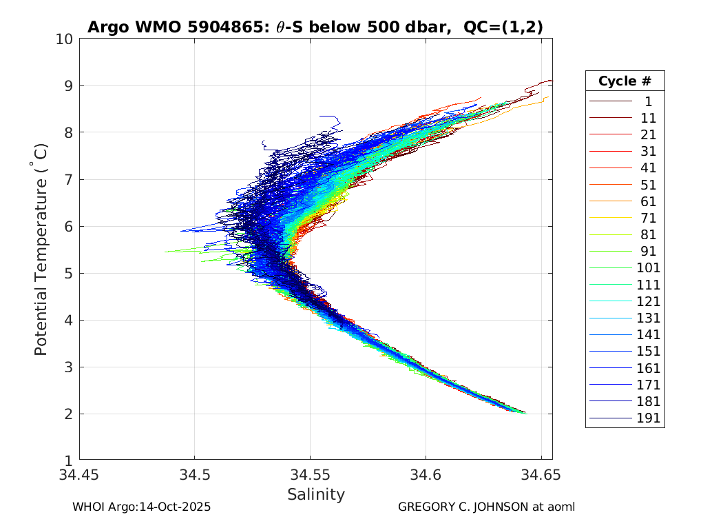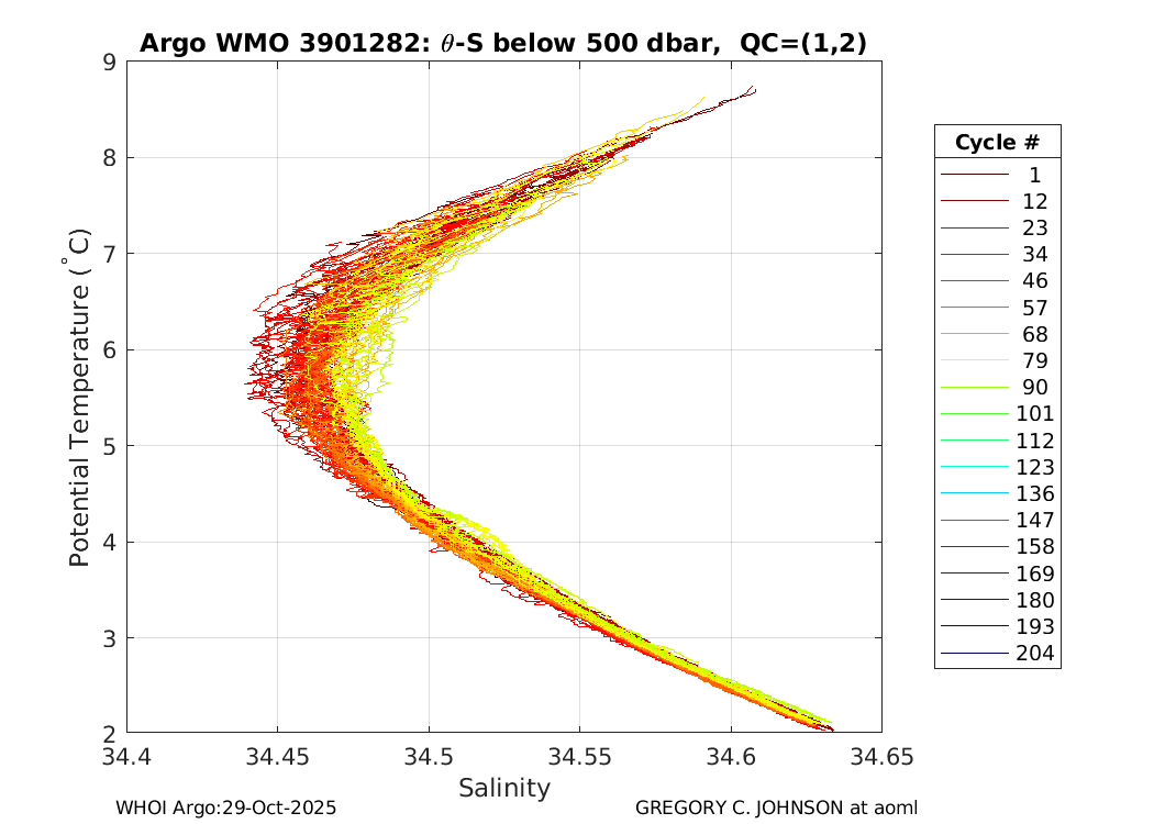 | WMO: #1901805 DAC: aoml PI: GREGORY C. JOHNSON NAVIS_A: #680 SBE41CP: #08181 KISTLER_2900PSIA: #4730973 Altimeter Comparison (IFREMER) EuroArgo Link | ![]() |