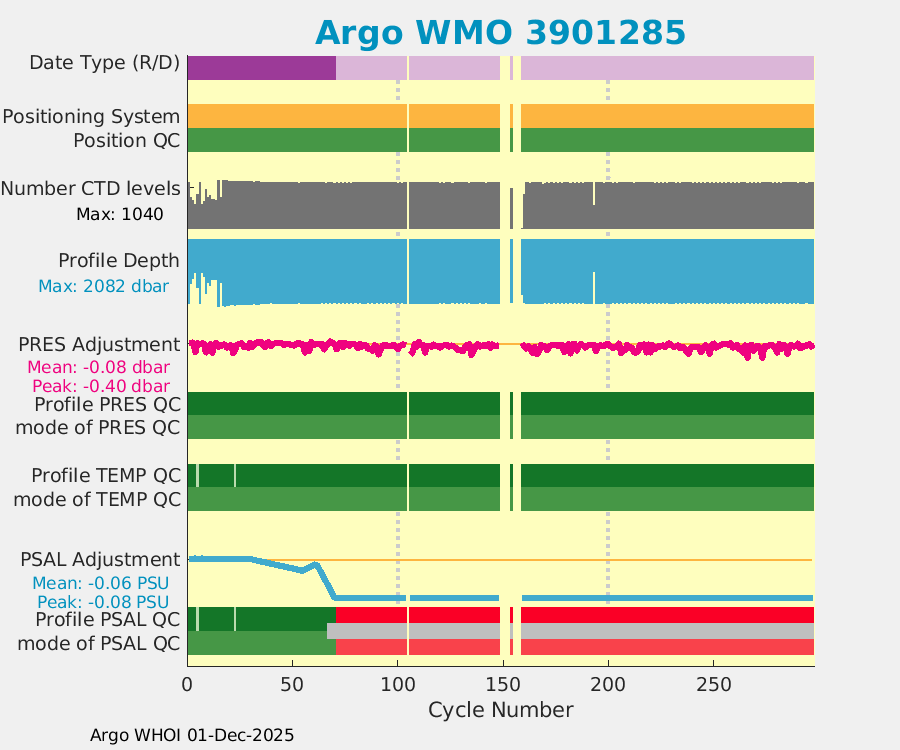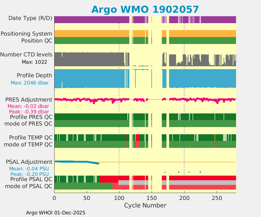 | WMO: #3901282 DAC: aoml PI: GREGORY C. JOHNSON NAVIS_A: #710 SBE41CP: #08531 DRUCK_2900PSIA: #10300628 Altimeter Comparison (IFREMER) EuroArgo Link | ![]() |