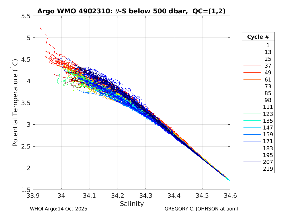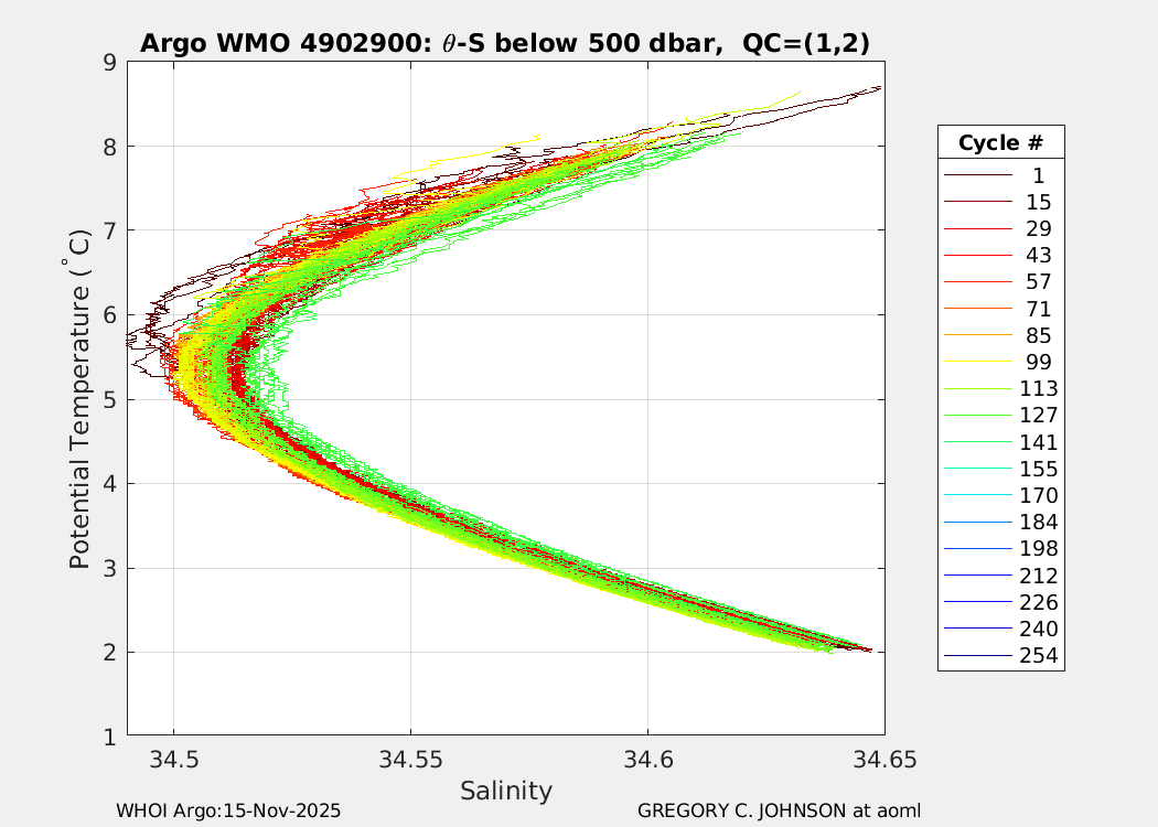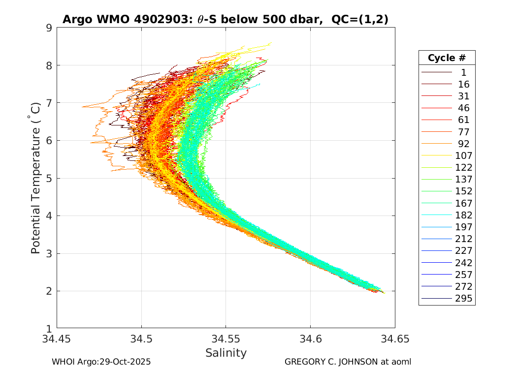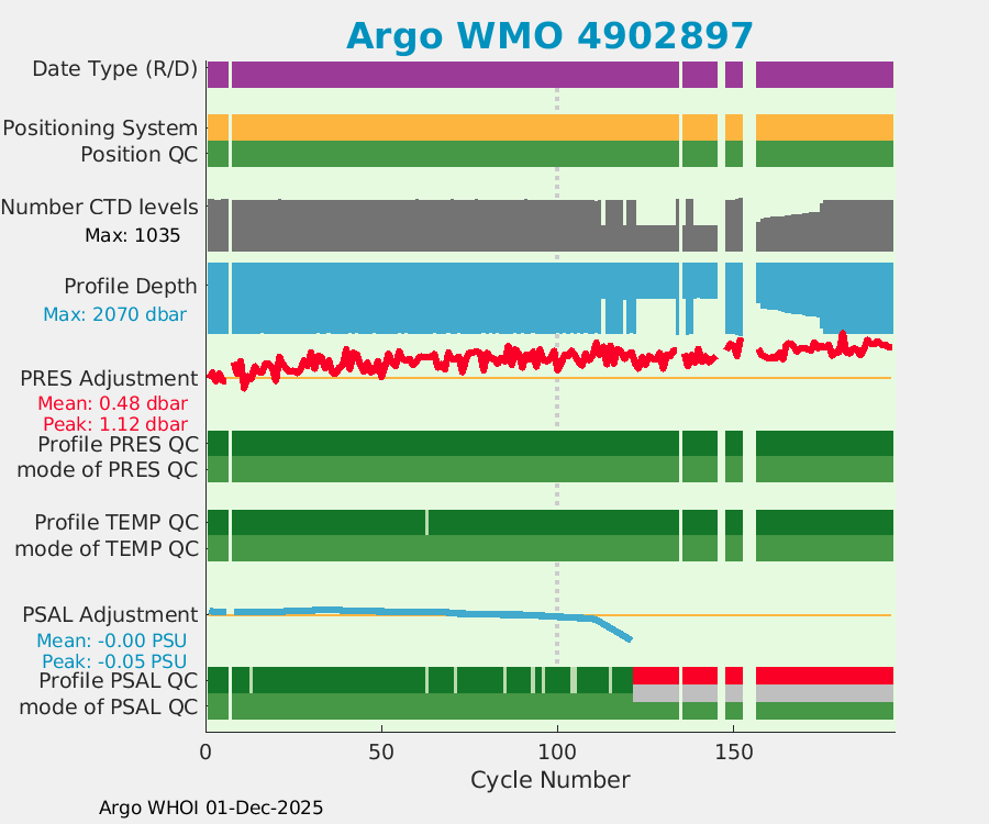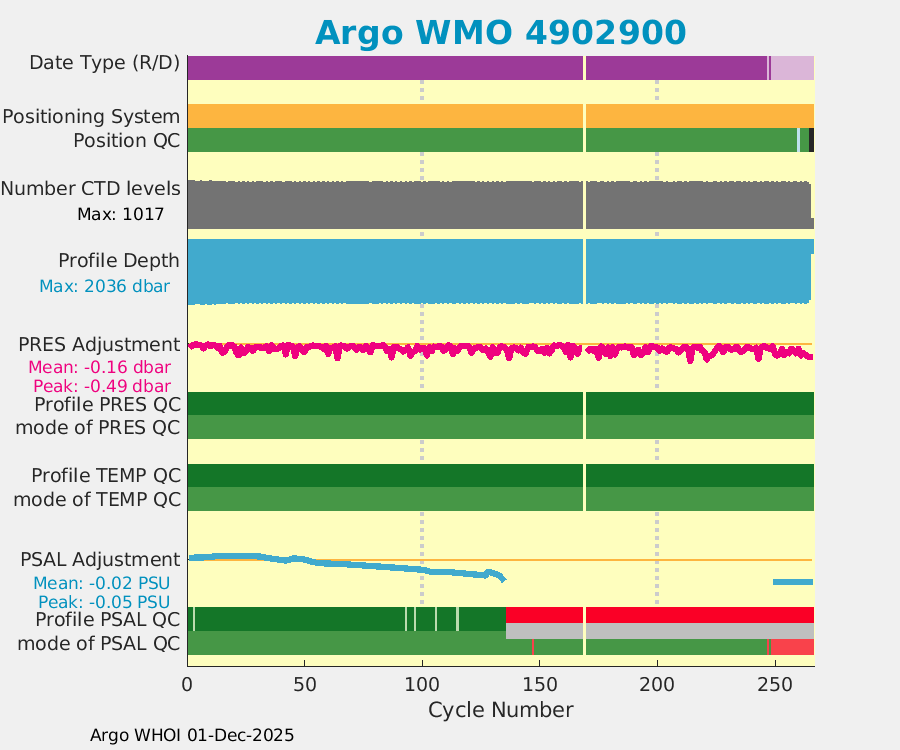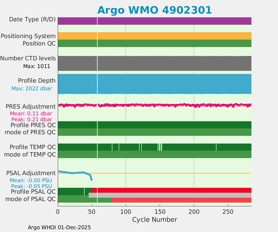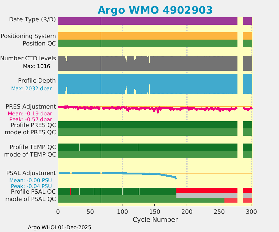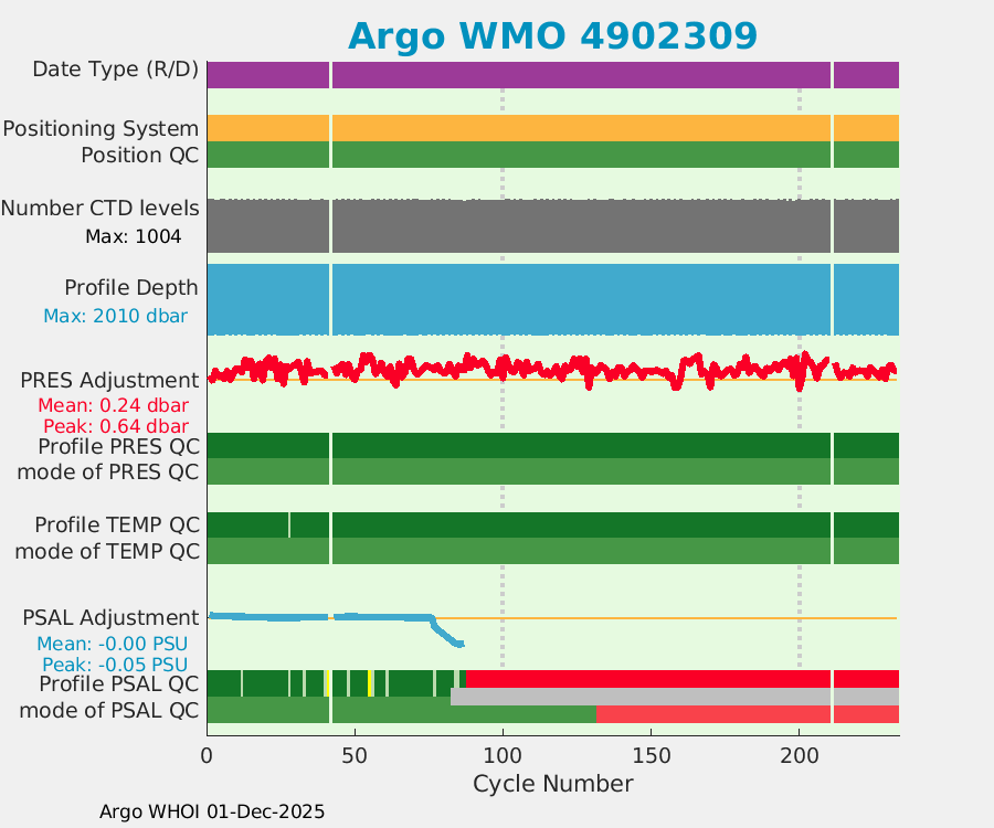 | WMO: #4902301 DAC: aoml PI: GREGORY C. JOHNSON NAVIS_A: #542 SBE41CP: #7231 DRUCK_2900PSIA: #4218729 Altimeter Comparison (IFREMER) EuroArgo Link | ![]() |
