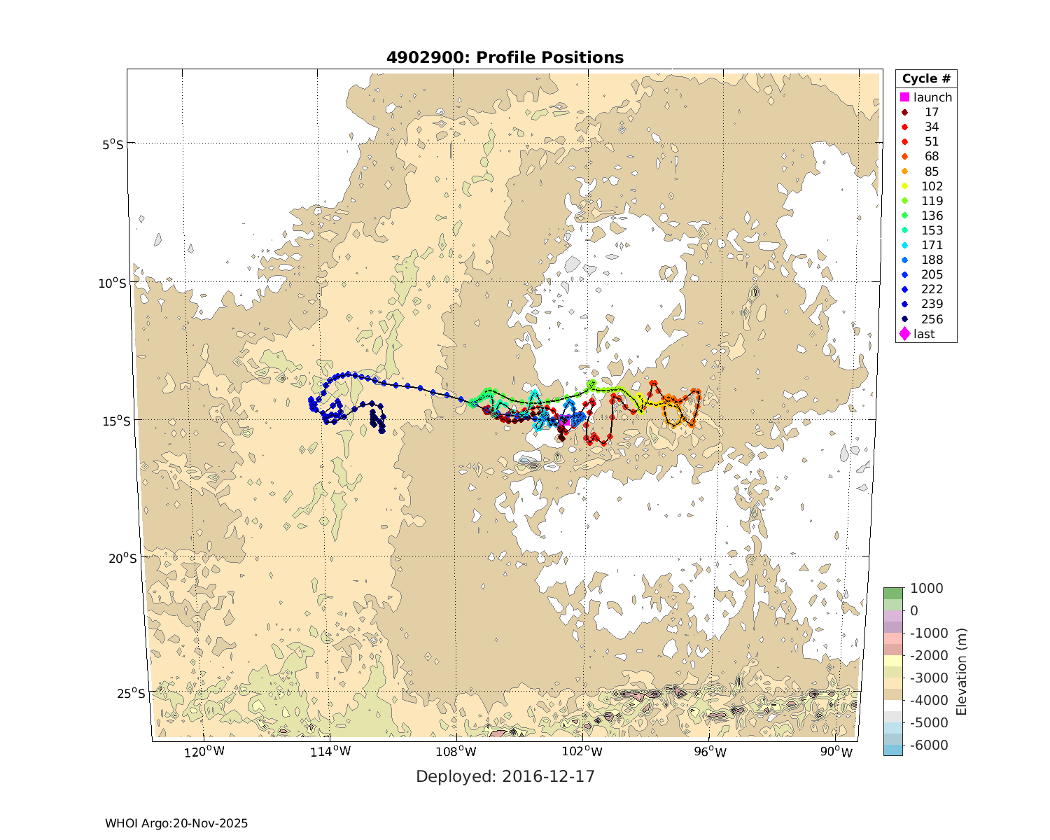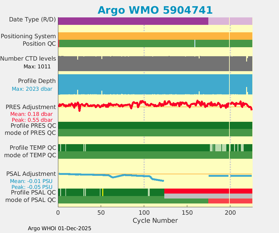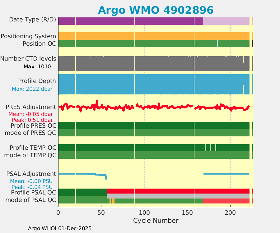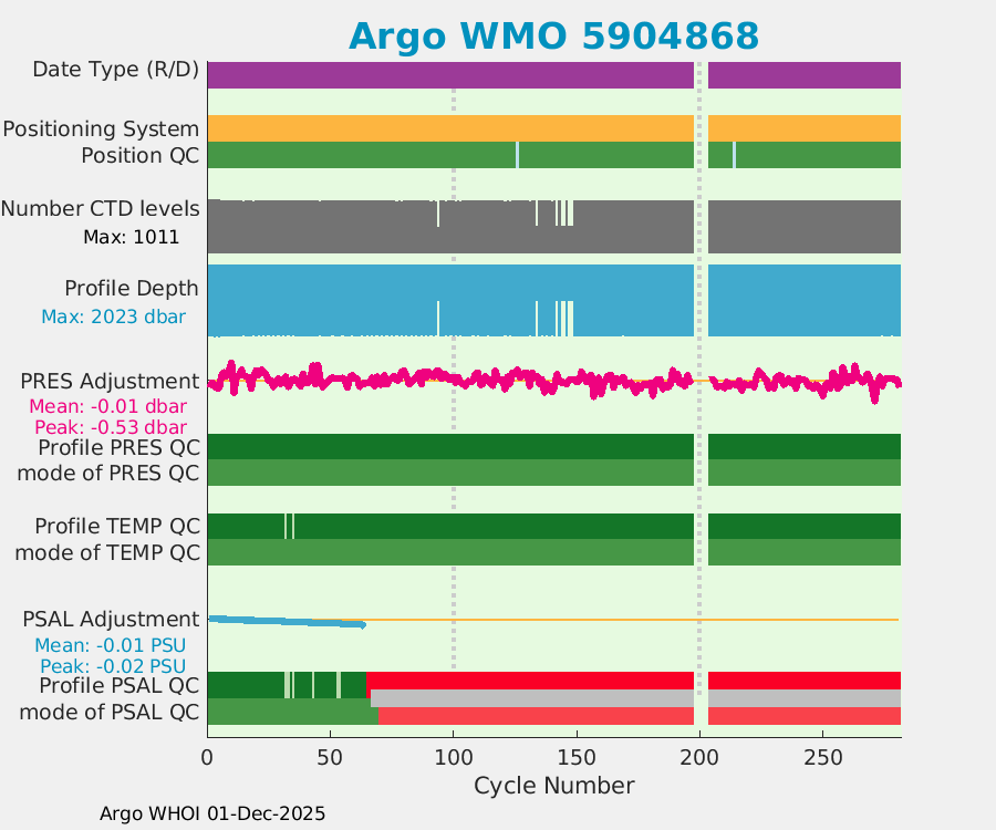 | WMO: #4902900 DAC: aoml PI: GREGORY C. JOHNSON NAVIS_A: #722 SBE41CP: #08638 DRUCK_2900PSIA: #10300605 Altimeter Comparison (IFREMER) EuroArgo Link | ![]() |