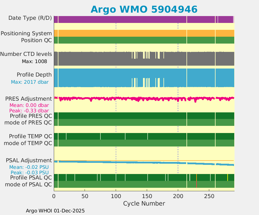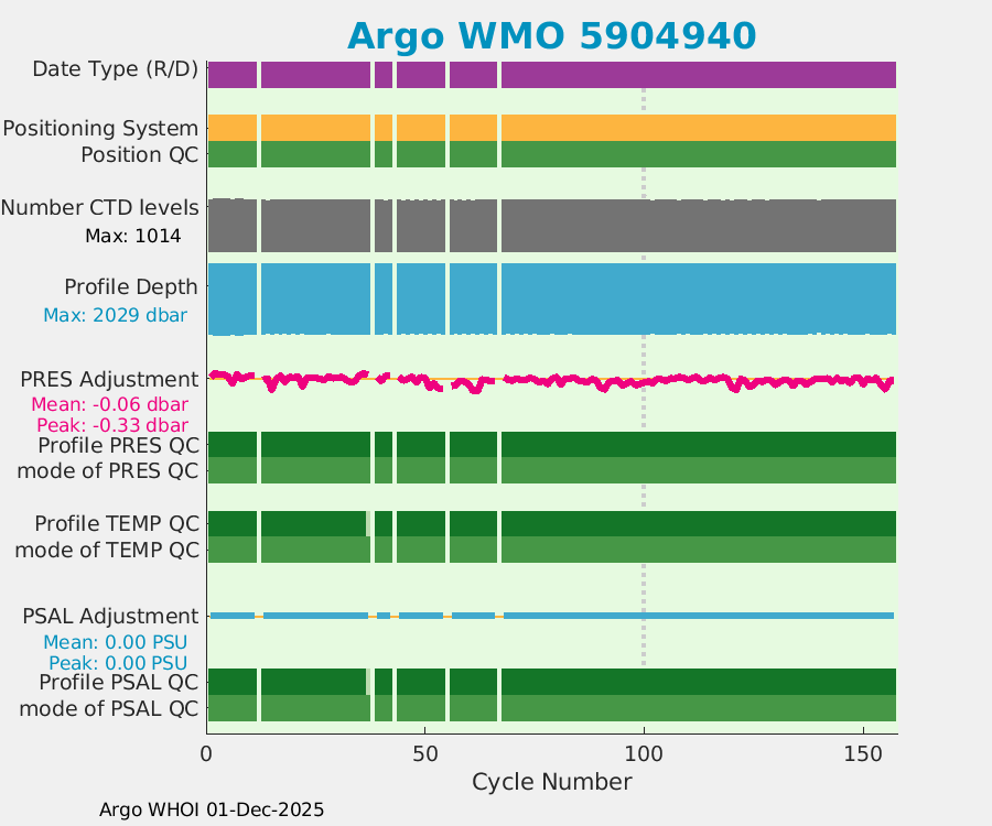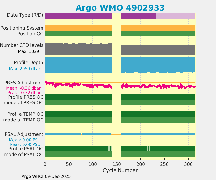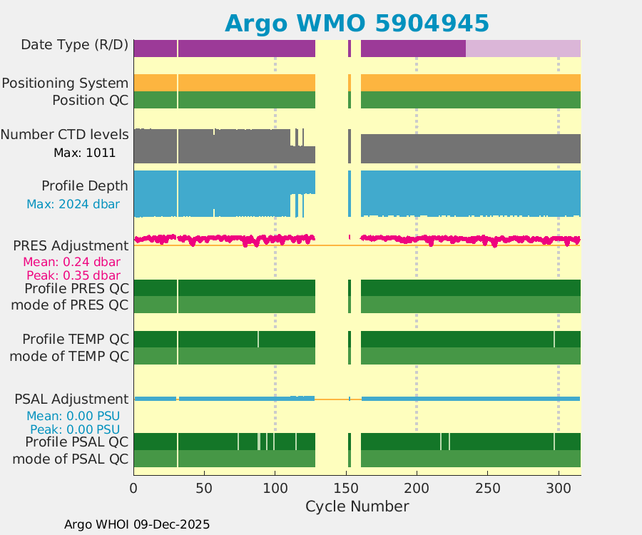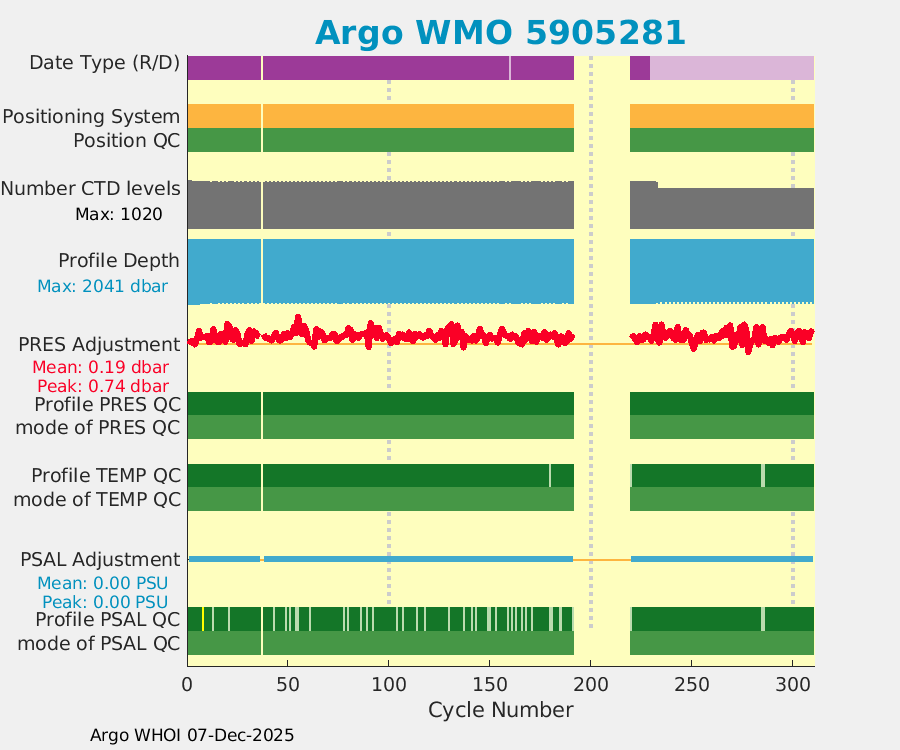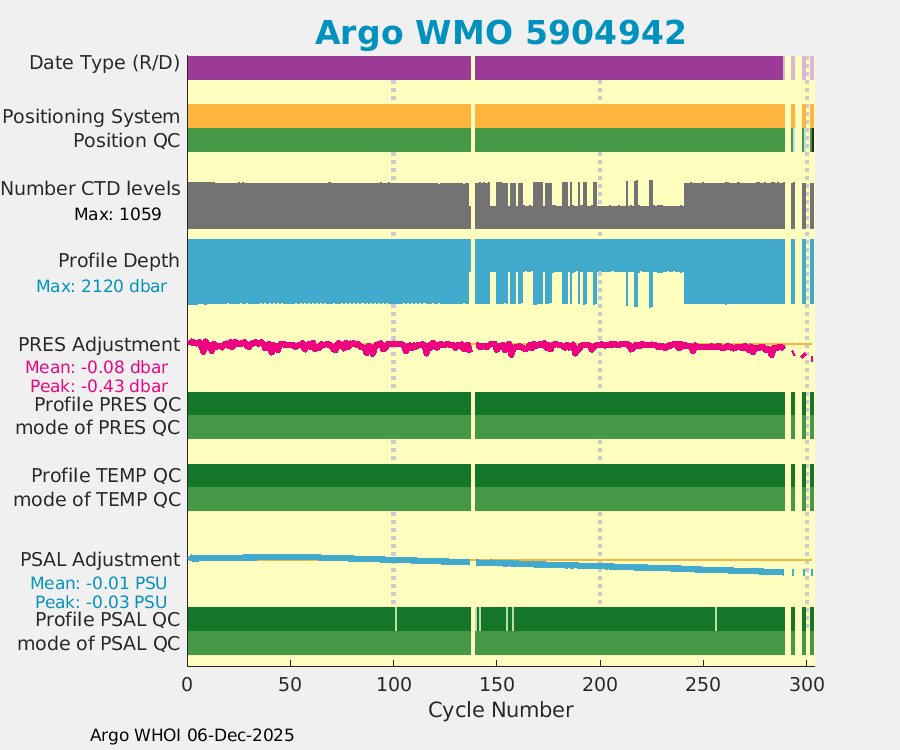 | WMO: #4902907 DAC: aoml PI: GREGORY C. JOHNSON NAVIS_A: #732 SBE41CP: #8691 DRUCK_2900PSIA: #10300468 Altimeter Comparison (IFREMER) EuroArgo Link | ![]() |