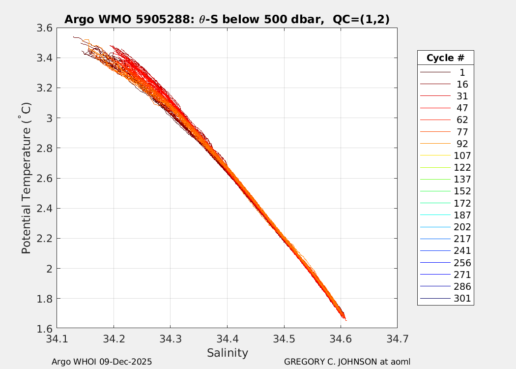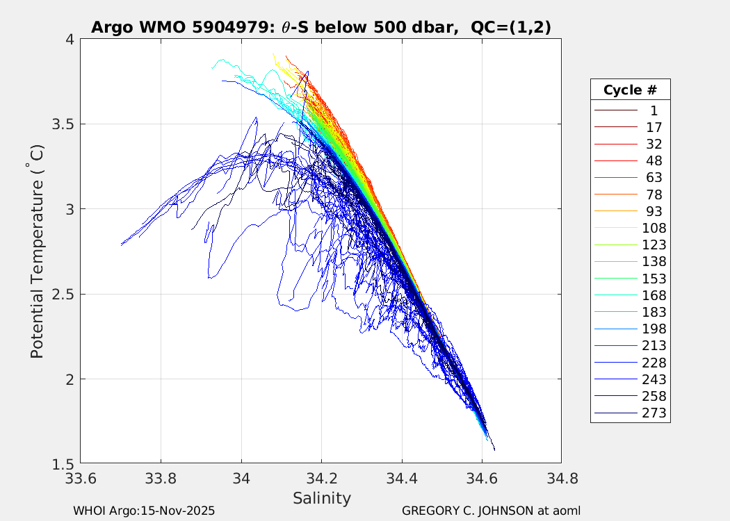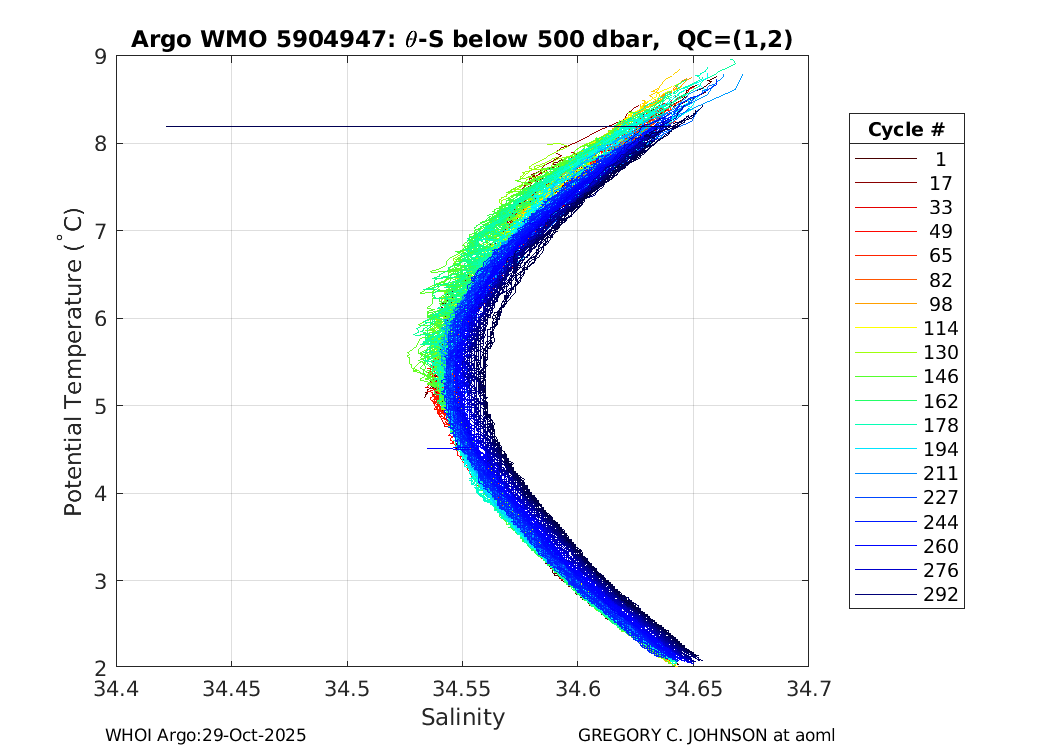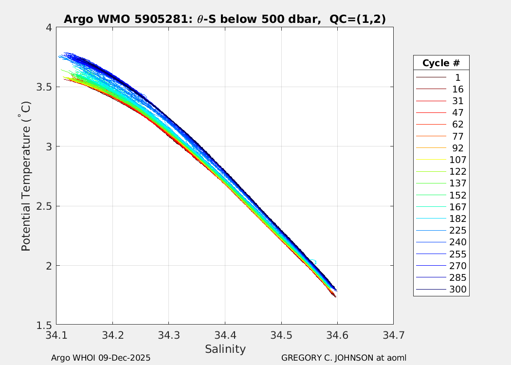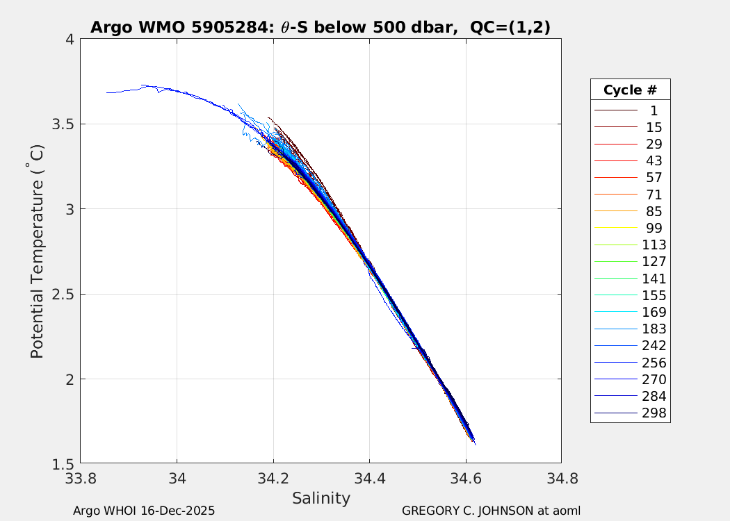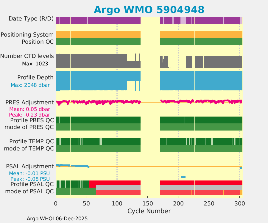 | WMO: #5904948 DAC: aoml PI: GREGORY C. JOHNSON NAVIS_A: #734 SBE41CP: #08641 DRUCK_2900PSIA: #10300608 Altimeter Comparison (IFREMER) EuroArgo Link | ![]() |