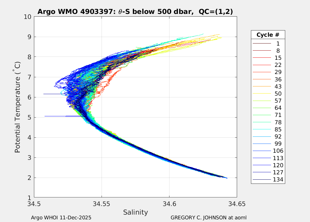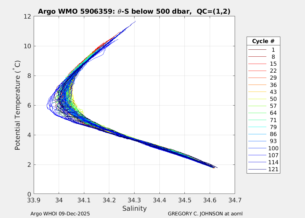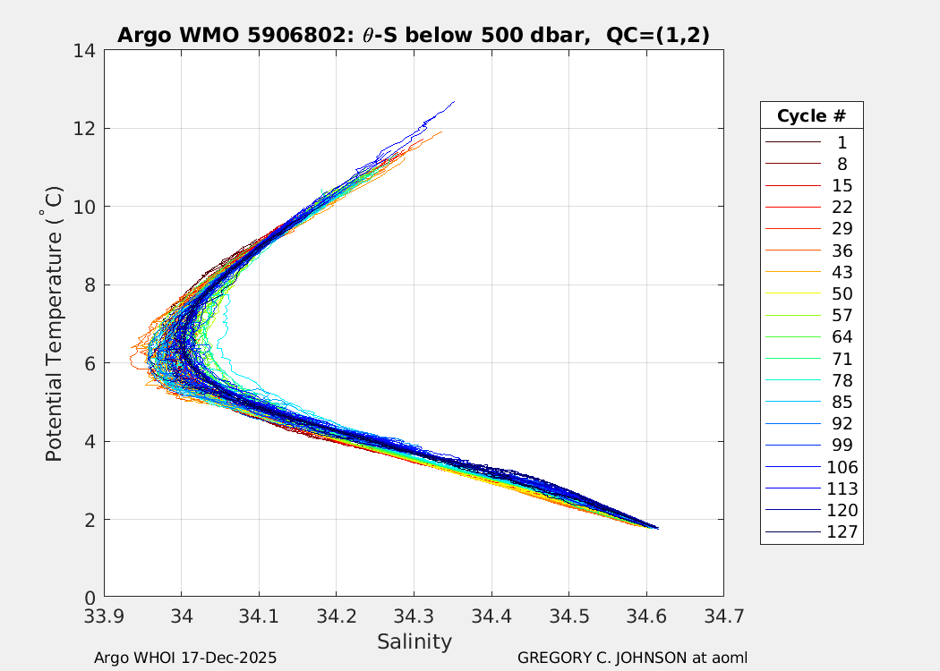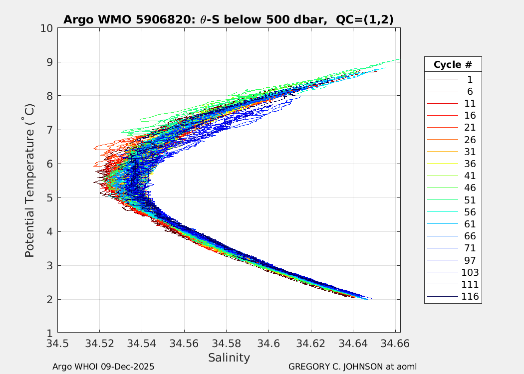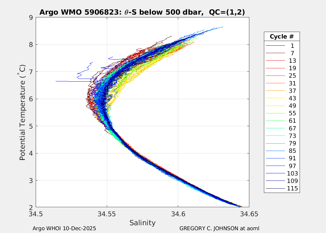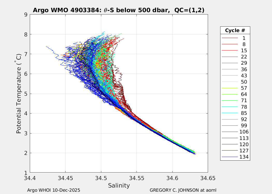 | WMO: #3902324 DAC: aoml PI: GREGORY C. JOHNSON SOLO_D MRV: #12058 SBE61: #5859 KISTLER_10153PSIA: #5277864 Altimeter Comparison (IFREMER) EuroArgo Link | ![]() |