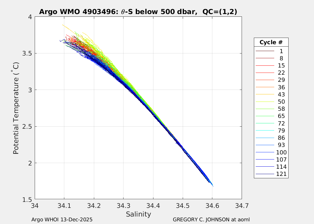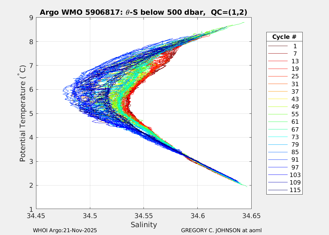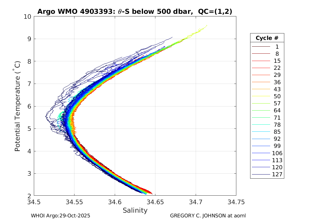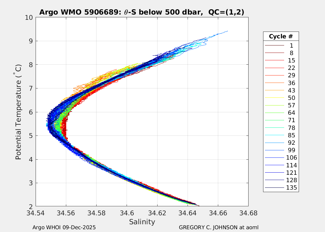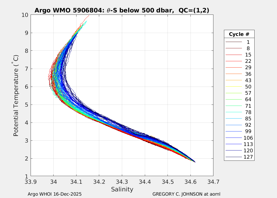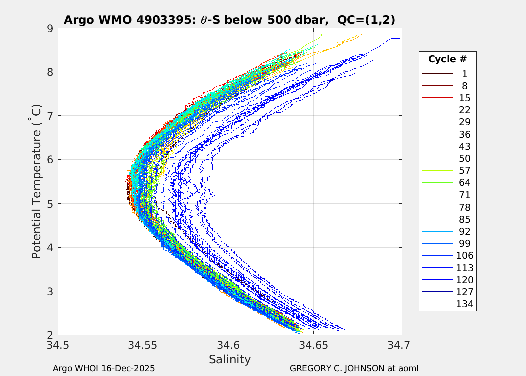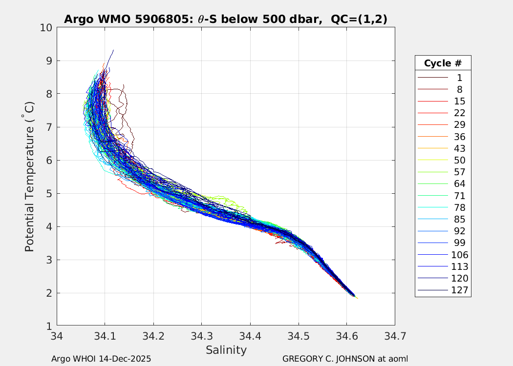 | WMO: #3902324 DAC: aoml PI: GREGORY C. JOHNSON SOLO_D MRV: #12058 SBE61: #5859 KISTLER_10153PSIA: #5277864 Altimeter Comparison (IFREMER) EuroArgo Link | ![]() |