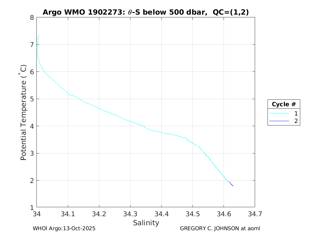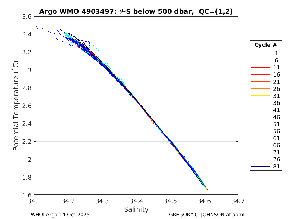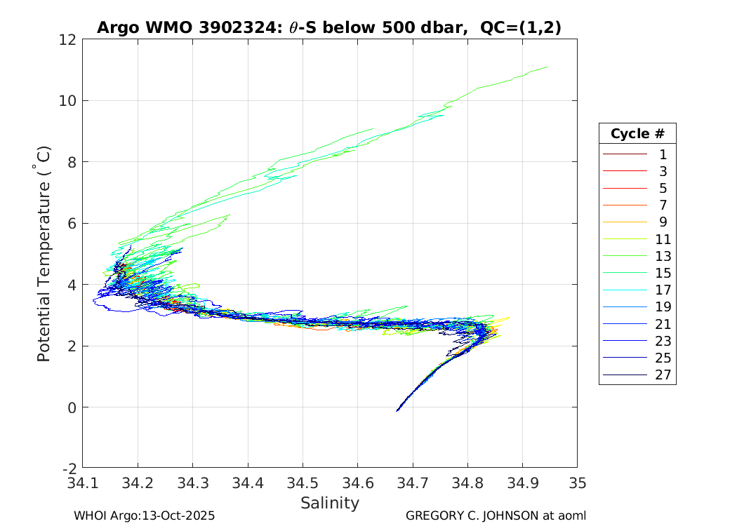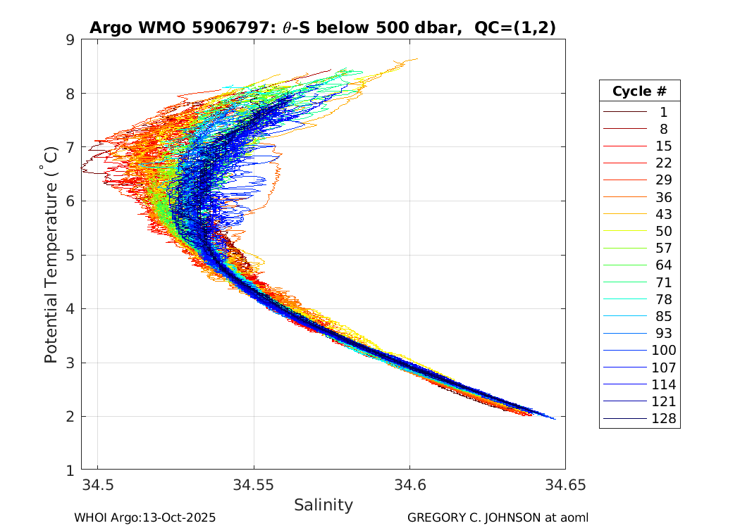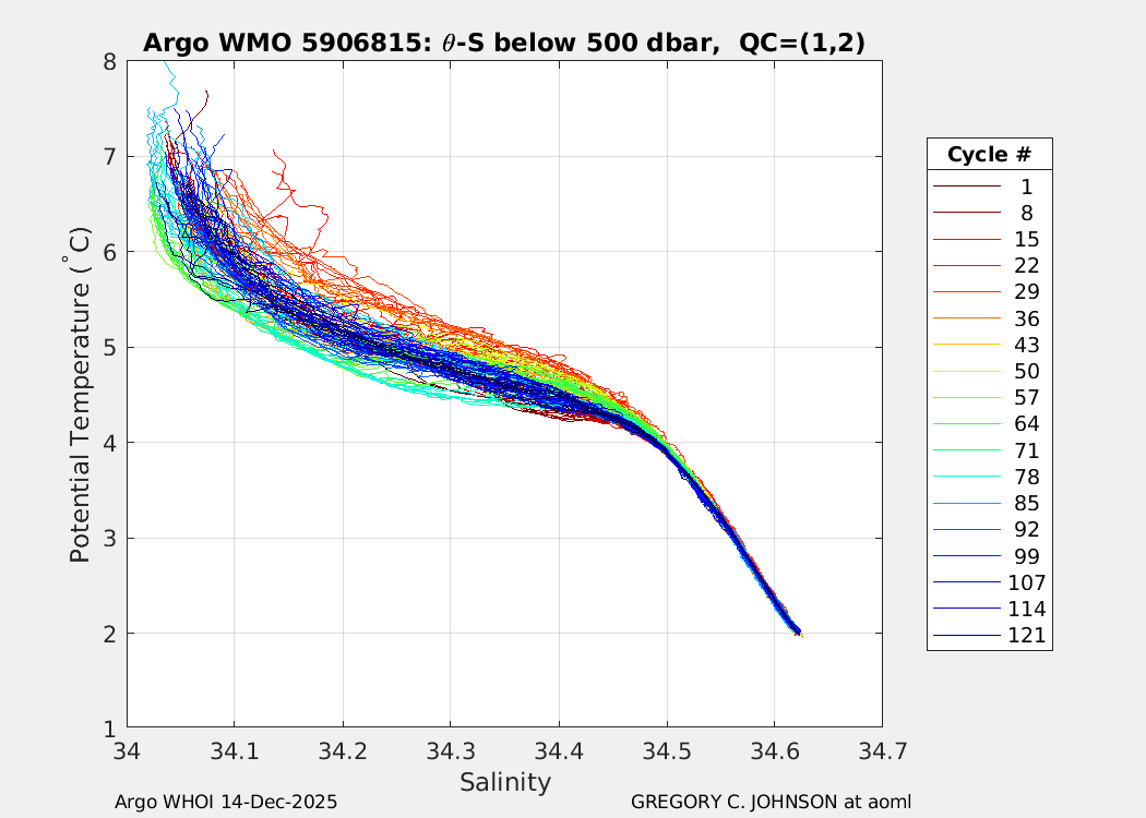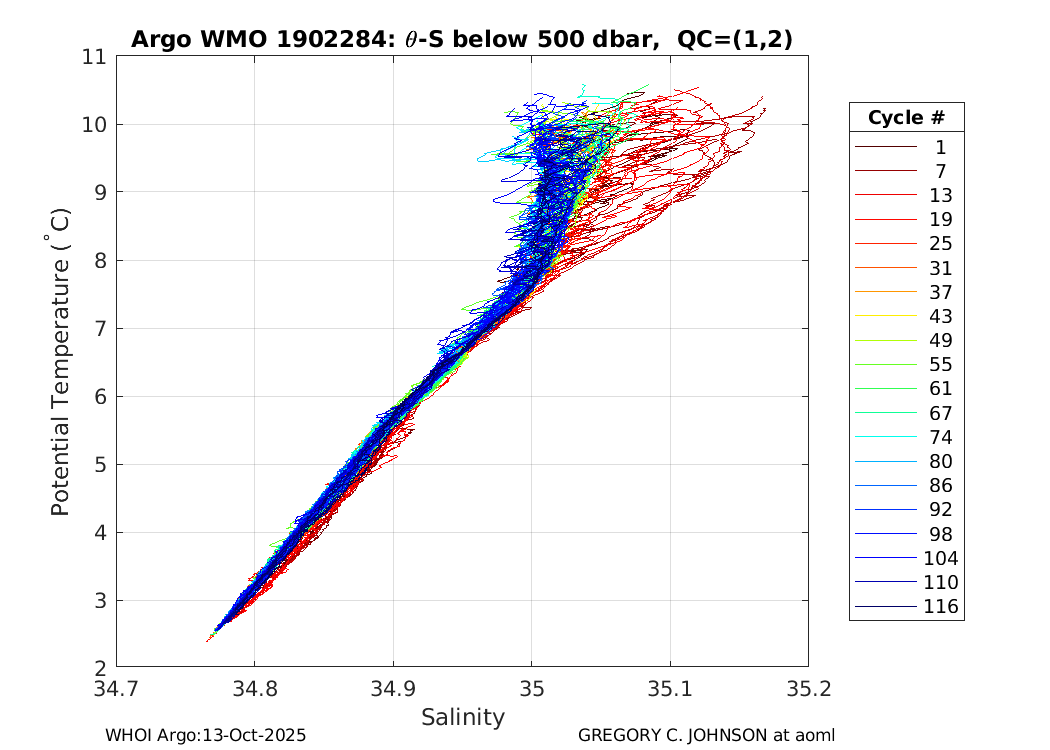 | WMO: #3902324 DAC: aoml PI: GREGORY C. JOHNSON SOLO_D MRV: #12058 SBE61: #5859 KISTLER_10153PSIA: #5277864 Altimeter Comparison (IFREMER) EuroArgo Link | ![]() |