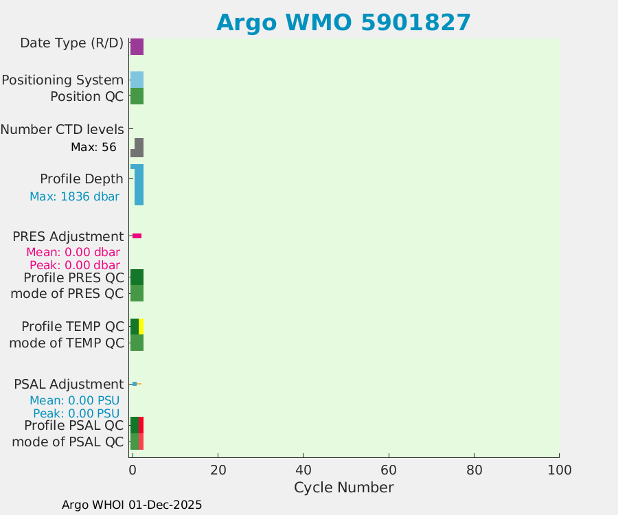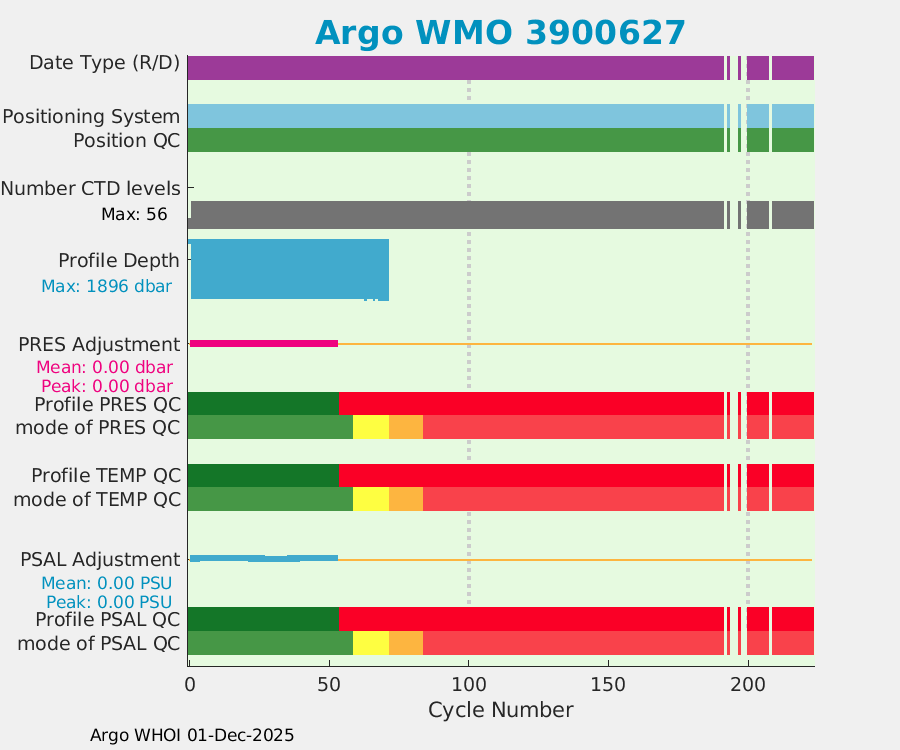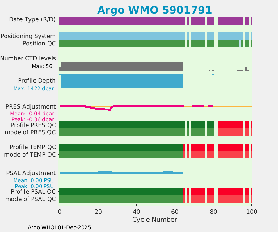 | WMO: #5901827 DAC: aoml PI: DEAN ROEMMICH SOLO: #2700 DRUCK_2900PSIA: #2385247 SBE41CP_V2: #1715 Altimeter Comparison (IFREMER) EuroArgo Link | n/a | n/a | ![]() |