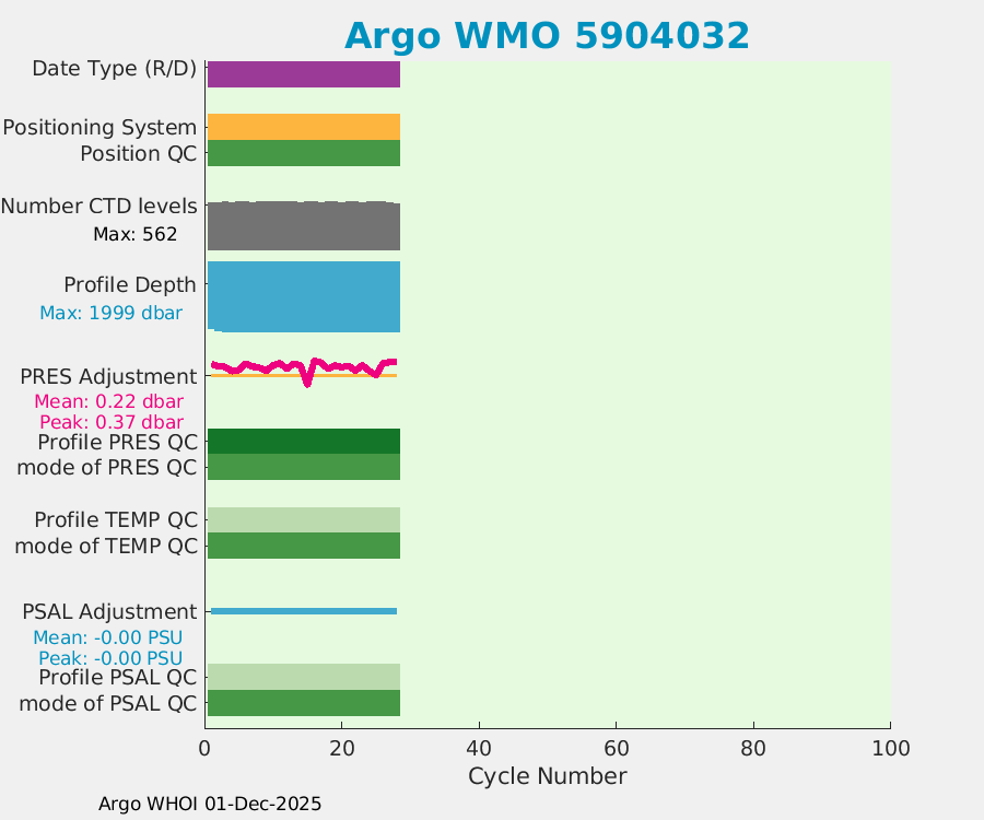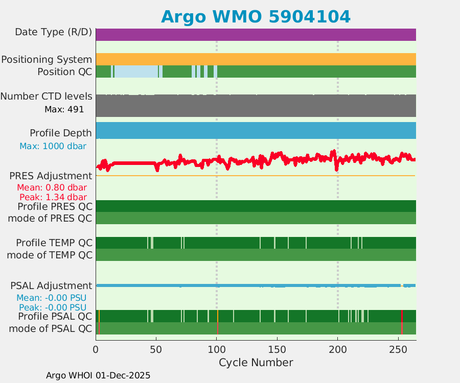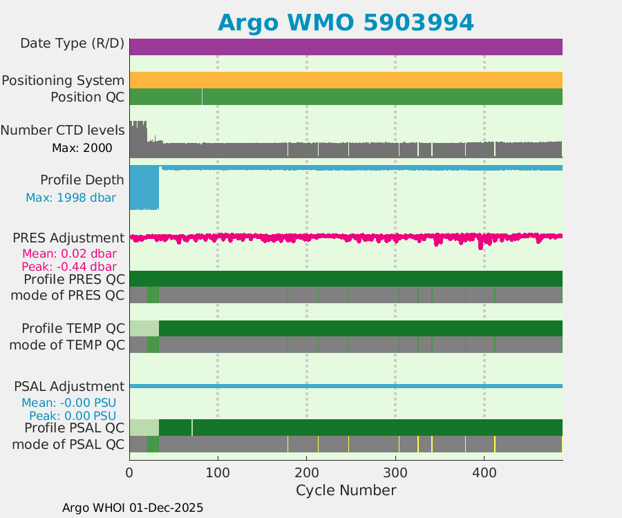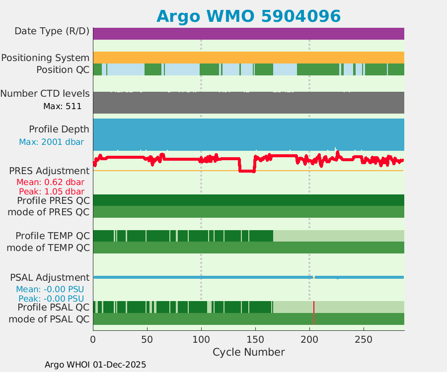 | WMO: #5904036 DAC: aoml PI: STEPHEN RISER APEX: #5376 SBE41CP: #3492 DRUCK_2900PSIA: #3192816 SBE63_OPTODE: #0226 Altimeter Comparison (IFREMER) EuroArgo Link | ![]() |