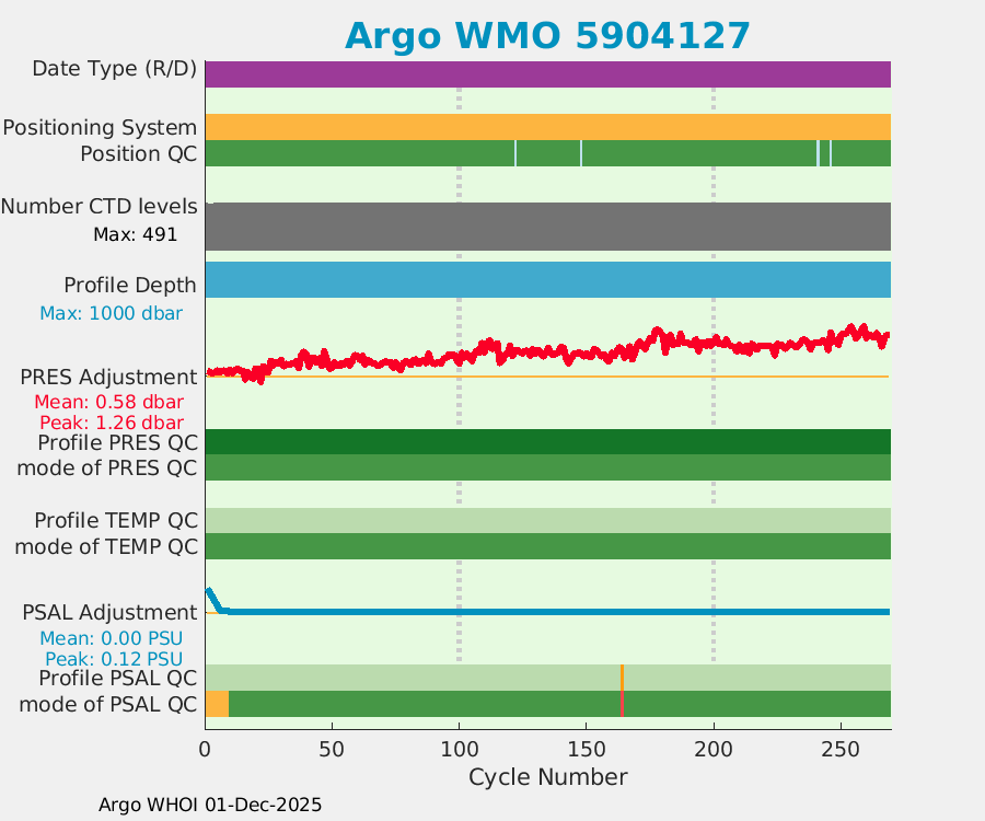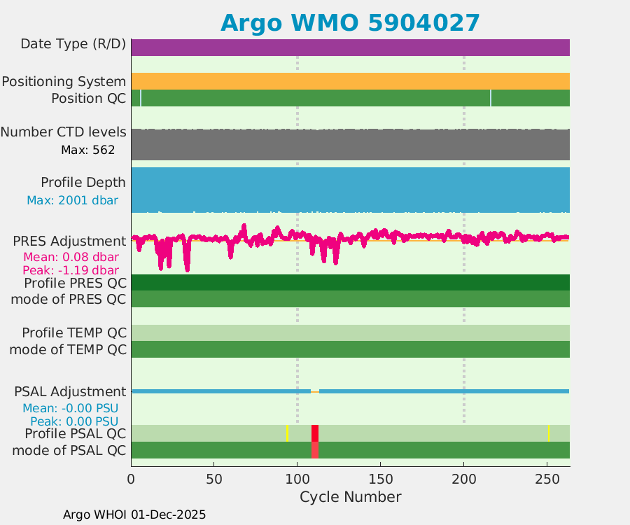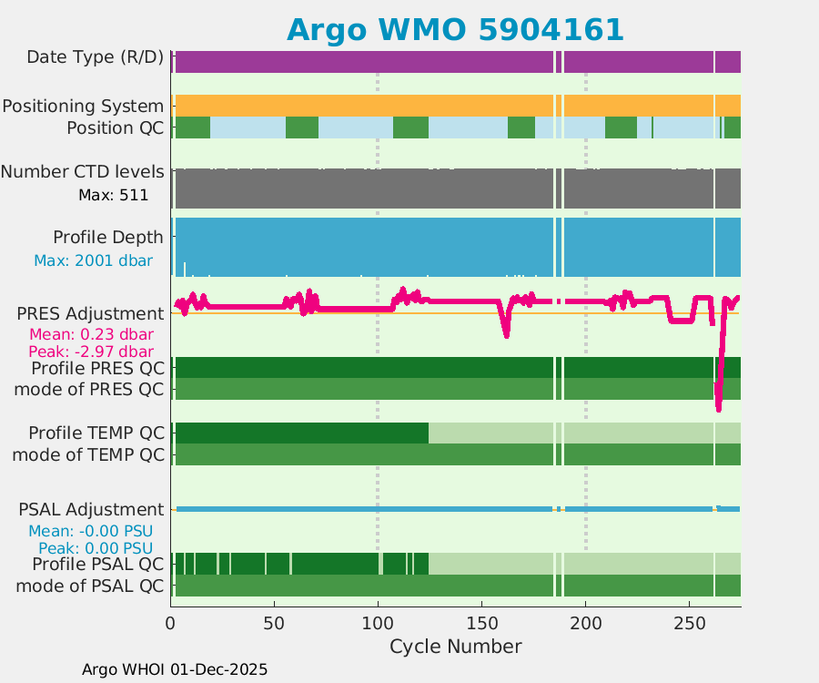 | WMO: #5903417 DAC: aoml PI: STEPHEN RISER APEX: #6433 SBE41: #5999 DRUCK_2900PSIA: #3487995 Altimeter Comparison (IFREMER) EuroArgo Link | ![]() |