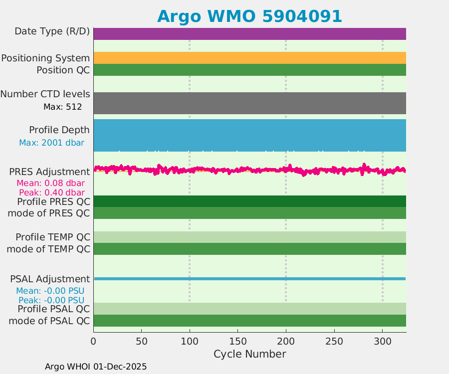 | WMO: #5904091 DAC: aoml PI: STEPHEN RISER APEX: #5380 SBE41CP: #3491 DRUCK_2900PSIA: #3192813 SBE63_OPTODE: #0224 Altimeter Comparison (IFREMER) EuroArgo Link | ![]() |