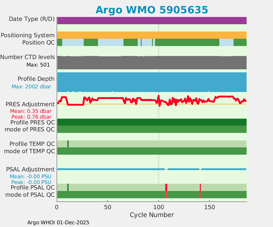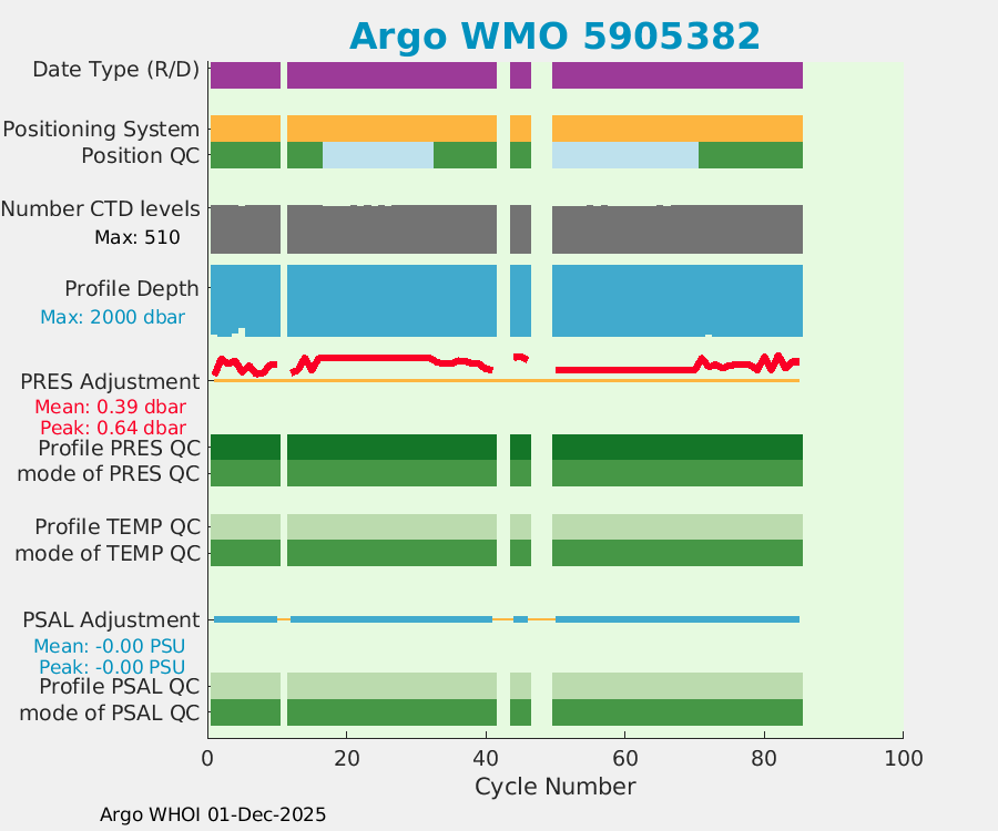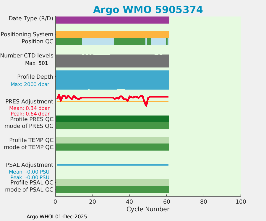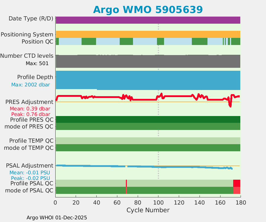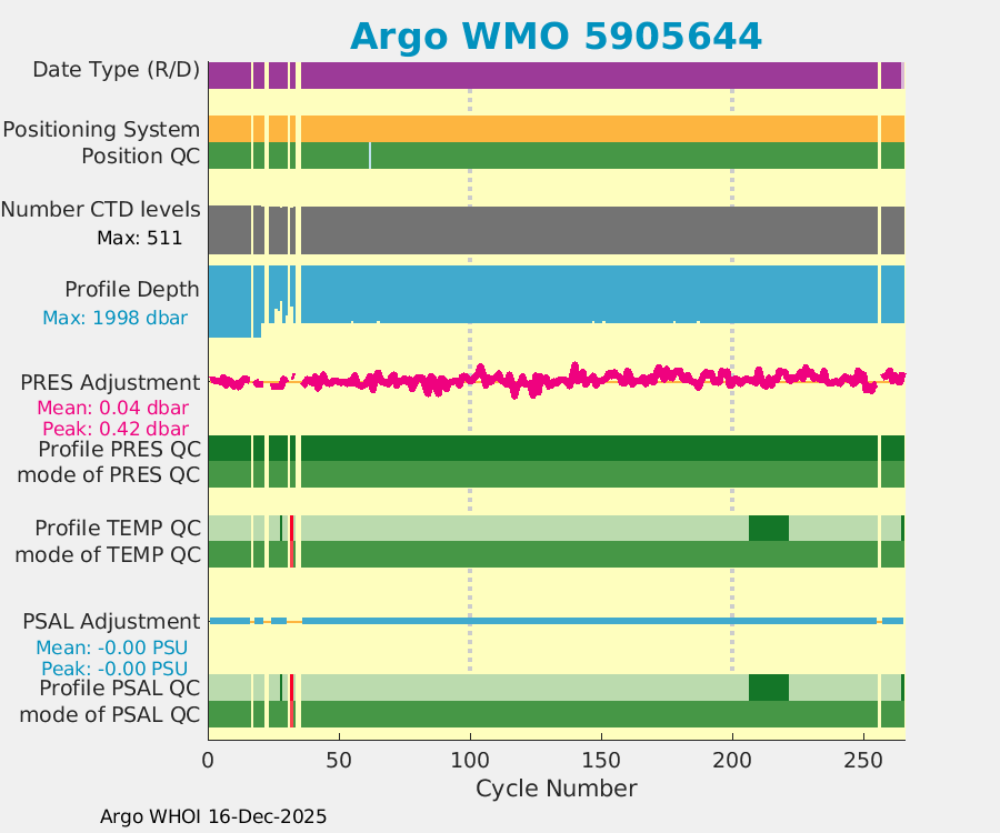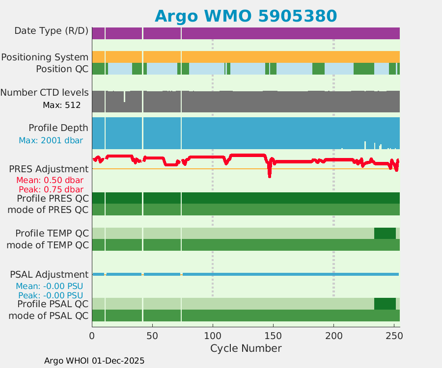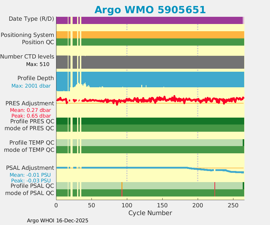 | WMO: #5905643 DAC: aoml PI: STEPHEN RISER APEX: #8277 SBE41CP: #9493 DRUCK_2900PSIA: #10444143 Altimeter Comparison (IFREMER) EuroArgo Link | ![]() |