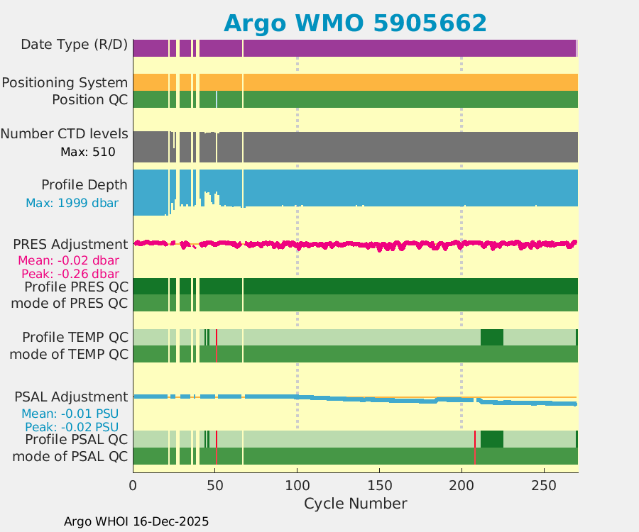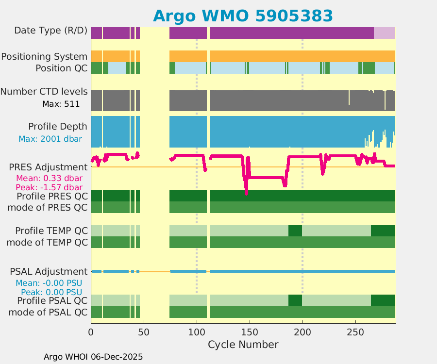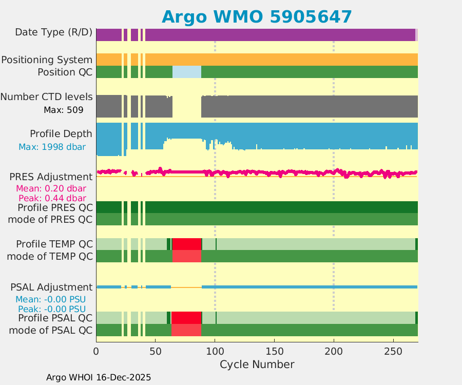 | WMO: #5905660 DAC: aoml PI: STEPHEN RISER APEX: #8269 SBE41CP: #9403 DRUCK_2900PSIA: #10467920 Altimeter Comparison (IFREMER) EuroArgo Link | ![]() |