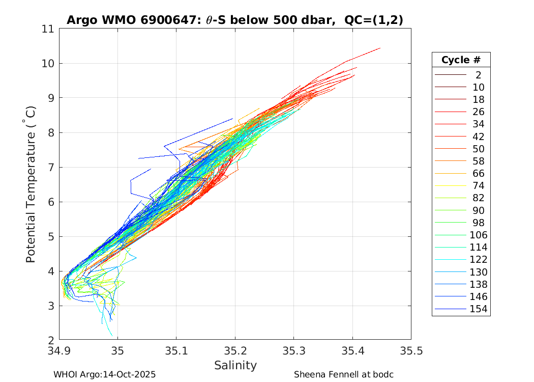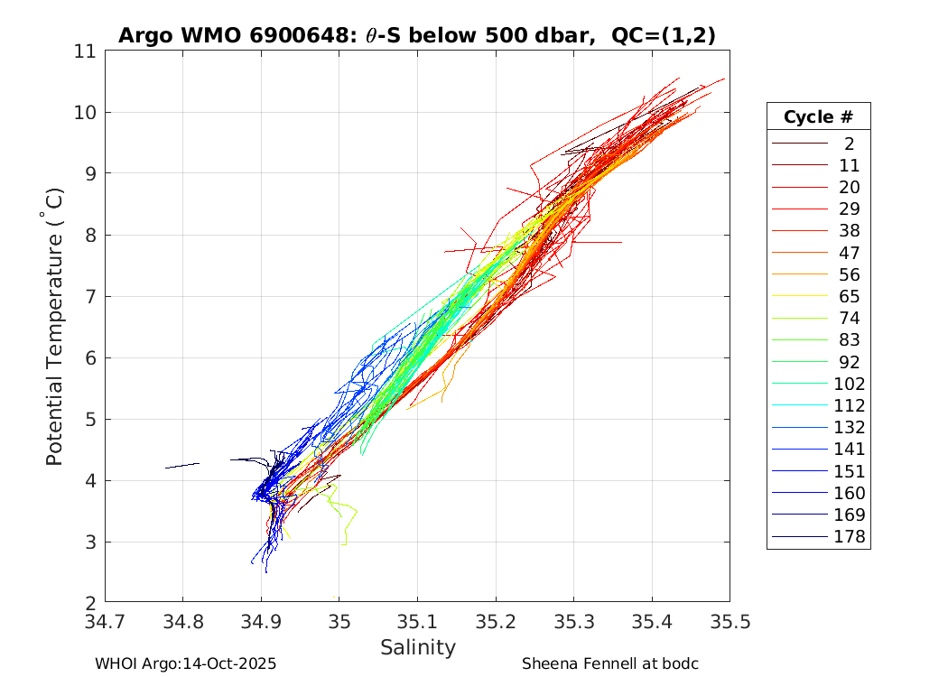 | WMO: #6900648 DAC: bodc PI: Sheena Fennell APEX: #3651 DRUCK_2900PSIA: #3843985 SBE41: #5332 Altimeter Comparison (IFREMER) EuroArgo Link | ![]() |