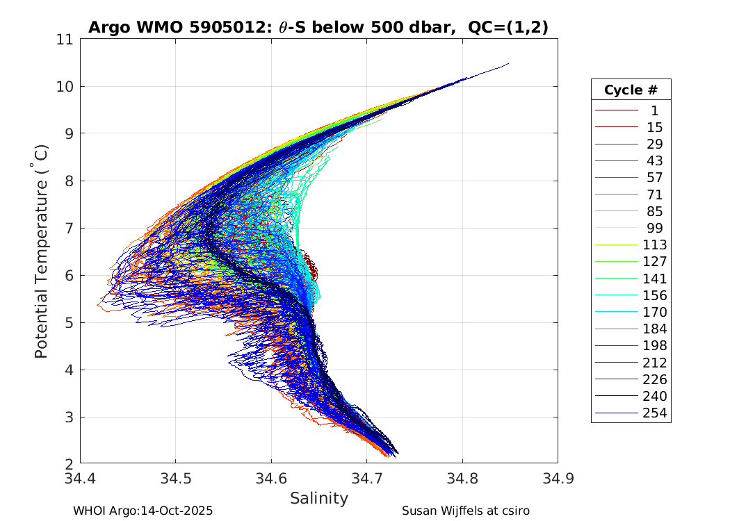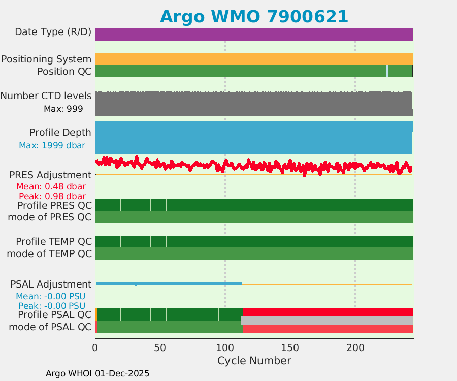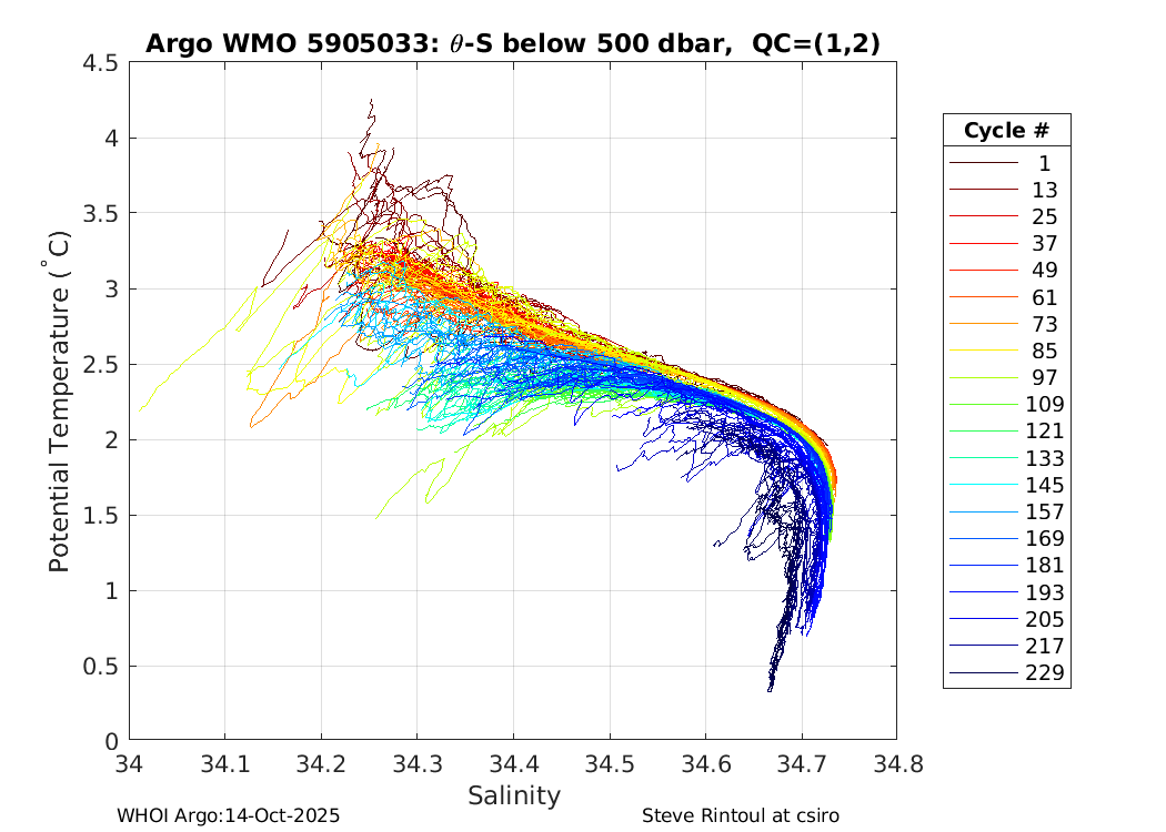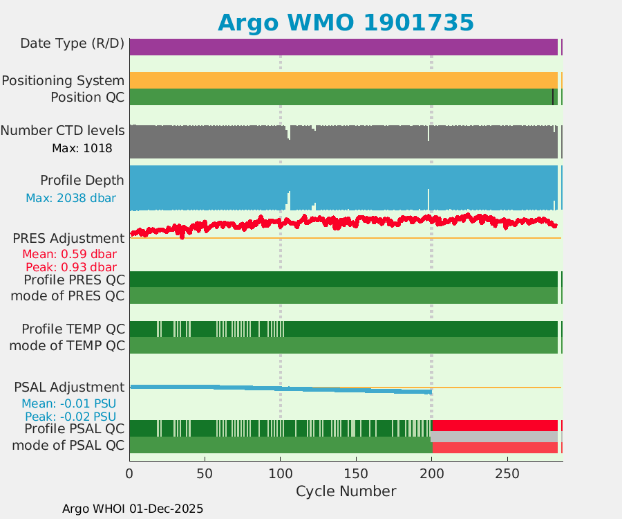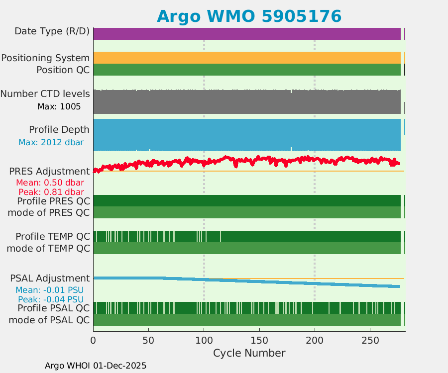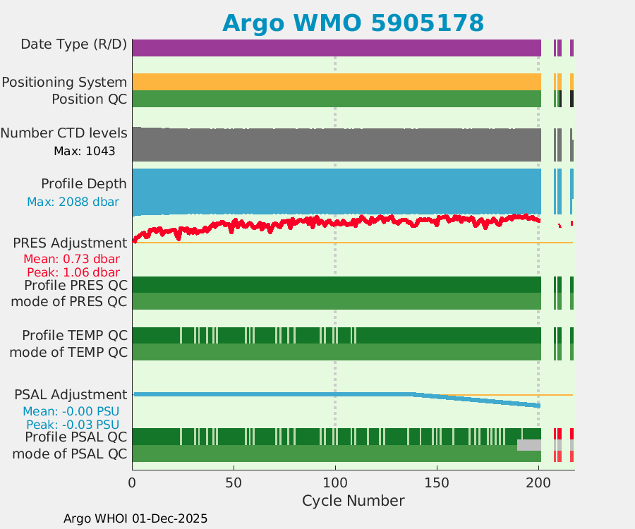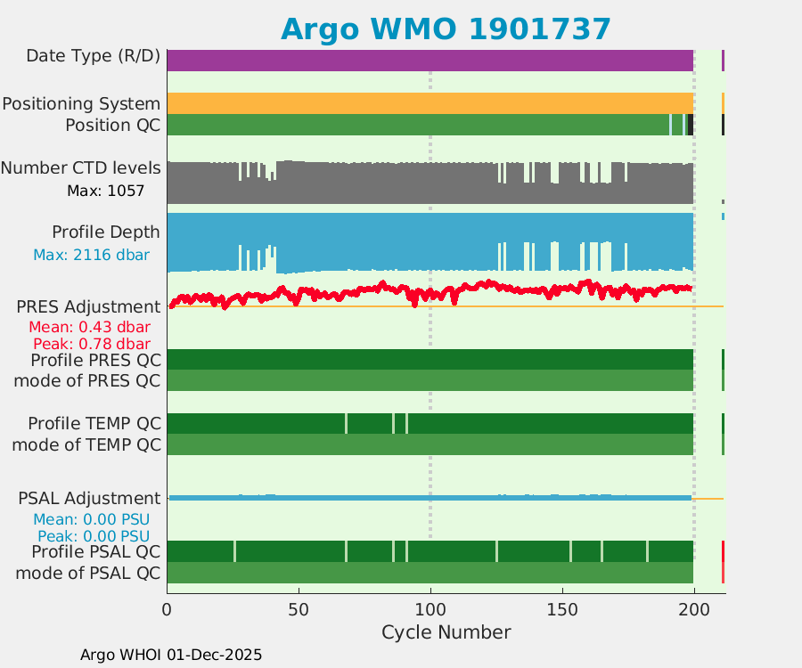 | WMO: #5905191 DAC: csiro PI: Susan Wijffels NAVIS_EBR: #763 SBE41CP_V7.2.5: #8633 DRUCK: #10300736 Altimeter Comparison (IFREMER) EuroArgo Link | ![]() |