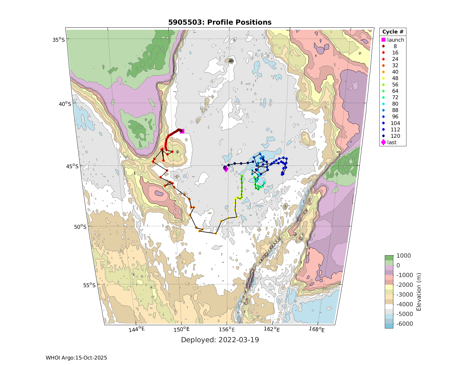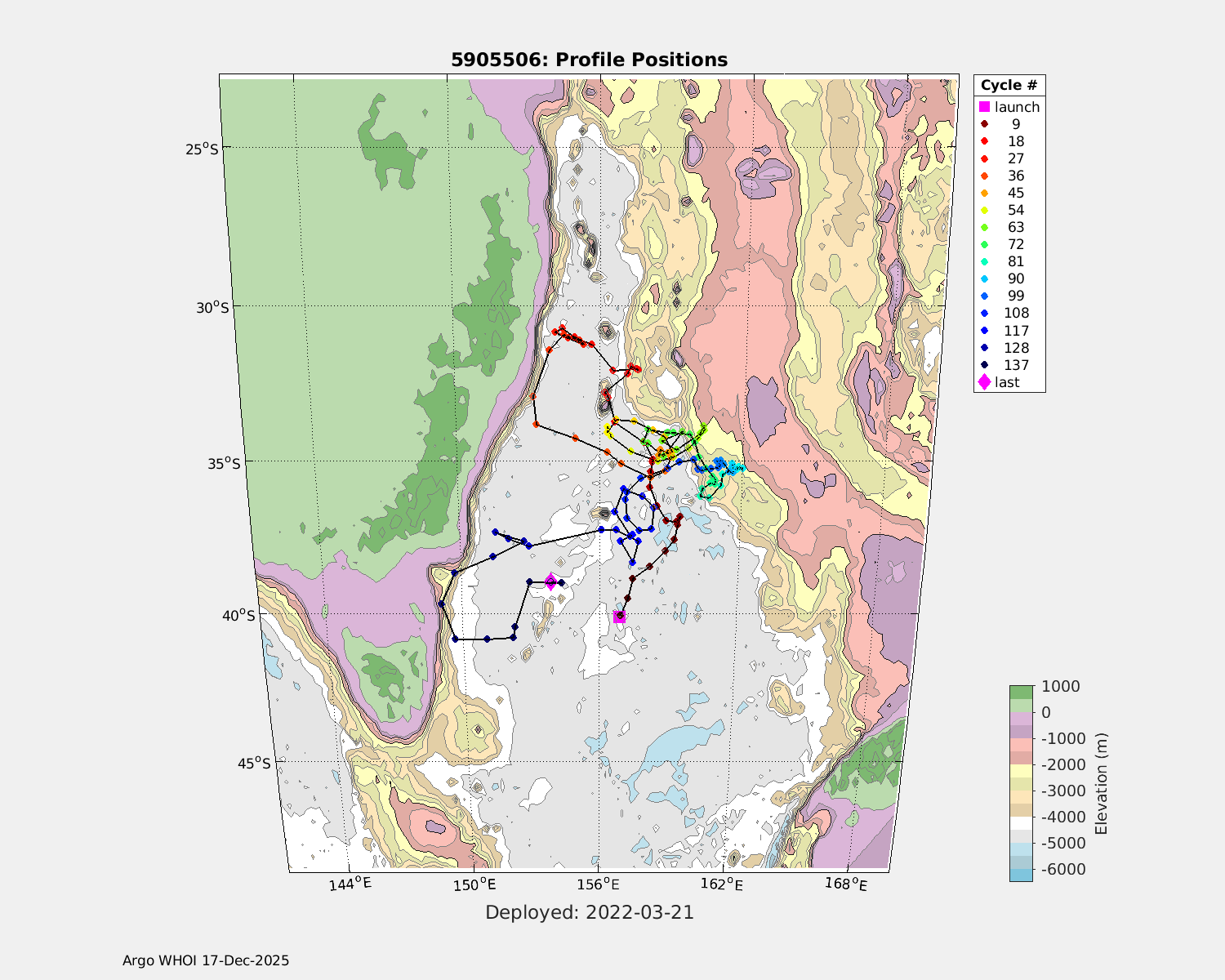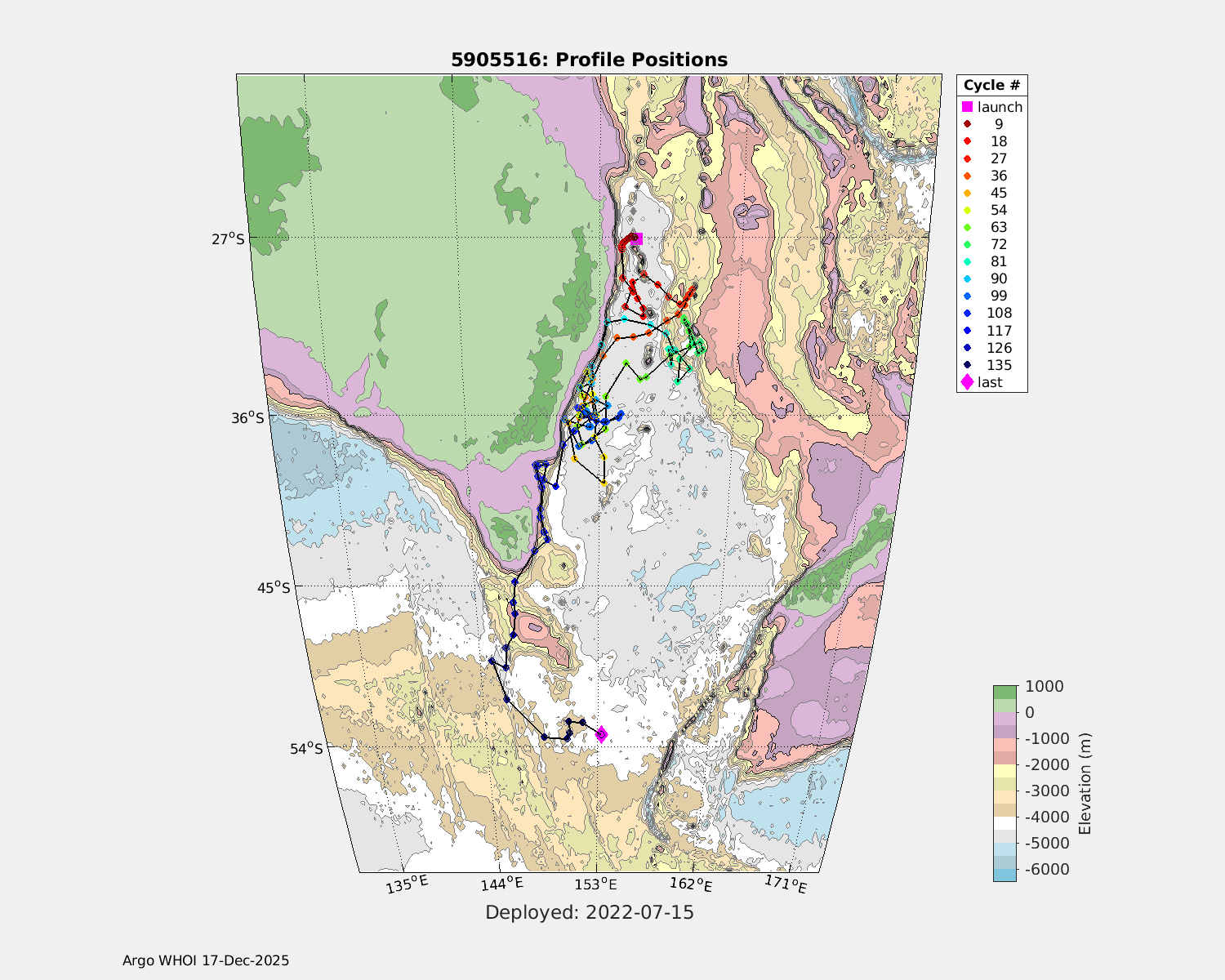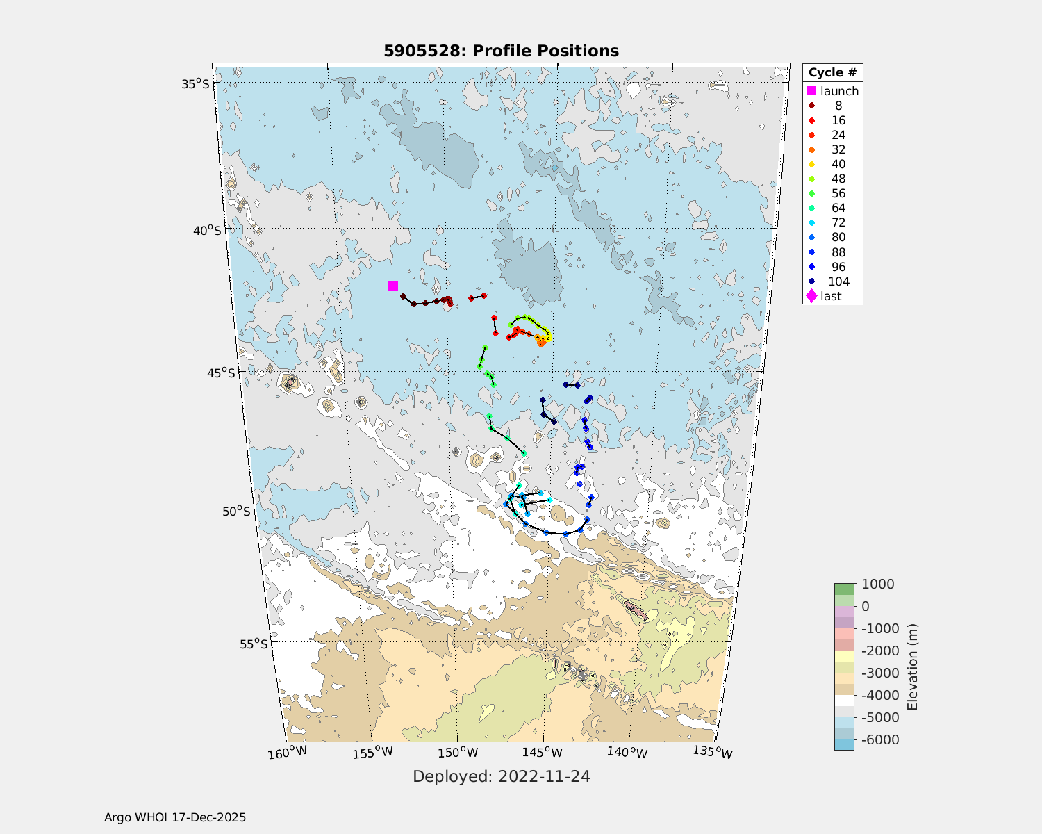 | WMO: #5905505 DAC: csiro PI: Tom TRULL PROVOR_III: # SBE41CP: #16652 AANDERAA_OPTODE_4330: #3814 ECO_FLBB2: #7120 SATLANTIC_OCR504_ICSW: #2258 SUNA_V2: #1823 SEAFET: #11140 Altimeter Comparison (IFREMER) EuroArgo Link | ![]() |