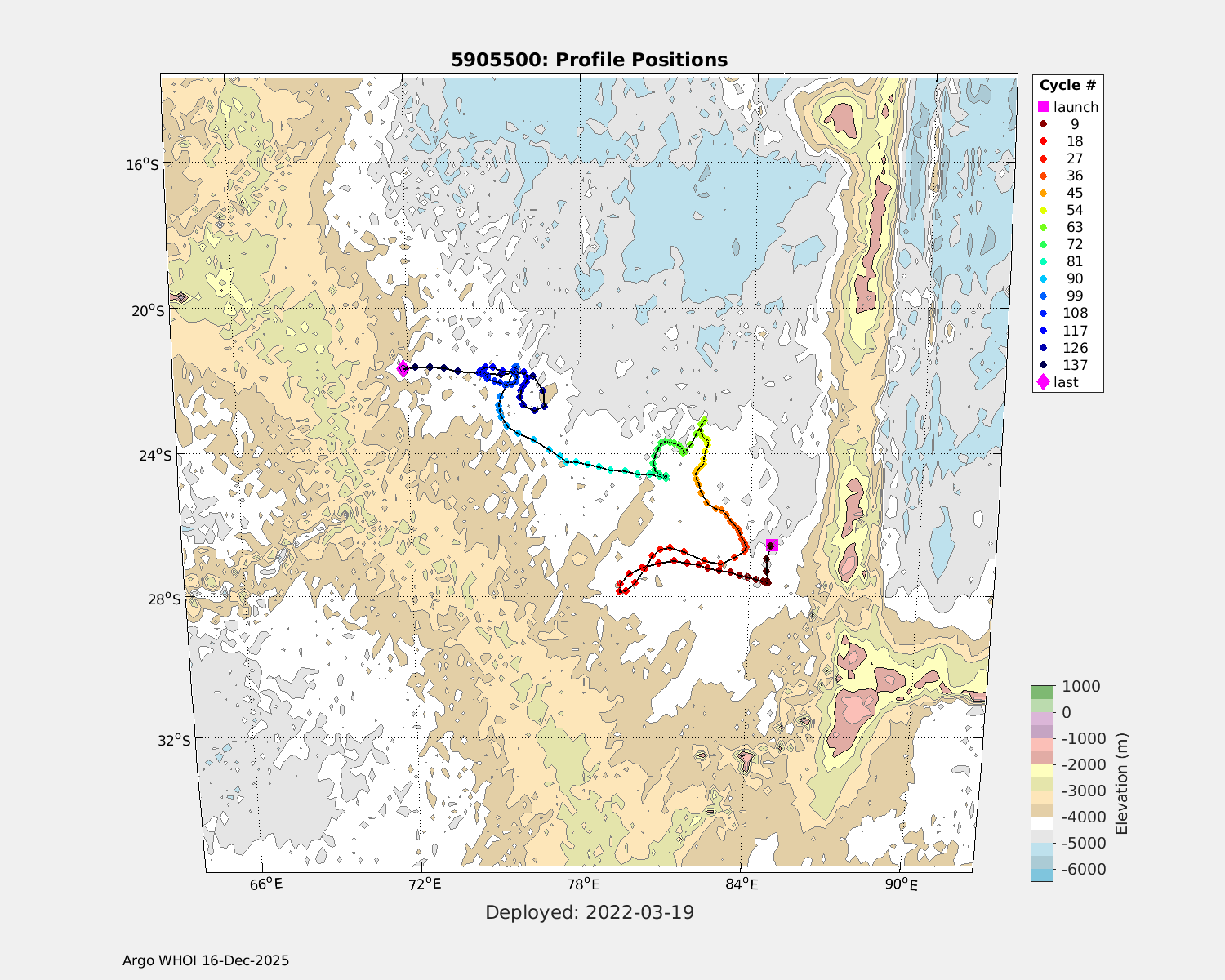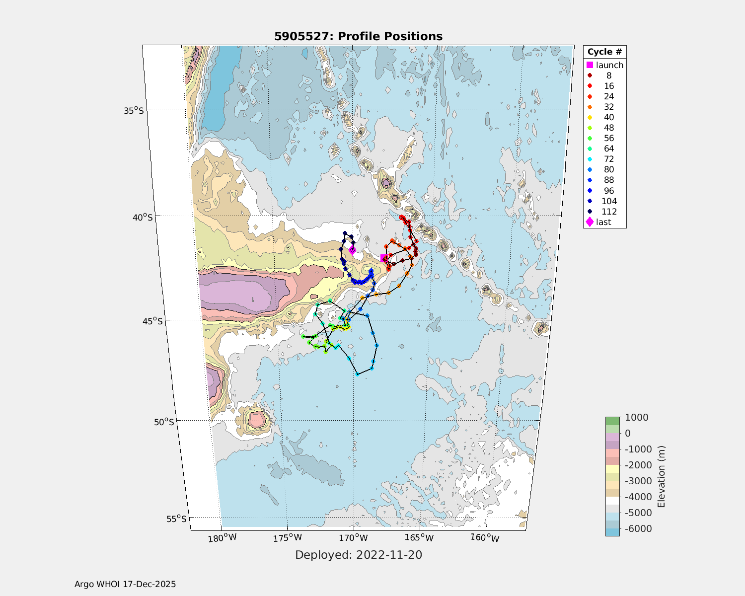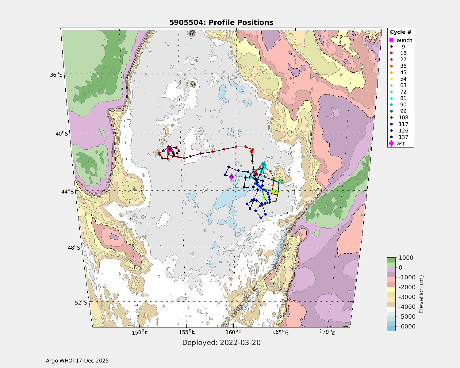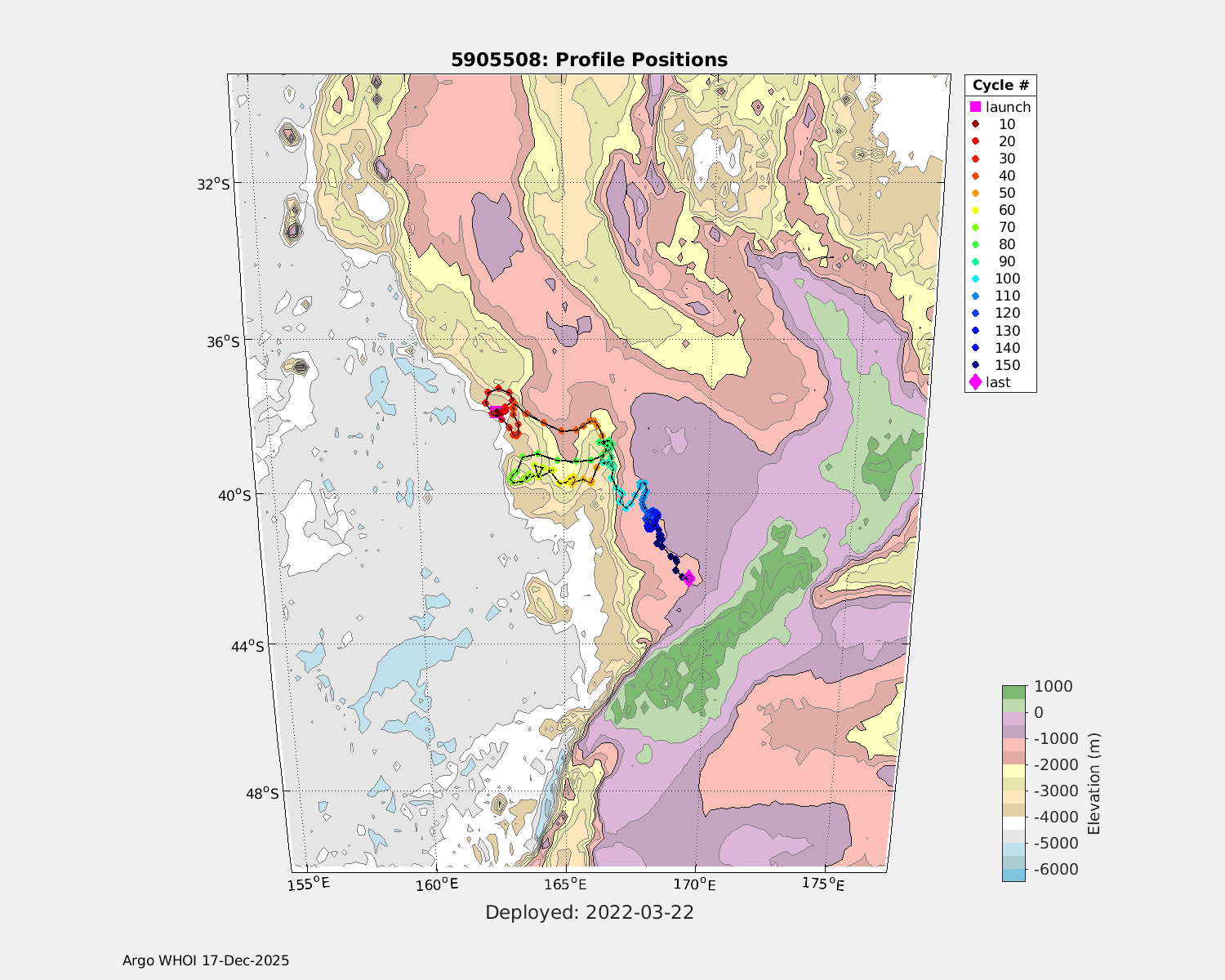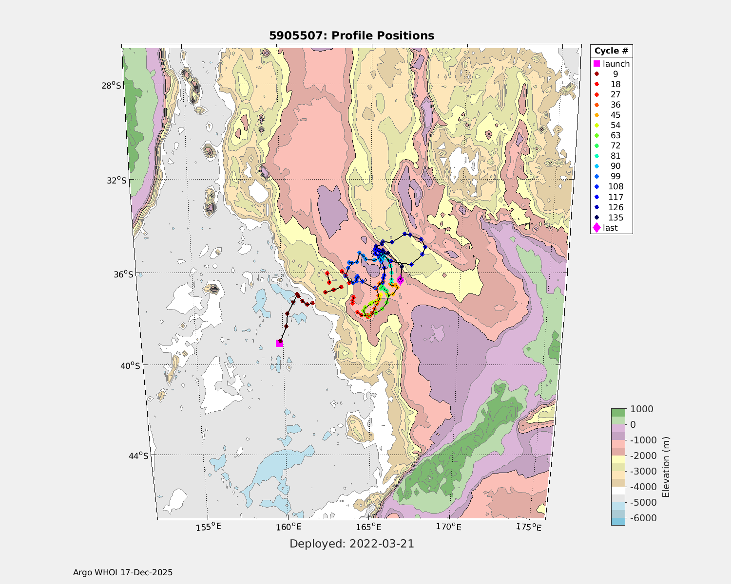 | WMO: #5905505 DAC: csiro PI: Tom TRULL PROVOR_III: # SBE41CP: #16652 AANDERAA_OPTODE_4330: #3814 ECO_FLBB2: #7120 SATLANTIC_OCR504_ICSW: #2258 SUNA_V2: #1823 SEAFET: #11140 Altimeter Comparison (IFREMER) EuroArgo Link | ![]() |