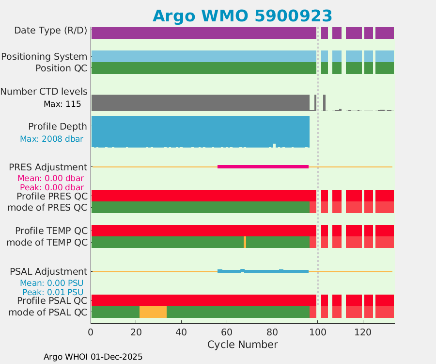 | WMO: #5900923 DAC: jma PI: JAMSTEC APEX: #1335 DRUCK: #5269 SBE41: #1404 Altimeter Comparison (IFREMER) EuroArgo Link | ![]() |