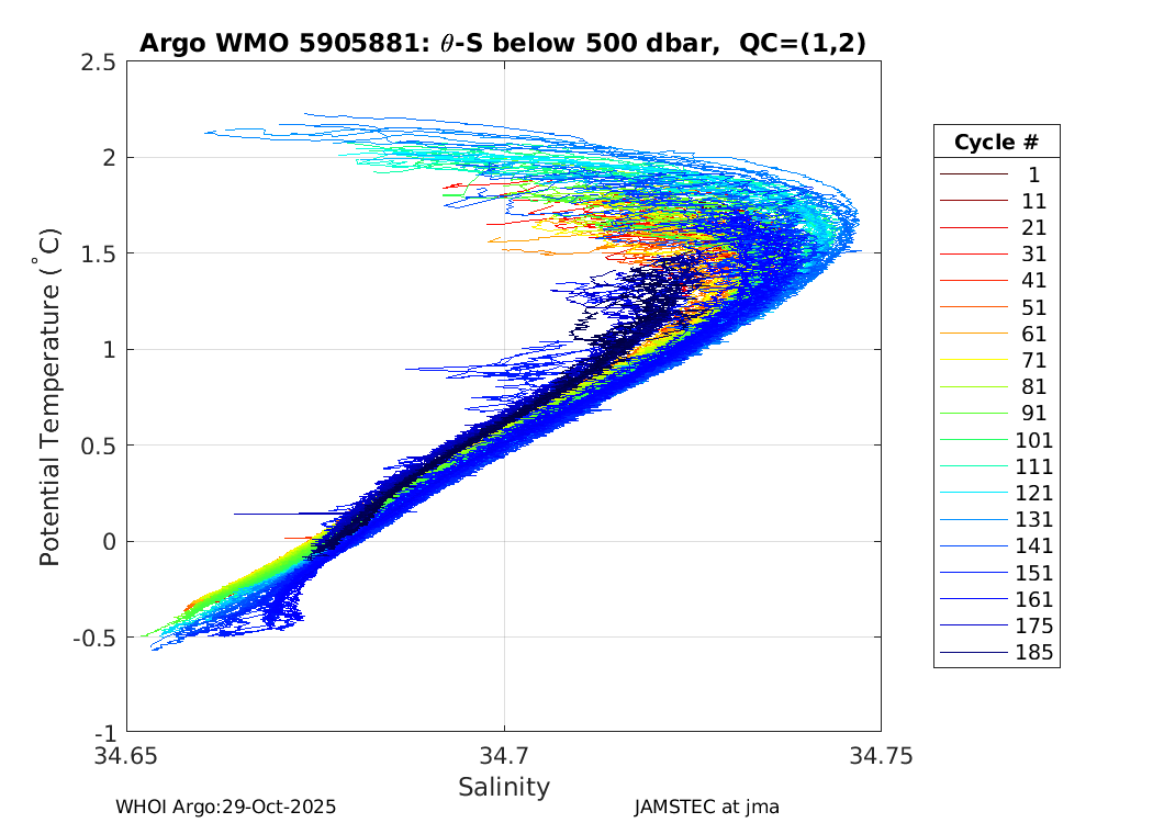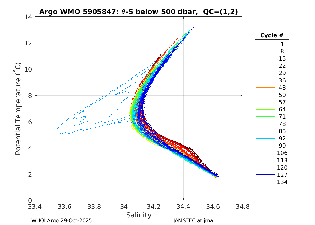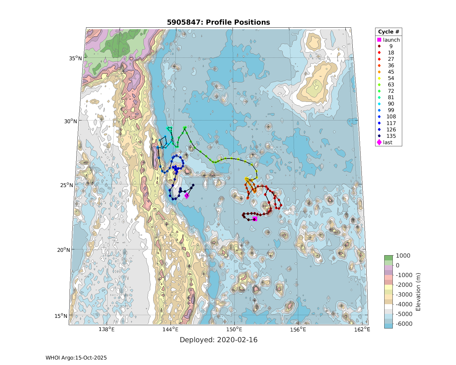 | WMO: #5905847 DAC: jma PI: JAMSTEC NAVIS_A: #921 DRUCK: #10746557 SBE41CP_V7.2.5: #10556 Altimeter Comparison (IFREMER) EuroArgo Link | ![]() |