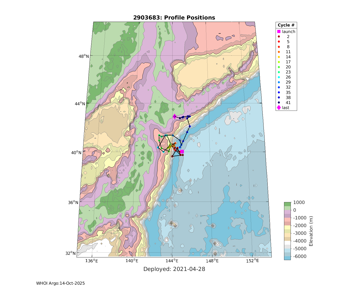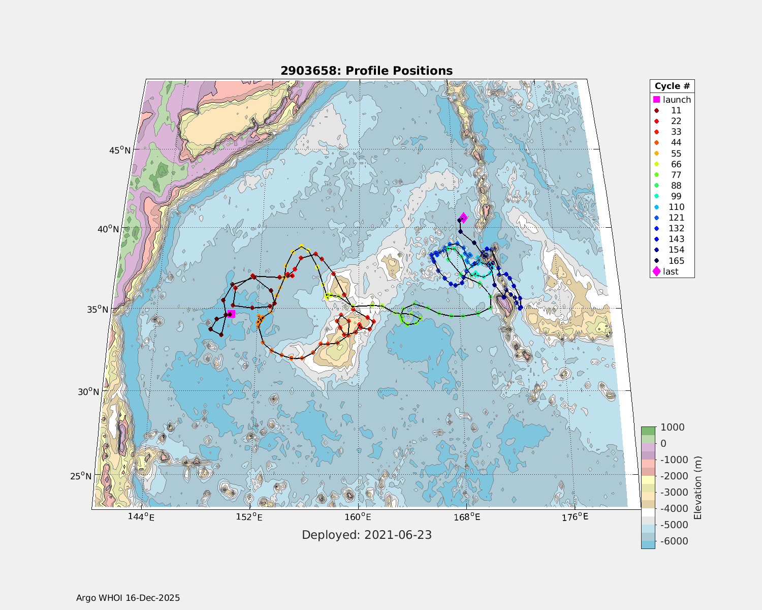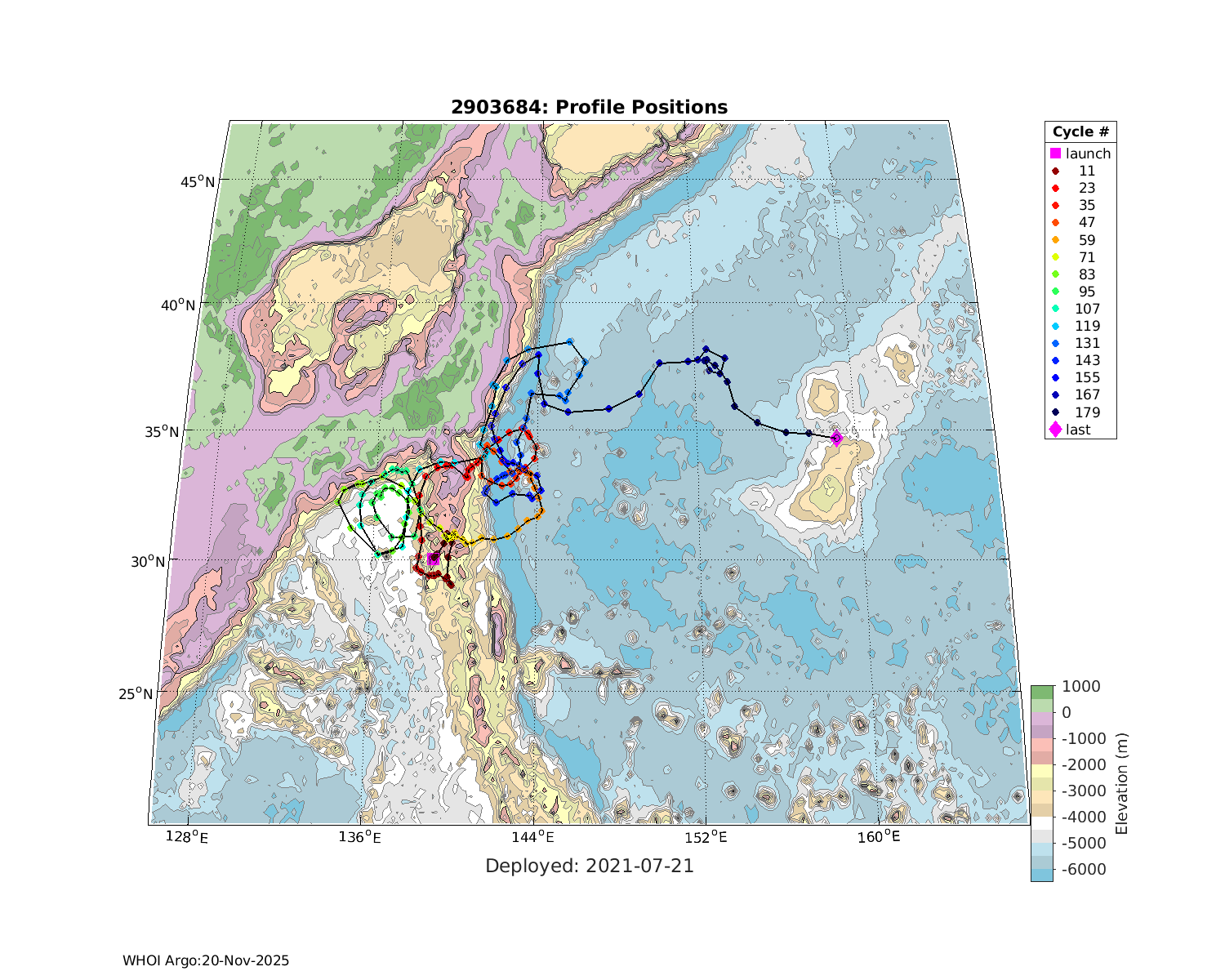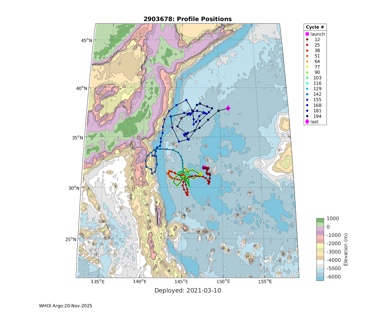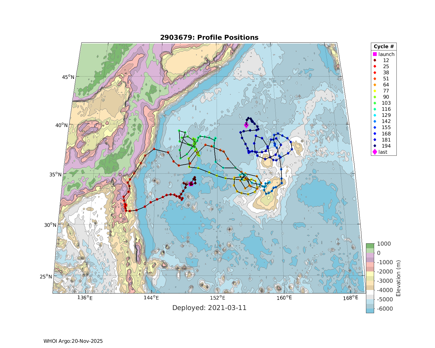 | WMO: #2903672 DAC: jma PI: JAMSTEC NAVIS_A: #883 SBE41N_V5.3.4: #10184 SBE63_OPTODE: #1771 MCOMS_FLBBCD: #151 SUNA_V2: #1099 Altimeter Comparison (IFREMER) EuroArgo Link | ![]() |
