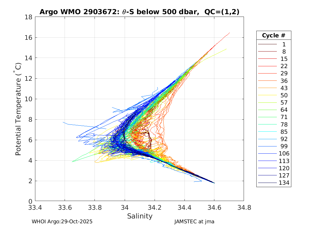 | WMO: #2903669 DAC: jma PI: JAMSTEC NAVIS_A: #957 SBE41N_V5.3.4: #11080 SBE63_OPTODE: #2027 MCOMS_FLBBCD: #171 SEAFET: #10245 Altimeter Comparison (IFREMER) EuroArgo Link | ![]() |