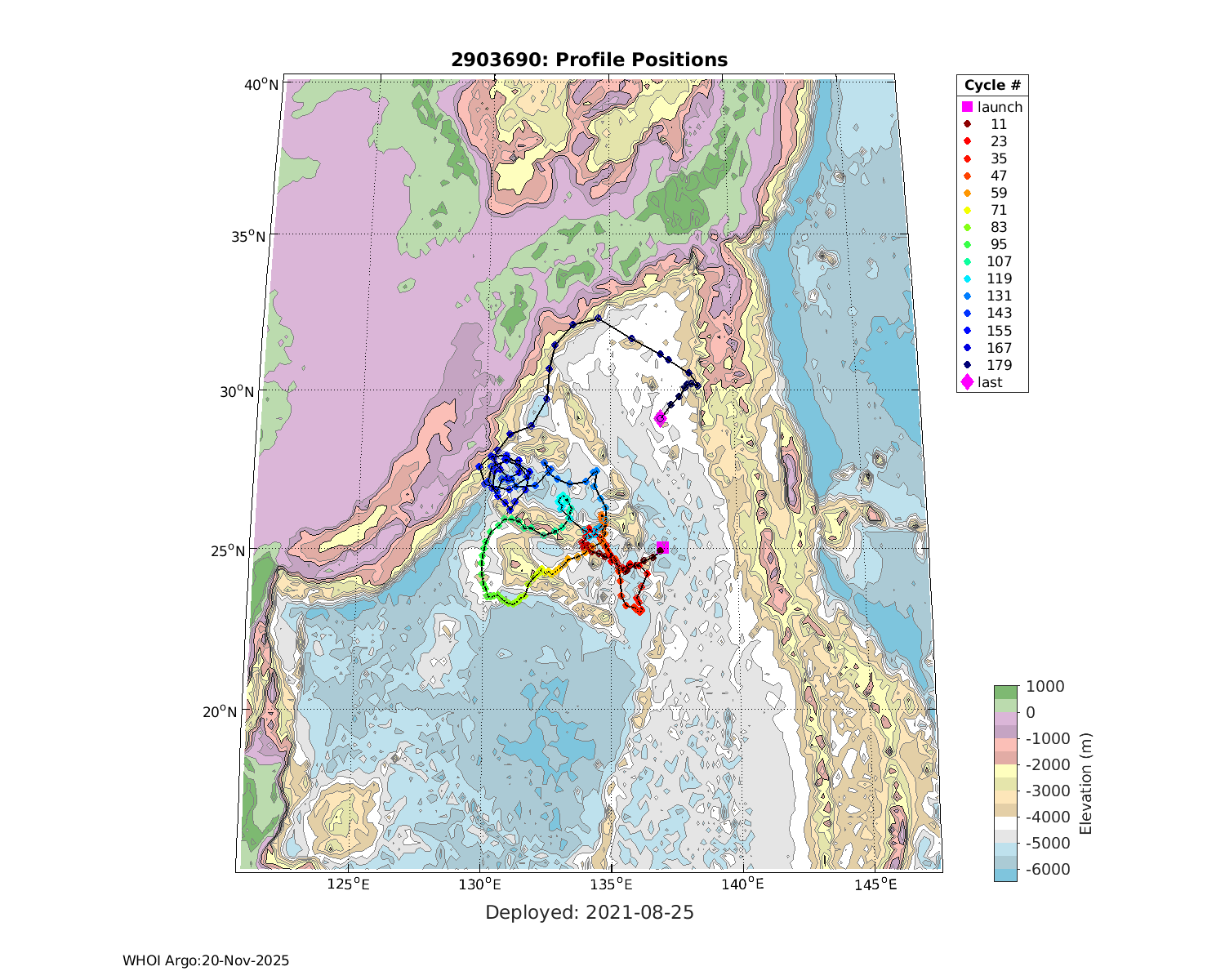| WMO: #2903670 DAC: jma PI: JAMSTEC NAVIS_A: #958 SBE41N: #11084 SBE63_OPTODE: #2036 MCOMS_FLBBCD: #168 SEAFET: #625 Altimeter Comparison (IFREMER) EuroArgo Link | ![]() |