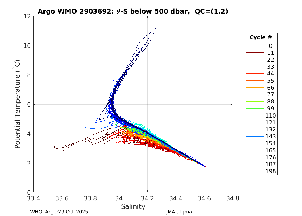 | WMO: #2903614 DAC: jma PI: JAMSTEC APEX: #9017 SBE41N_V5.3.4: #12476 ARO_FT: #0BC3003 SEAFET: #10457 Altimeter Comparison (IFREMER) EuroArgo Link | ![]() |