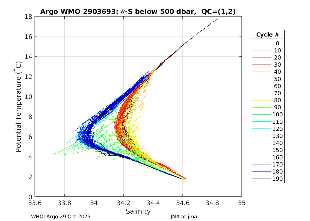 | WMO: #2903654 DAC: jma PI: JAMSTEC APEX: #9018 SBE41N_V5.3.4: #12478 ARO_FT: #0AKD016 SEAFET: #10476 Altimeter Comparison (IFREMER) EuroArgo Link | ![]() |