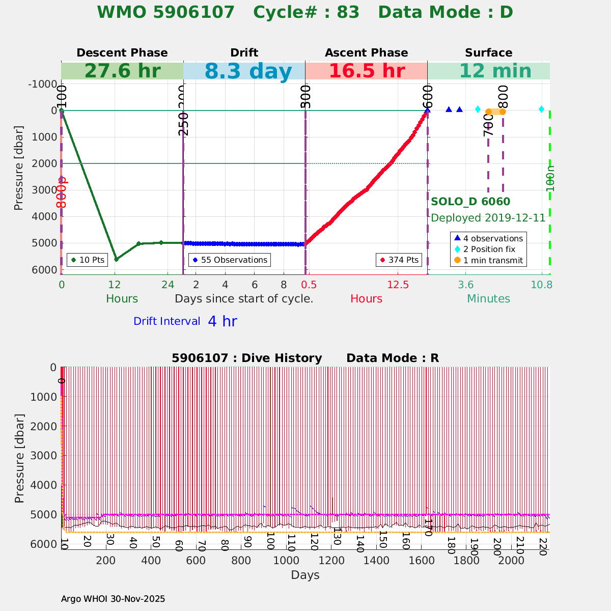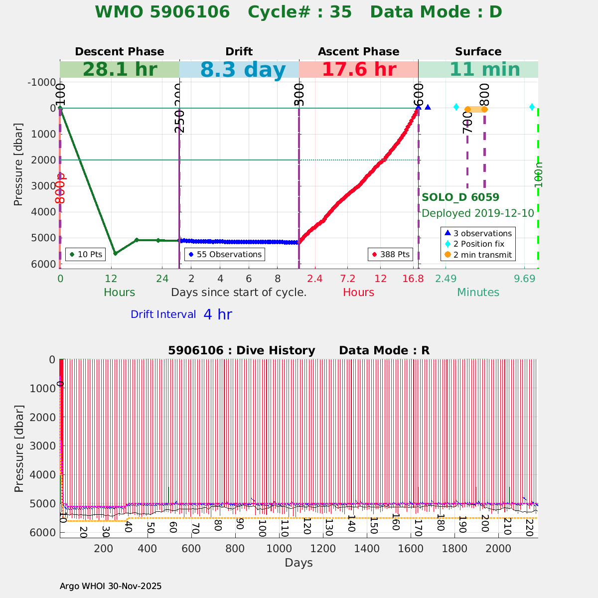 | WMO: #5906107 DAC: aoml PI: Dean ROEMMICH SOLO_D: #6060 KISTLER_10153PSIA: #5276583 SBE61: #5720 Altimeter Comparison (IFREMER) EuroArgo Link | ![]() |