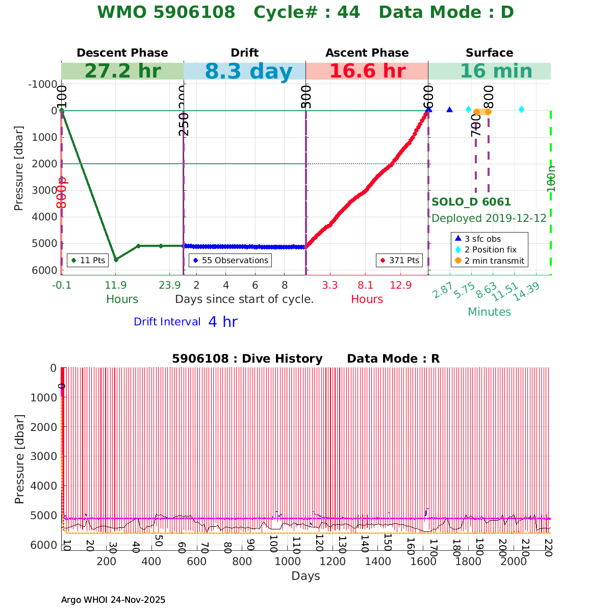 | WMO: #5906108 DAC: aoml PI: Dean ROEMMICH SOLO_D: #6061 KISTLER_10153PSIA: #5251172 SBE61: #5700 Altimeter Comparison (IFREMER) EuroArgo Link | ![]() |