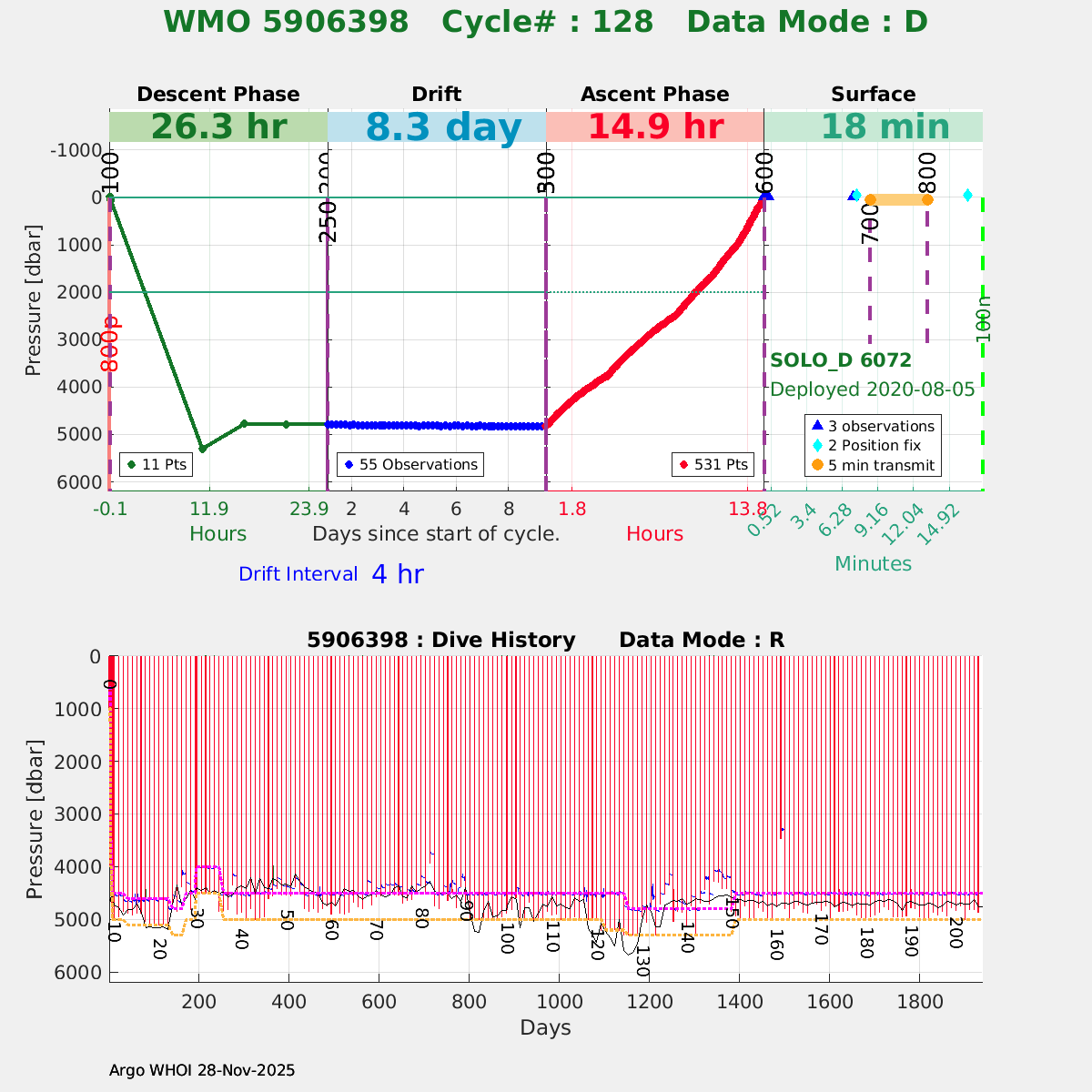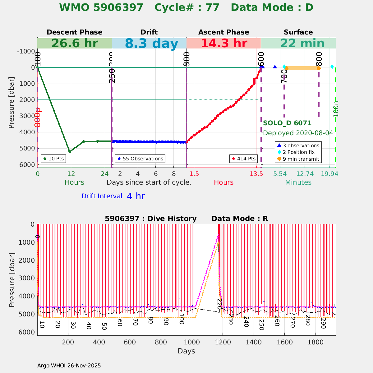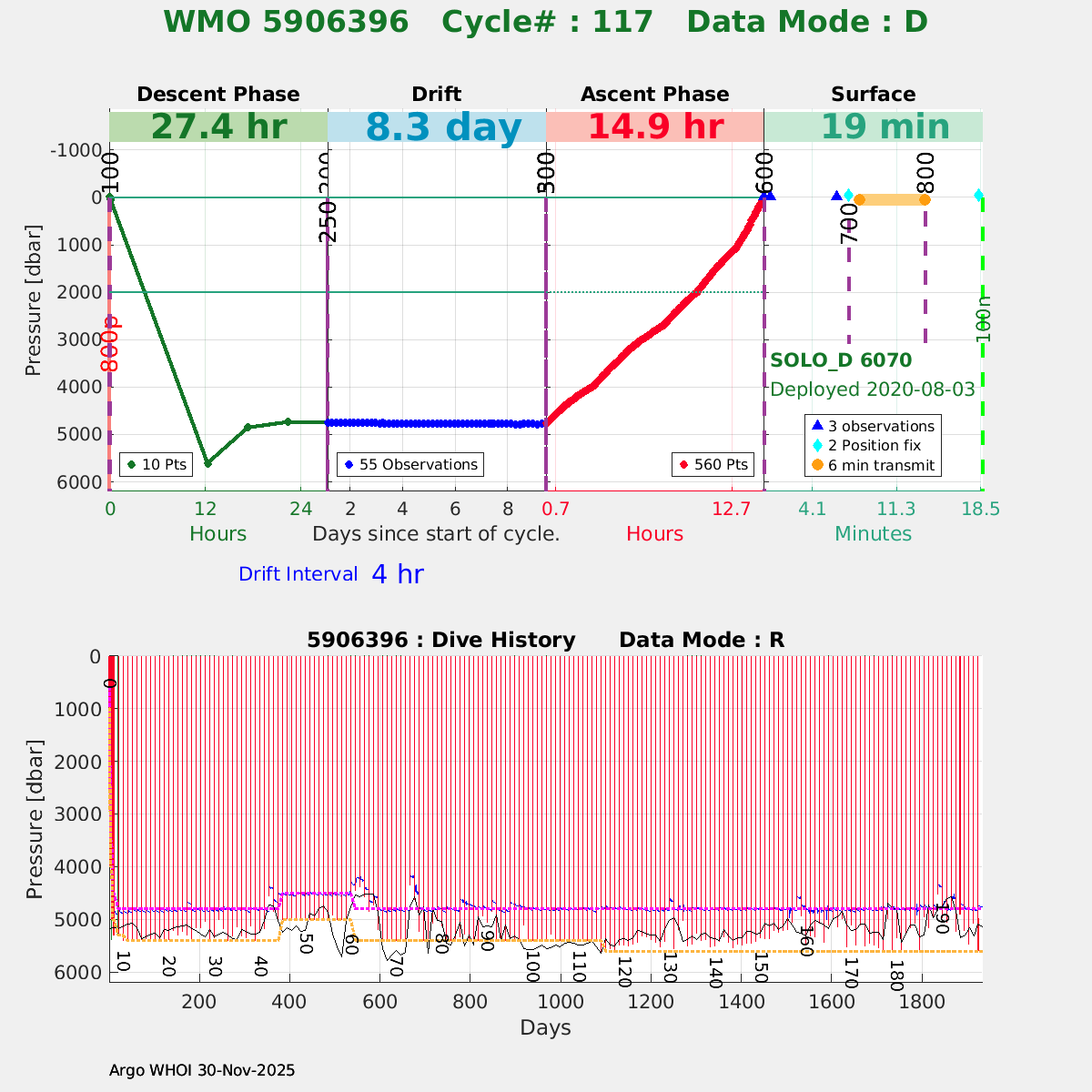 | WMO: #6903034 DAC: coriolis PI: Damien DESBRUYERES ARVOR_D: # KISTLER_10153PSIA: #5505558 SBE41CP_V7.2.5: #12266 AANDERAA_OPTODE_4330: #3240 Altimeter Comparison (IFREMER) EuroArgo Link | ![]() |