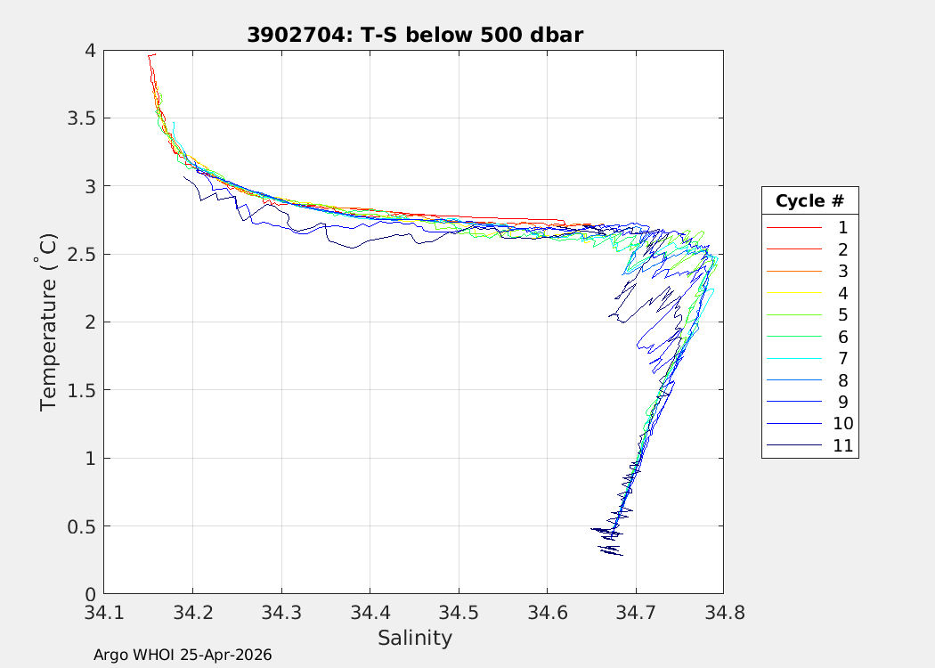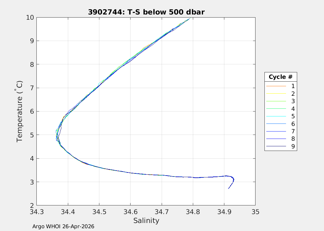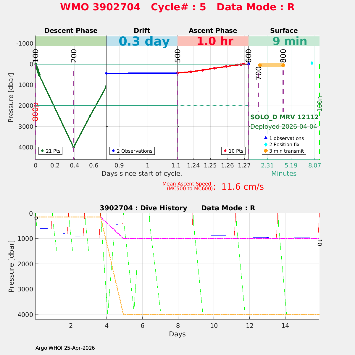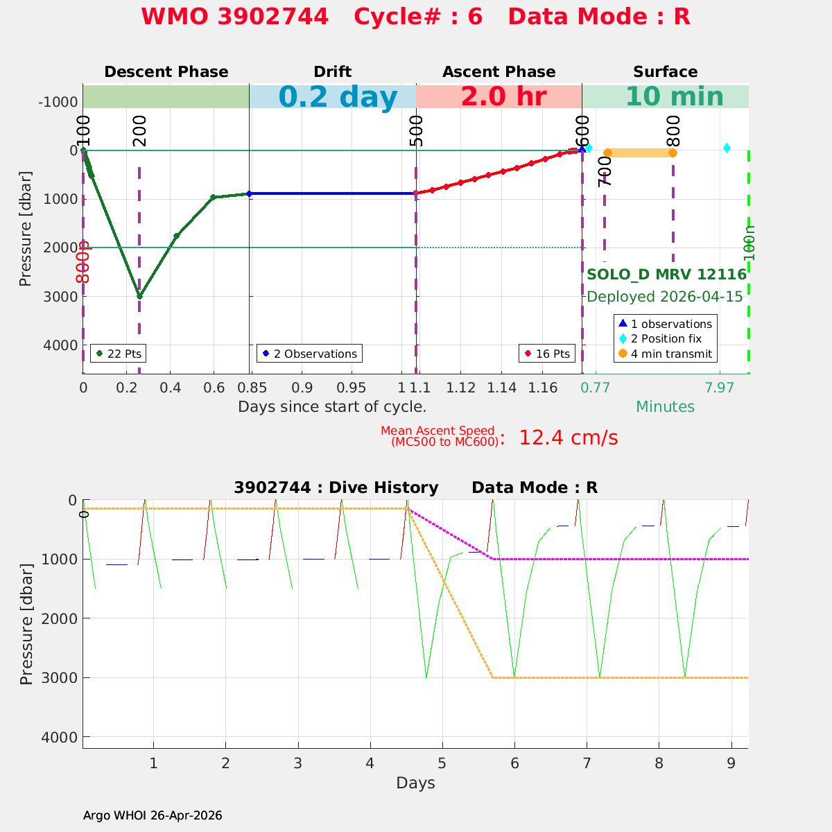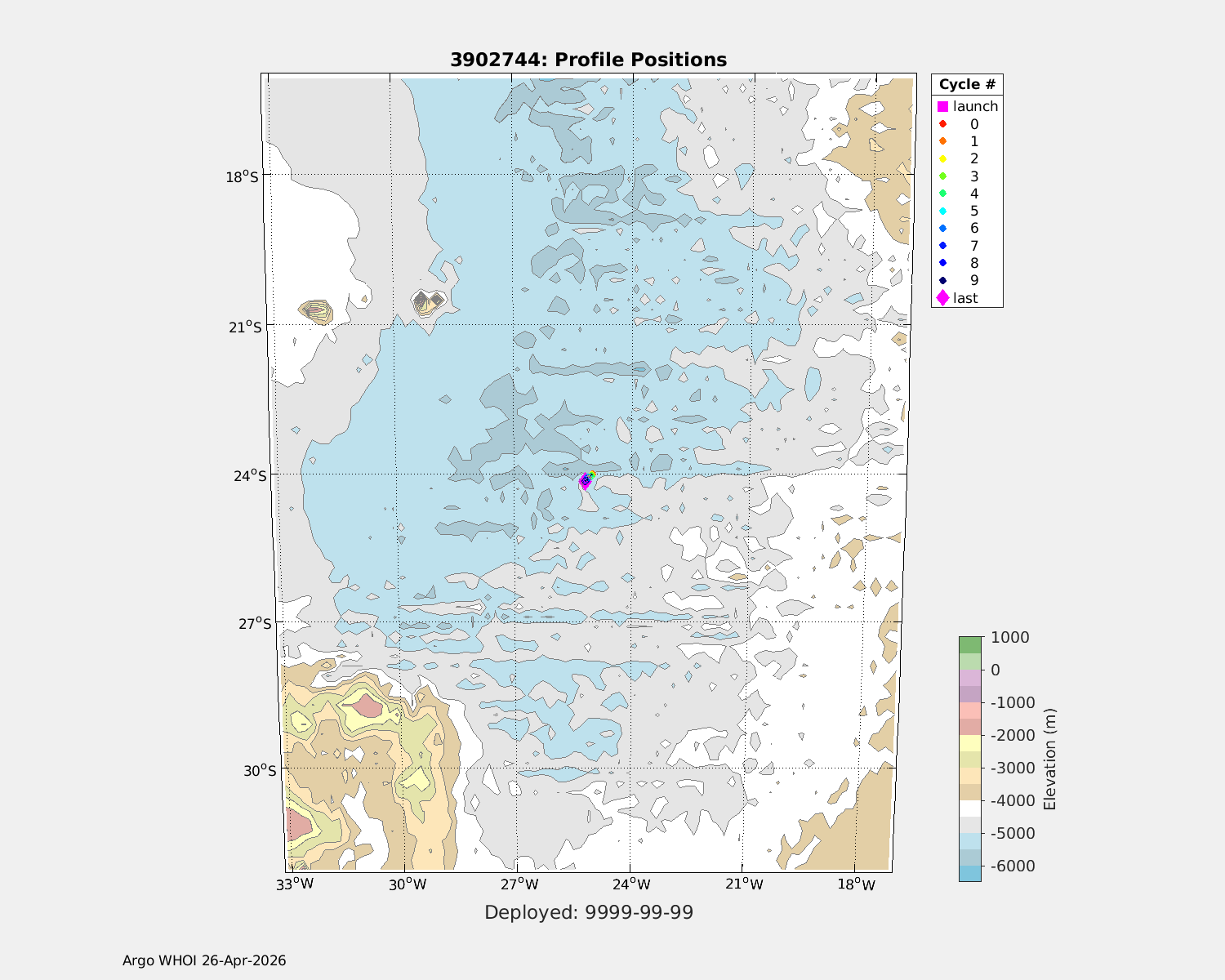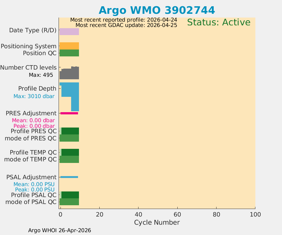 | WMO: #3902744 DAC: aoml PI: SUSAN WIJFFELS, STEVEN JAYNE, PELLE ROBBINS SOLO_D MRV: #12116 SBE61: #6170 KISTLER_10153PSIA: #6284346 Altimeter Comparison (IFREMER) EuroArgo Link | n/a | n/a | ![]() |