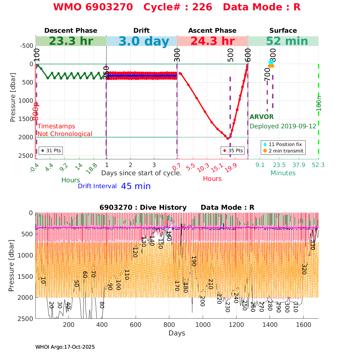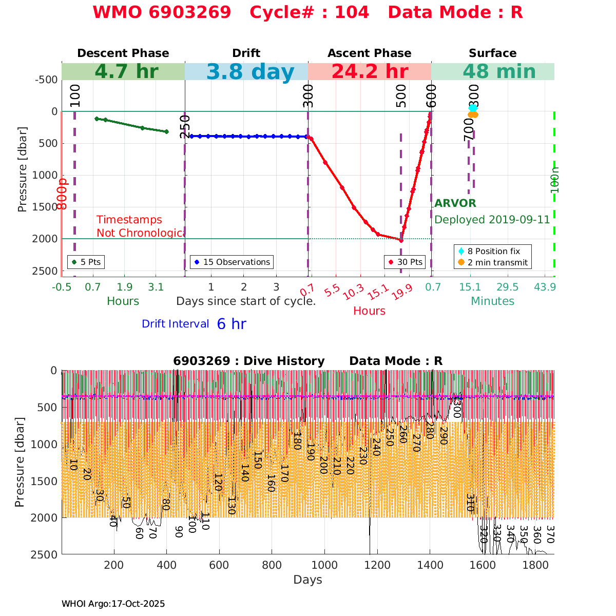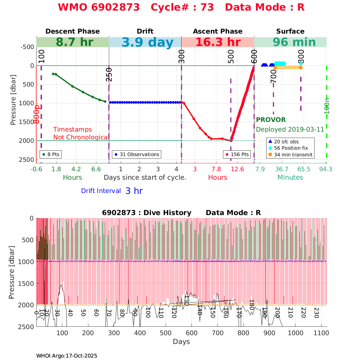 | WMO: #6902899 DAC: coriolis PI: Fabrizio D'ORTENZIO PROVOR_III: # KISTLER_2900PSIA: #2126860 SBE41CP: #5345 SATLANTIC_OCR504_ICSW: #40264 ECO_FLBBCD: #3112 Altimeter Comparison (IFREMER) EuroArgo Link | ![]() |